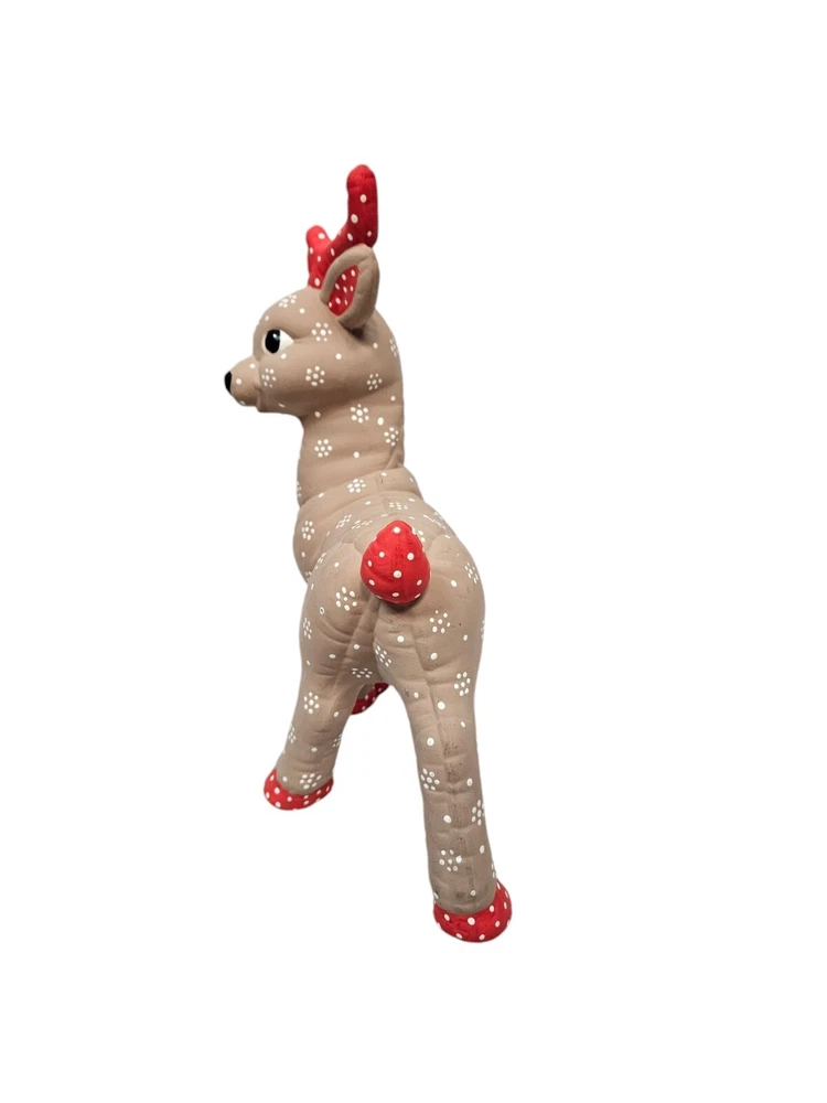 Vintage Kimple Mold Ceramic Hobbyist Reindeer Snowflake Hand Painted Set of 2 In excellent condition Vintage Kimple Mold Ceramic Hobbyist Reindeer Snowflake Hand Painted Set of 2. Features vintage 80s Kimple mold hobbyist hand painted reindeer set of 2, adorable snowflake painted reindeer by a careful DIY artist (unsigned), charming winter holiday decor, Christmas reindeer, unglazed ceramic. Measurements standing Reindeer height 11" length 11" depth 4" laying Reindeer height 8" length 8" depth 4" Fabric ceramic This is a pre-owned item that may show signs of wear. In excellent condition, no flaws. The reindeer laying down has a flaw on the paint - please see pictures for further details.