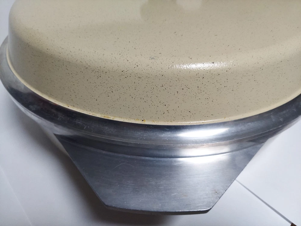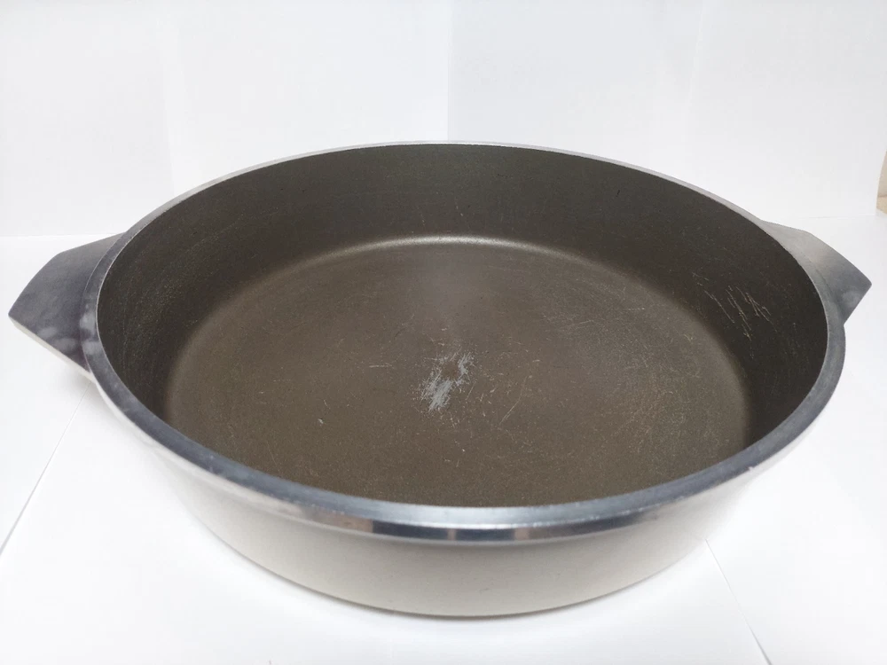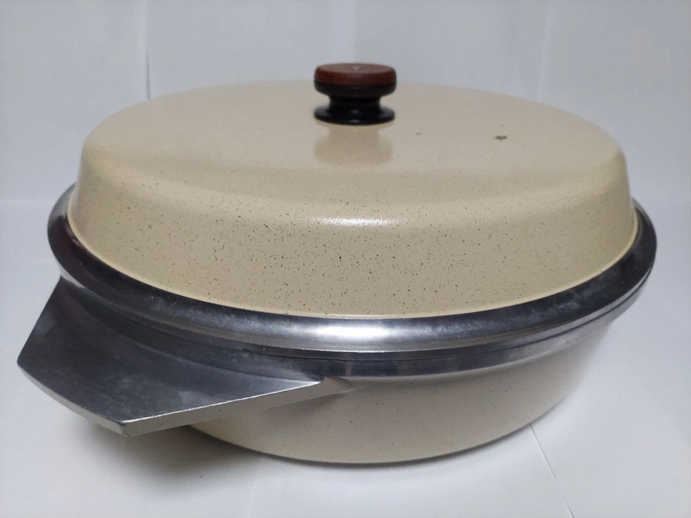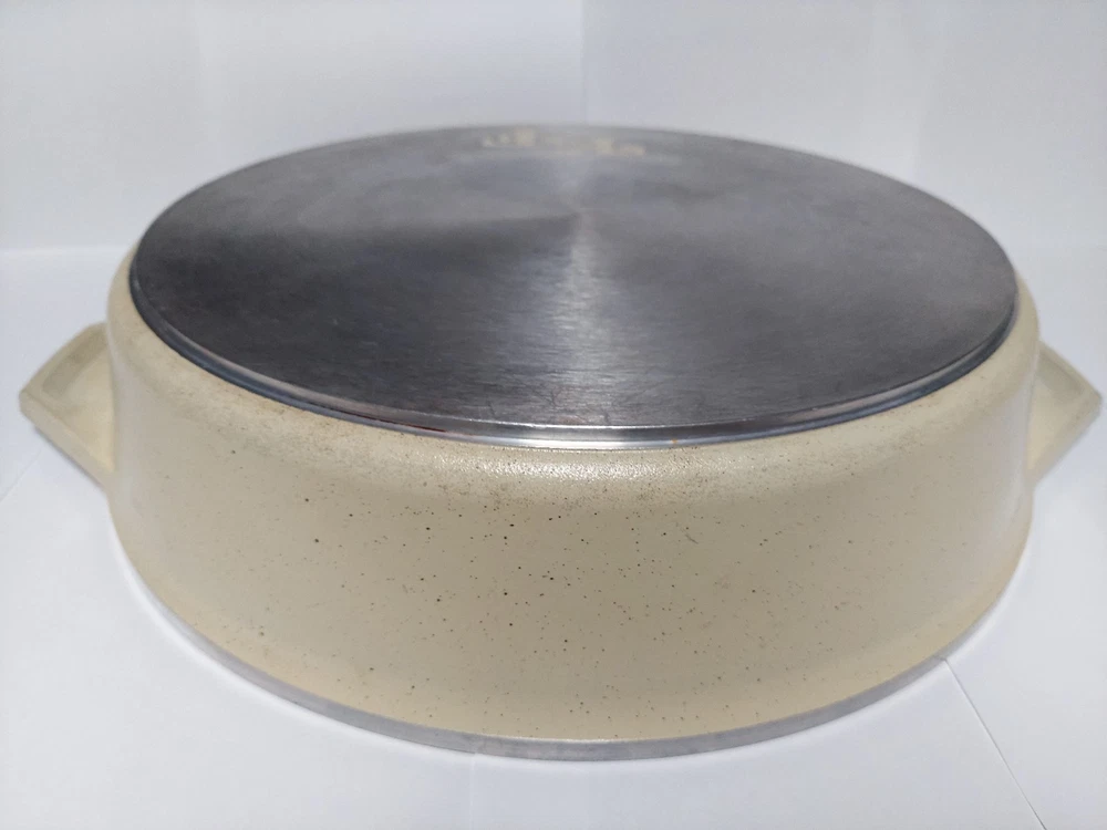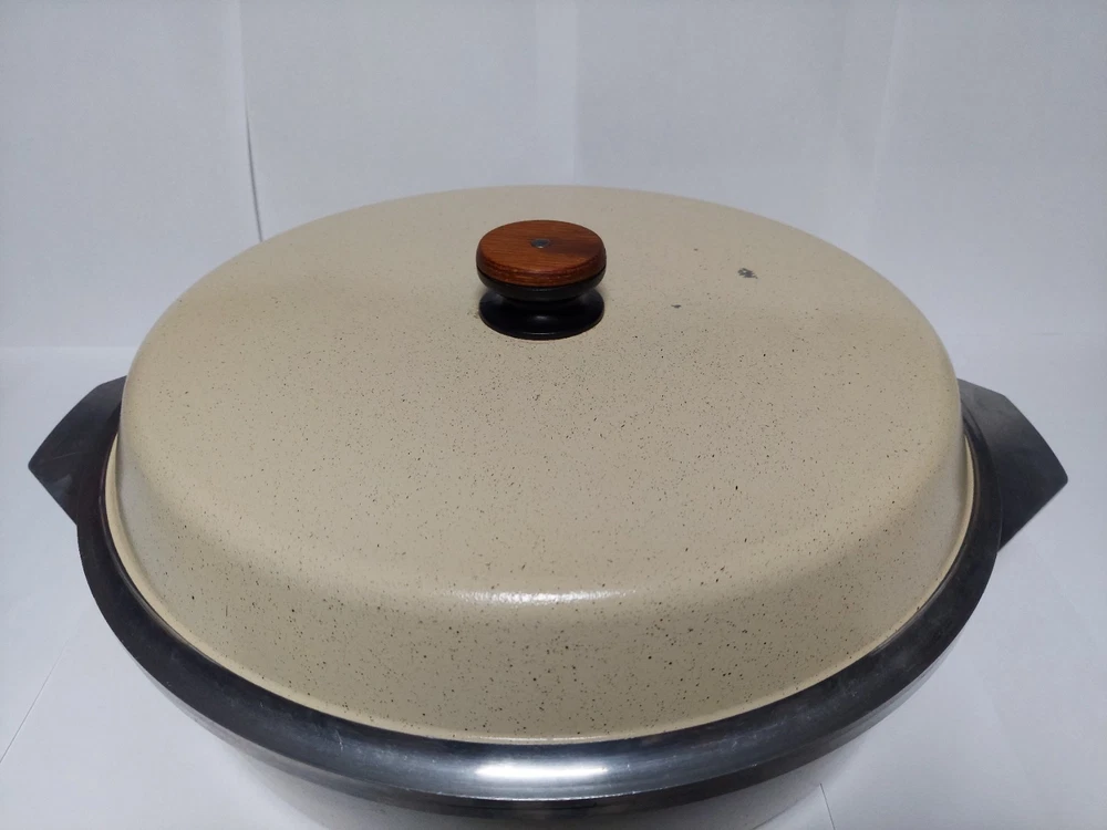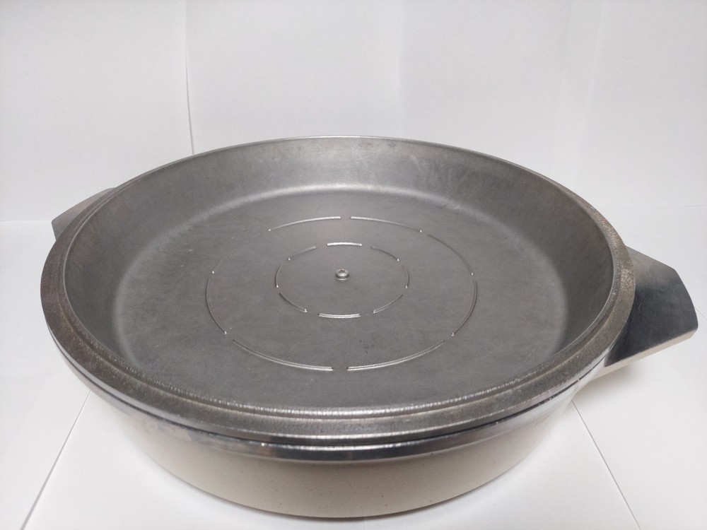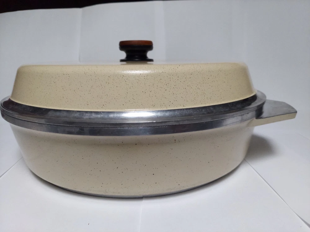 Will ship fast and protected. See photos for exact condition. Cleaned/sanitized and in good condition for its age. Chipping on the lid looks more like a manufacturer defect than damage from a ding because the enamel doesn't have jagged edges. The Kitchen Fair KF Cast Aluminum Double Handle Skillet is a vintage 14" yellow skillet with a lid, perfect for cooking on electric or gas stoves. This set includes a pot and lid, featuring a double handle design for easy transportation. Made of aluminum, this casserole pan/pot is an original piece from the brand KF, adding a unique touch to any kitchen collection.