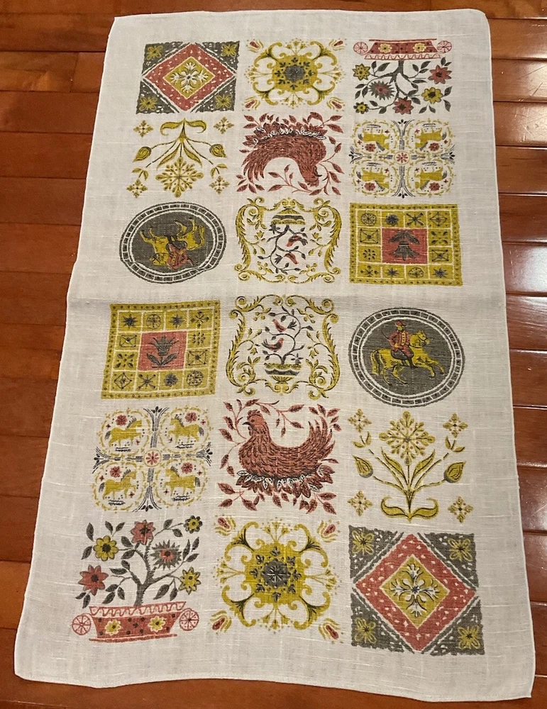 We have for sale a vintage linen kitchen tea towel. It measures approximately 28.5" x 17.5" and is in nice used condition. It features a design of horses, perching birds, chickens on their nests, flowers, and horses w/riders. This is from my mother Dorothy's (a Rosie the Riveter in WWII) collection. She was a fun, strong, and vibrant lady who had an eye for unique and beautiful items. Our hope is that these items find their way to people who will appreciate them as much as she did. Please look at all pictures and ask questions before purchase. Thank you!