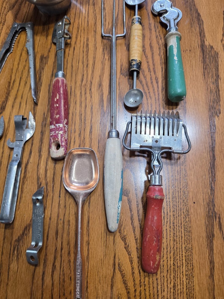 A vintage lot of 14 pcs. A variety of can openers, pasta cutter, melon baller, knife sharpener, canning funnel, nut cracker, tea infuser, sardine fork. Some of the paint is coming off of the wooden handles.