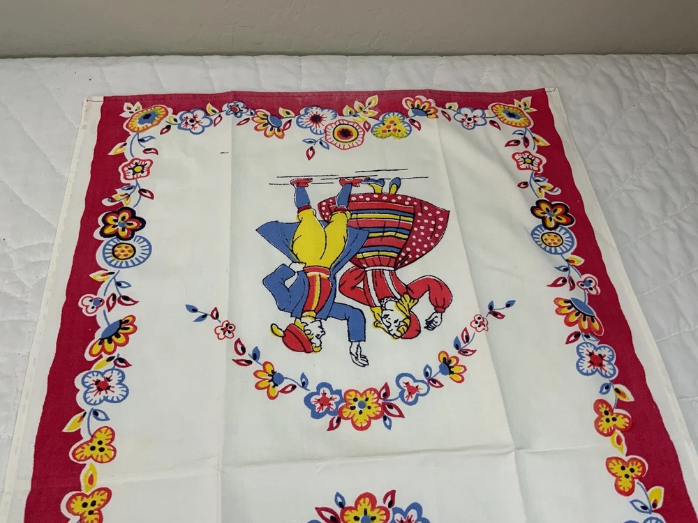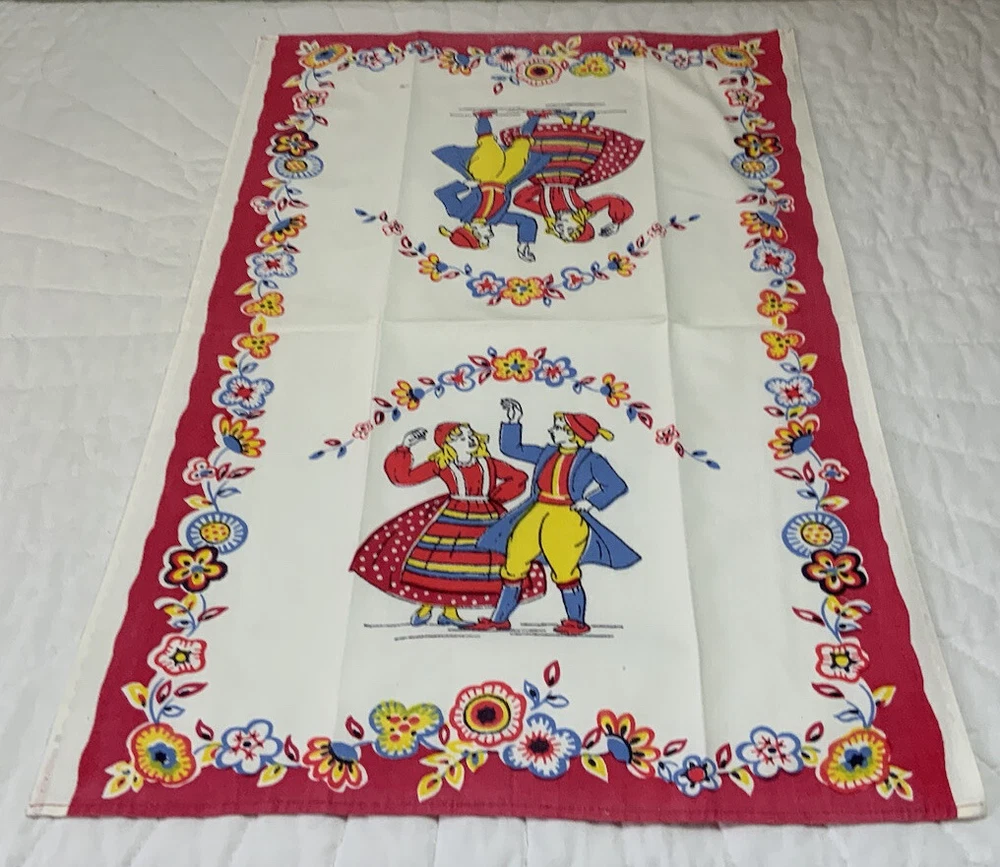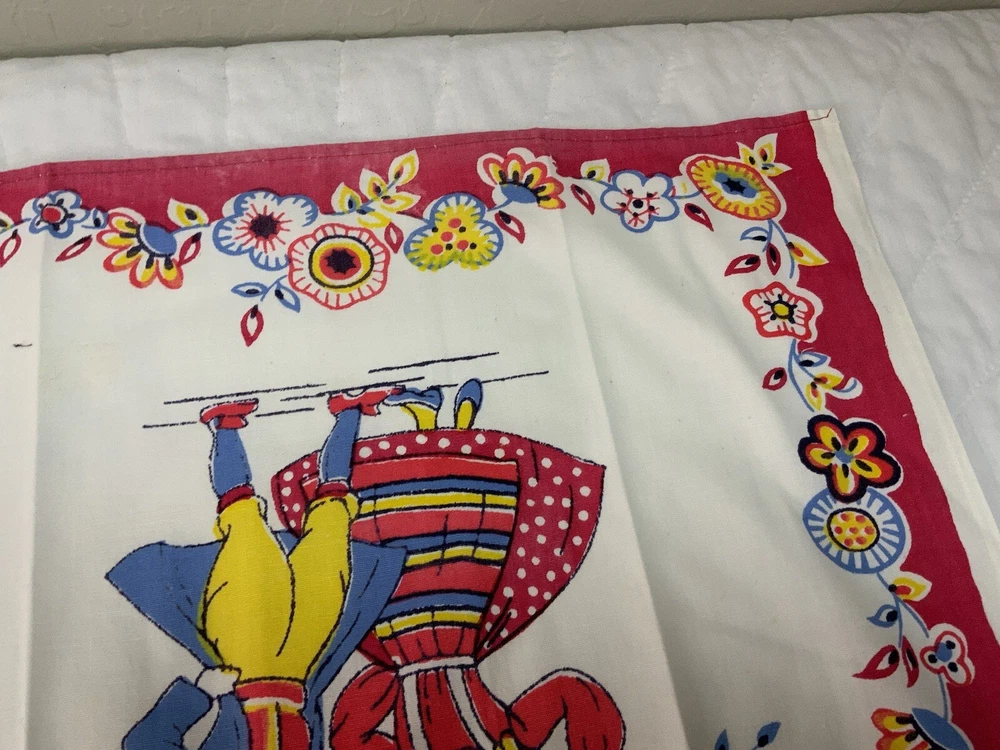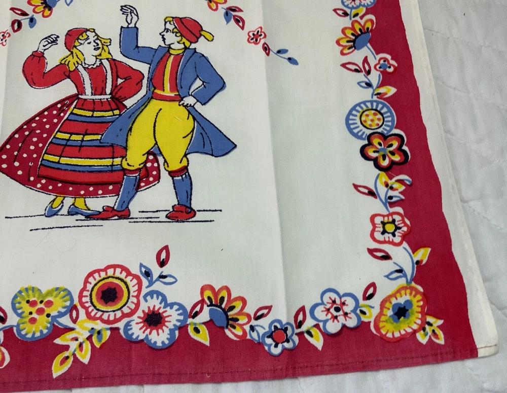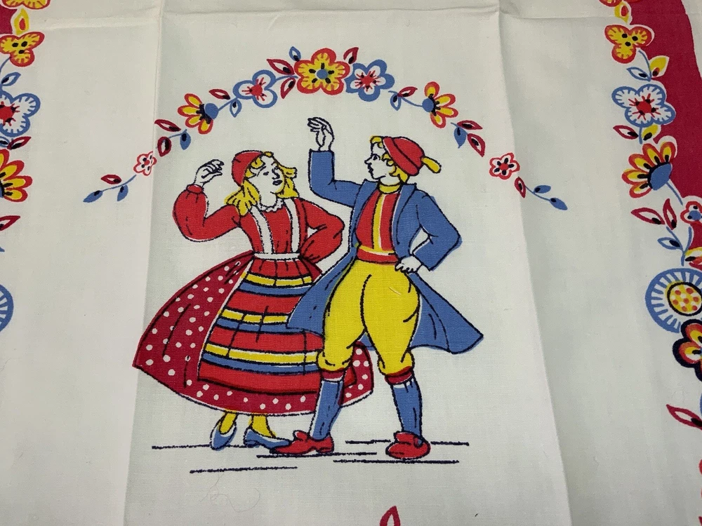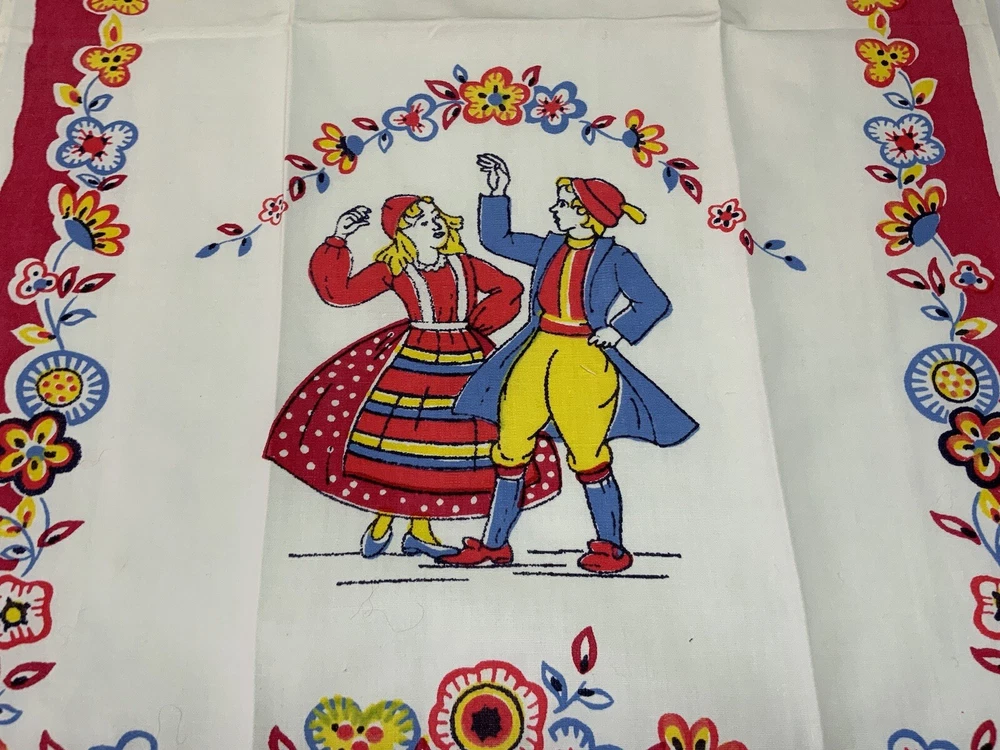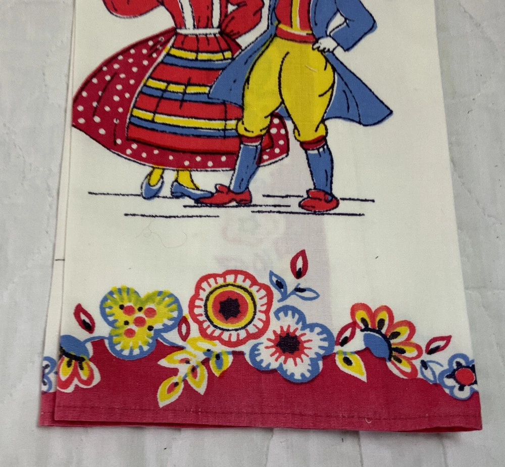 Up for sale is a vintage kitchen towel. The design is printed — European couple dancing, fancy outfits, apron, etc. with flowers. The colors are vivid — red, yellow, blue, black, white, multi. Machine sewn hems all around. Cotton. Measures 17” by 25”. Very, very good condition. Thank you and happy bidding. I will combine shipping charges. Smoke free home. Please make payment within three days. Please visit my eBay store: webbsamericancountry1 for over 2000 vintage and collectible items.