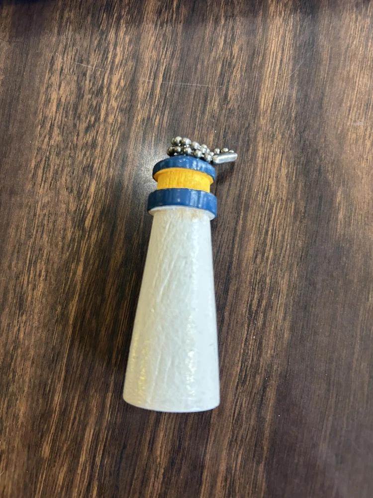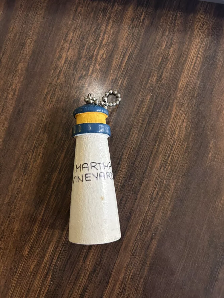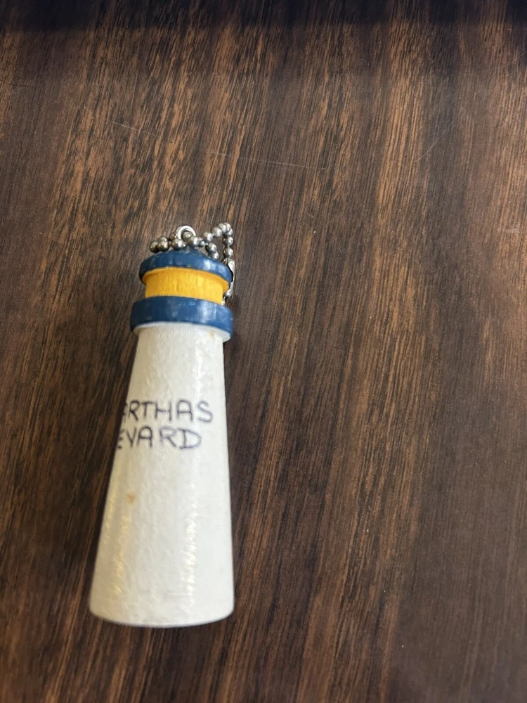 Great Vintage Kitschy MCM Keychain Martha’s Vineyard Wooden White Blue Yellow Lighthouse Cape Cod. Good pre owned condition, typical signs of wear