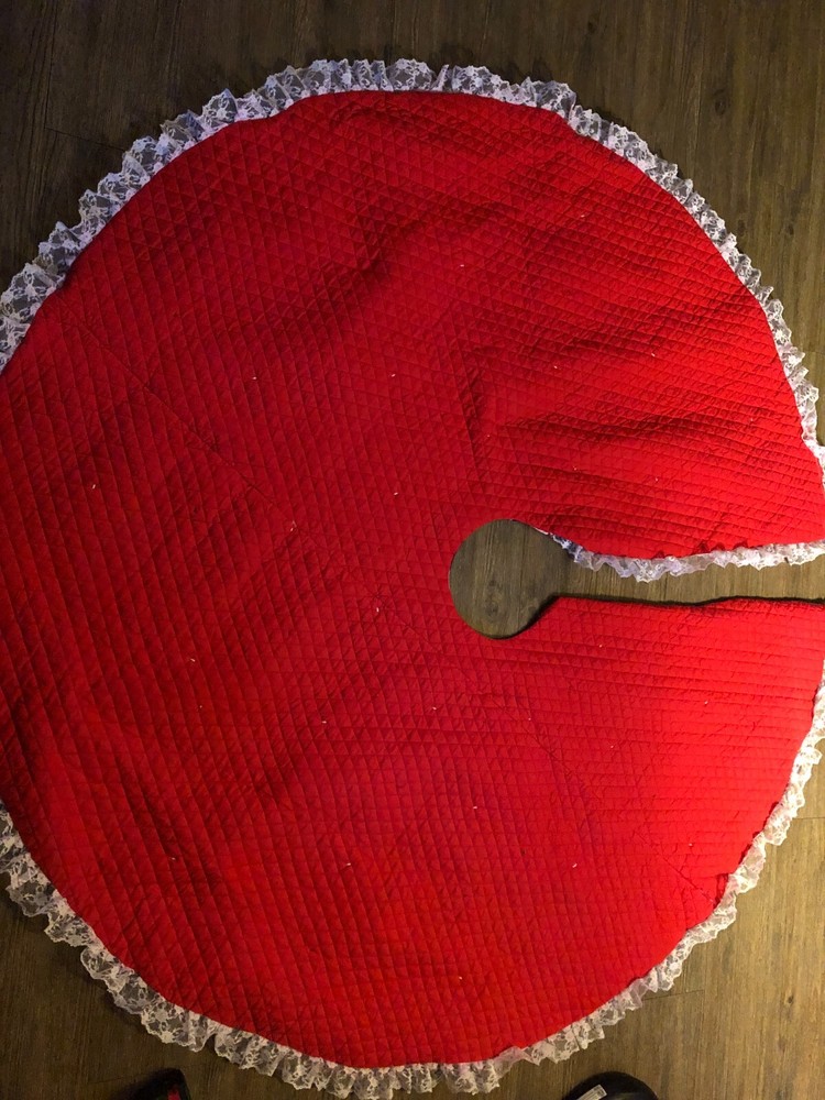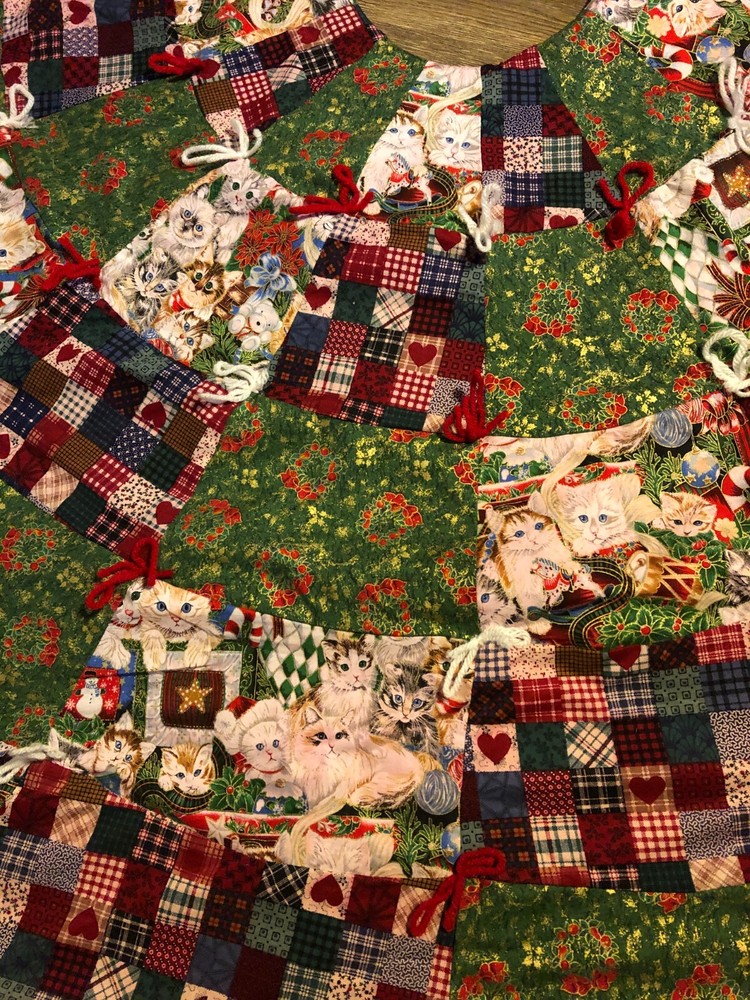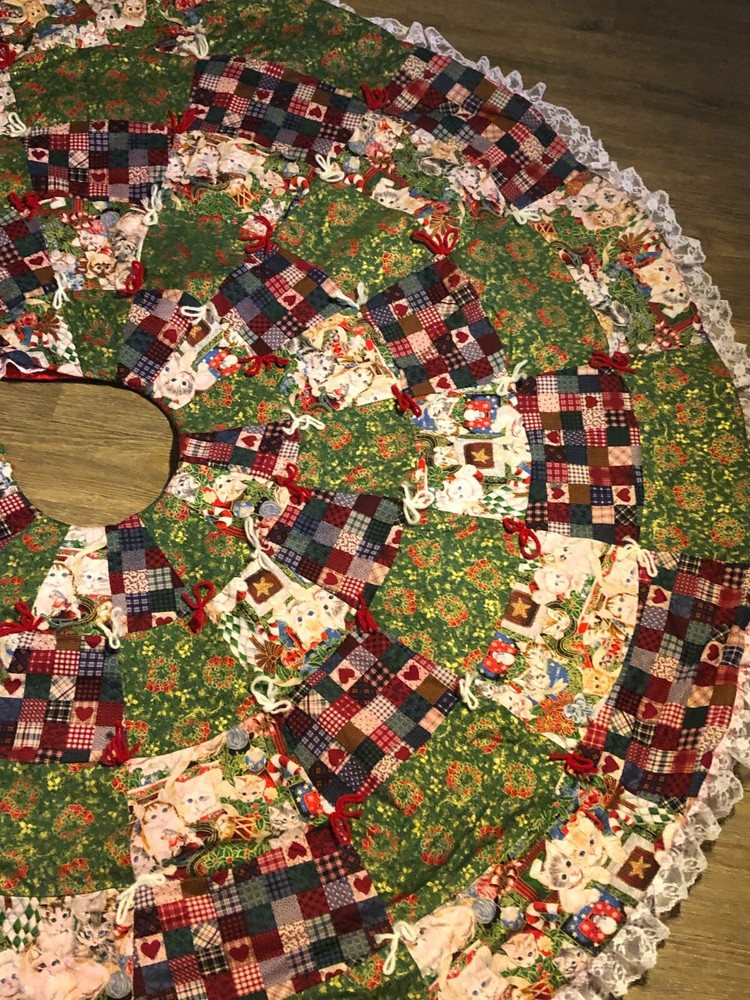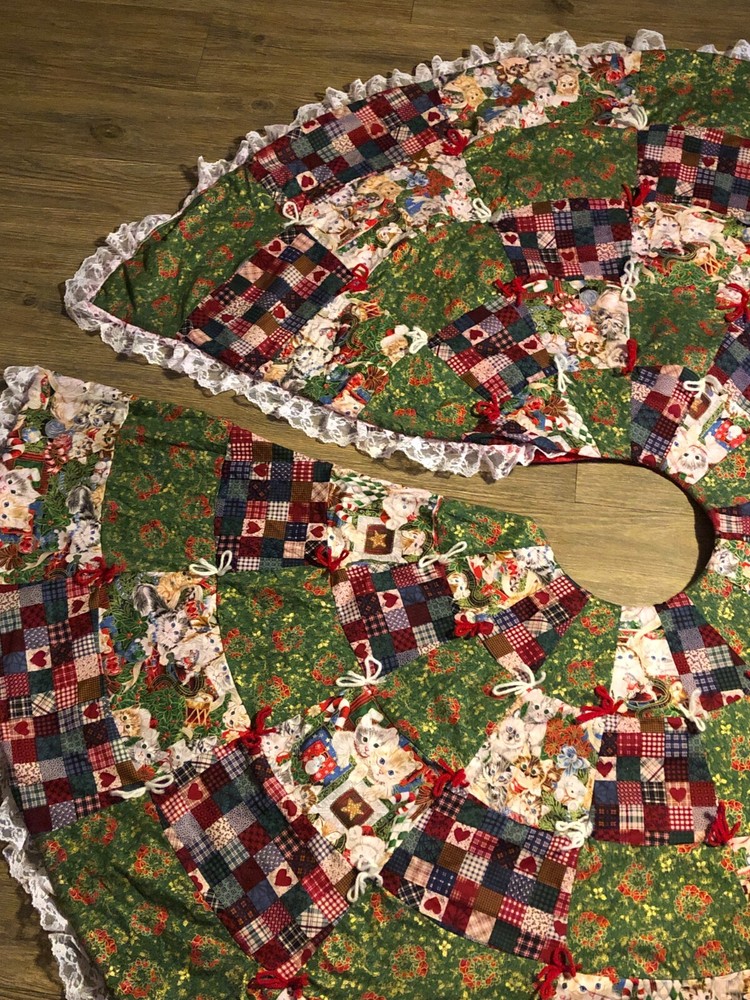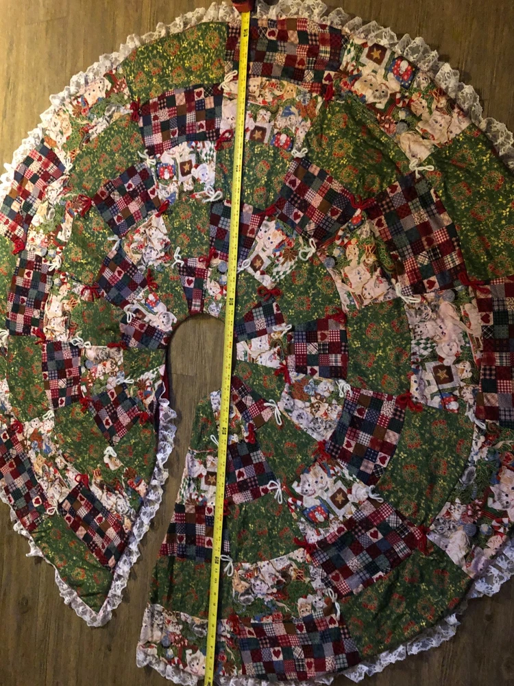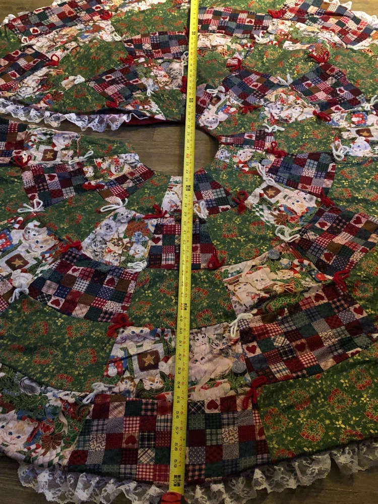 Measures about 60" across. Gorgous tree skirt full of kittens with lace on the outside. Excellent condition.