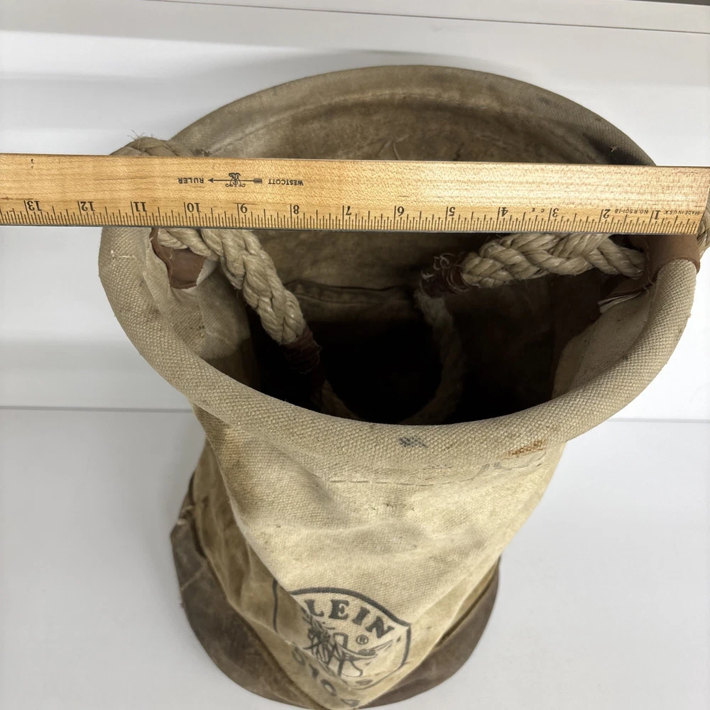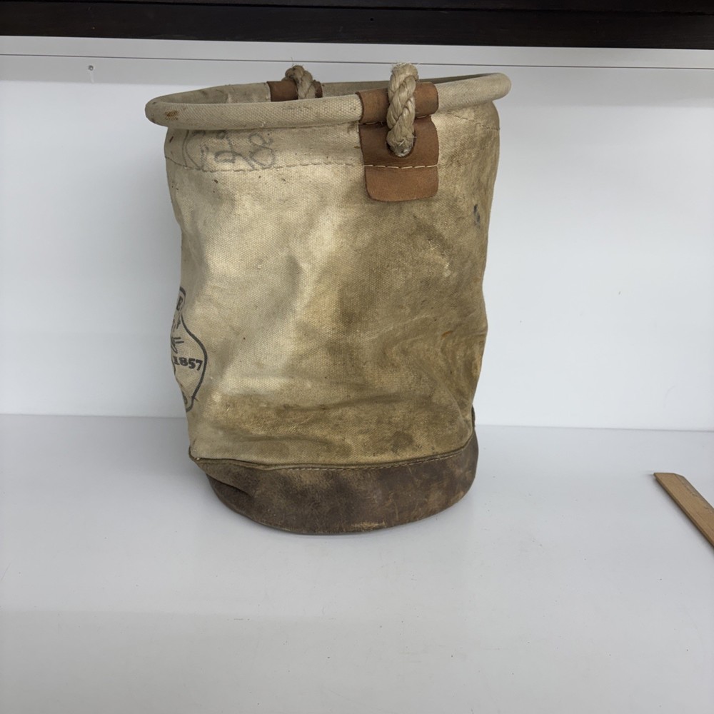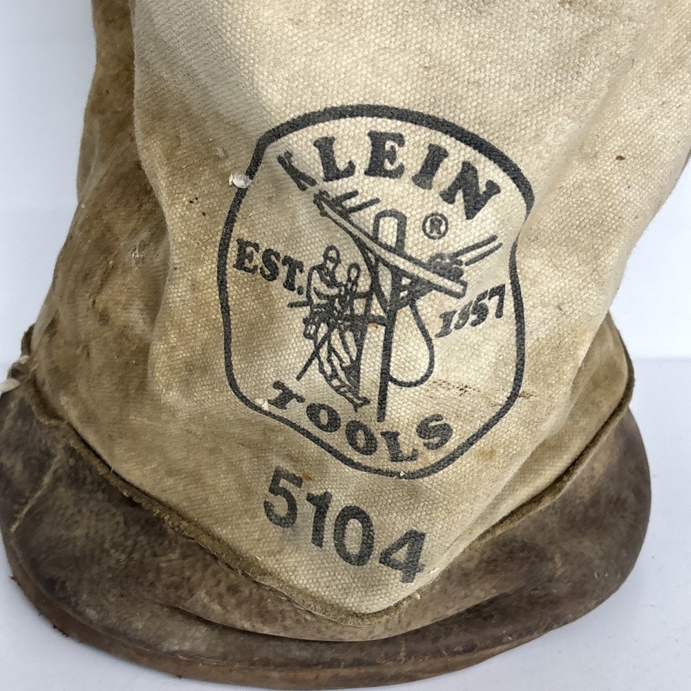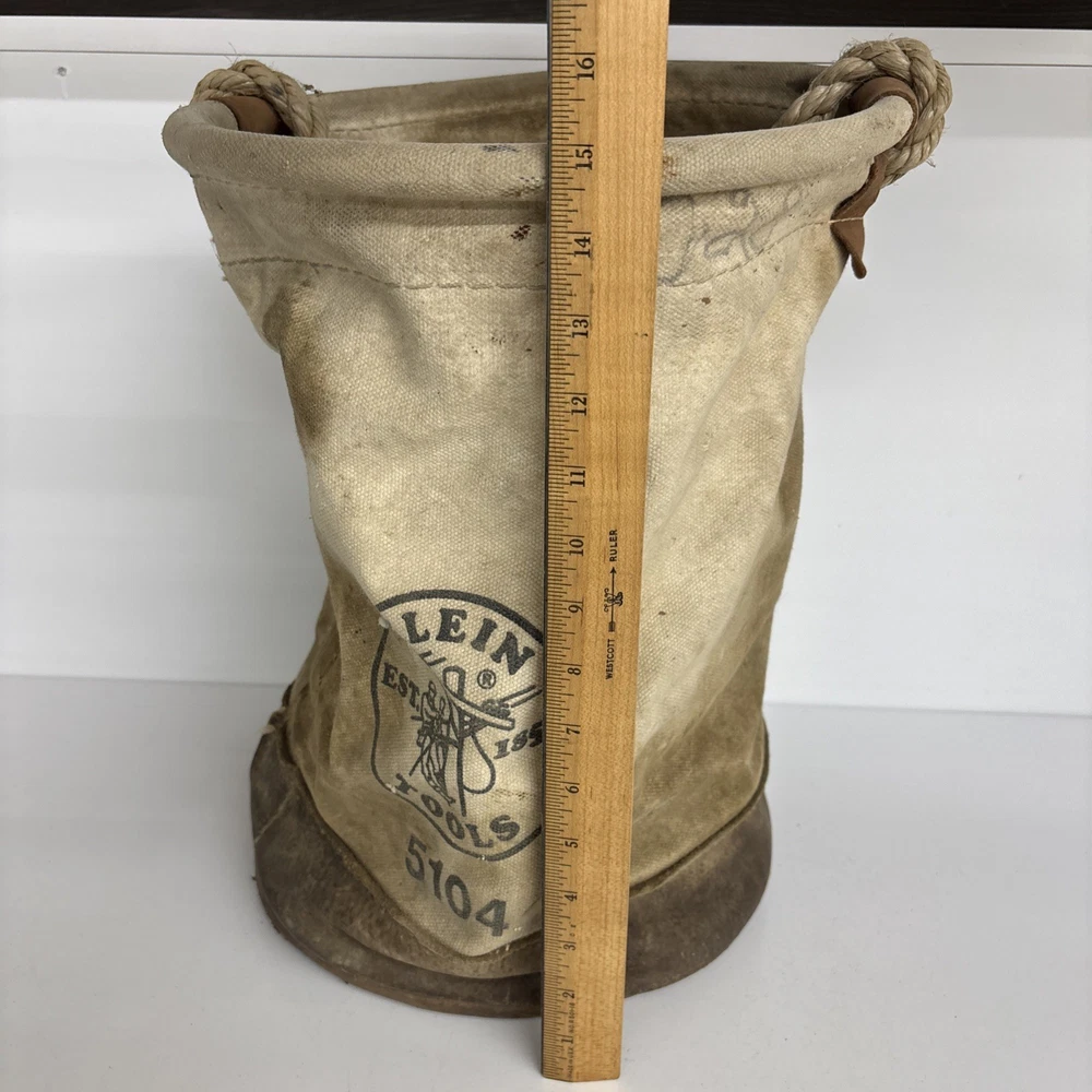 Vintage Klein Tools No. 5104 canvas and leather bucket. Heavy duty canvas body with reinforced leather bottom and rim. Features rope handle and classic Klein Tools logo with “Est. 1857” marking. Measures approximately 15 inches tall and 12 inches in diameter. Good vintage condition with wear, staining, and patina from use. Leather base shows age and use wear. Canvas has marks and discoloration consistent with job site use. See photos for complete details and condition.