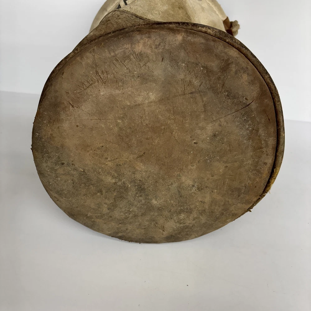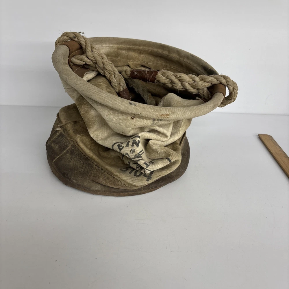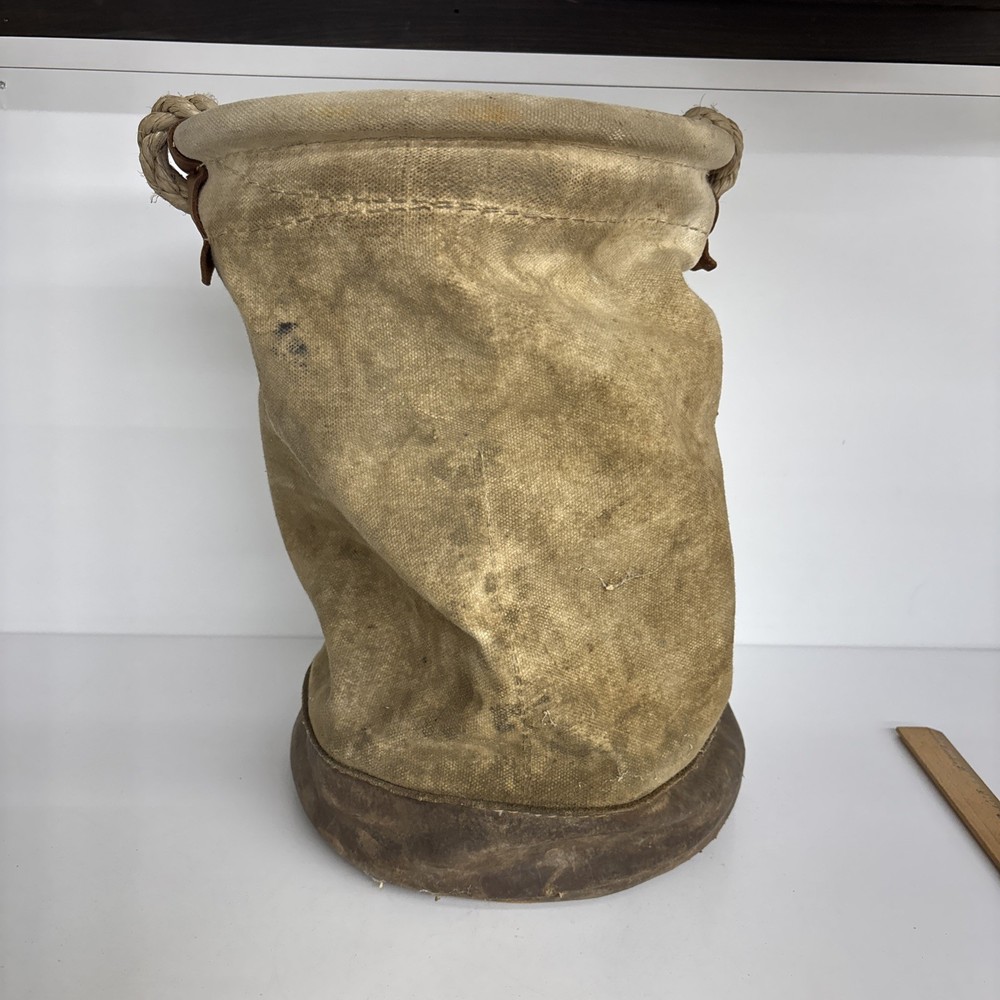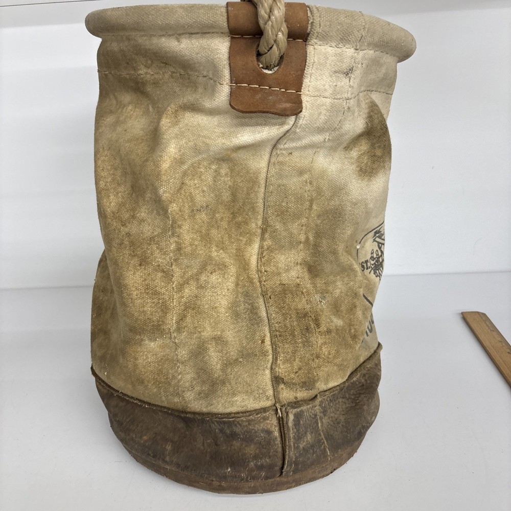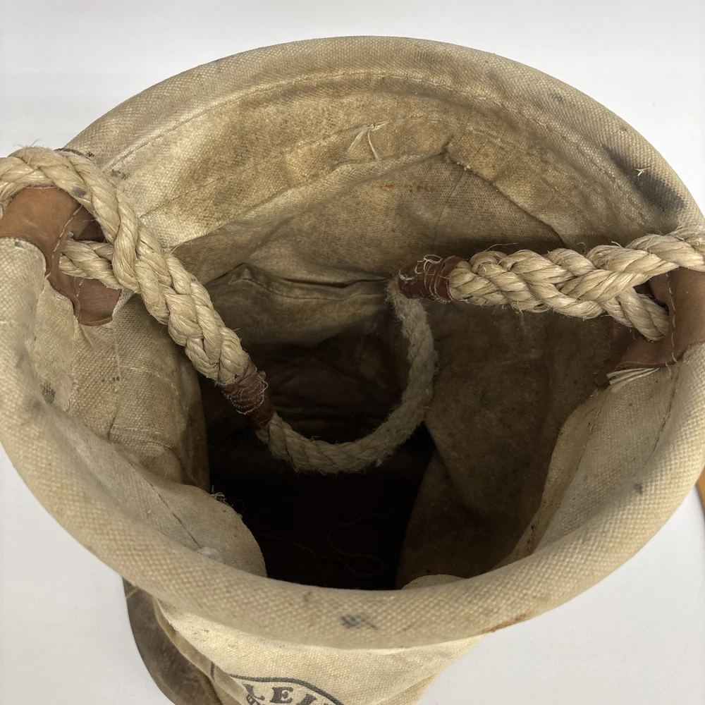 Vintage Klein Tools No. 5104 canvas and leather bucket. Heavy duty canvas body with reinforced leather bottom and rim. Features rope handle and classic Klein Tools logo with “Est. 1857” marking. Measures approximately 15 inches tall and 12 inches in diameter. Good vintage condition with wear, staining, and patina from use. Leather base shows age and use wear. Canvas has marks and discoloration consistent with job site use. See photos for complete details and condition.