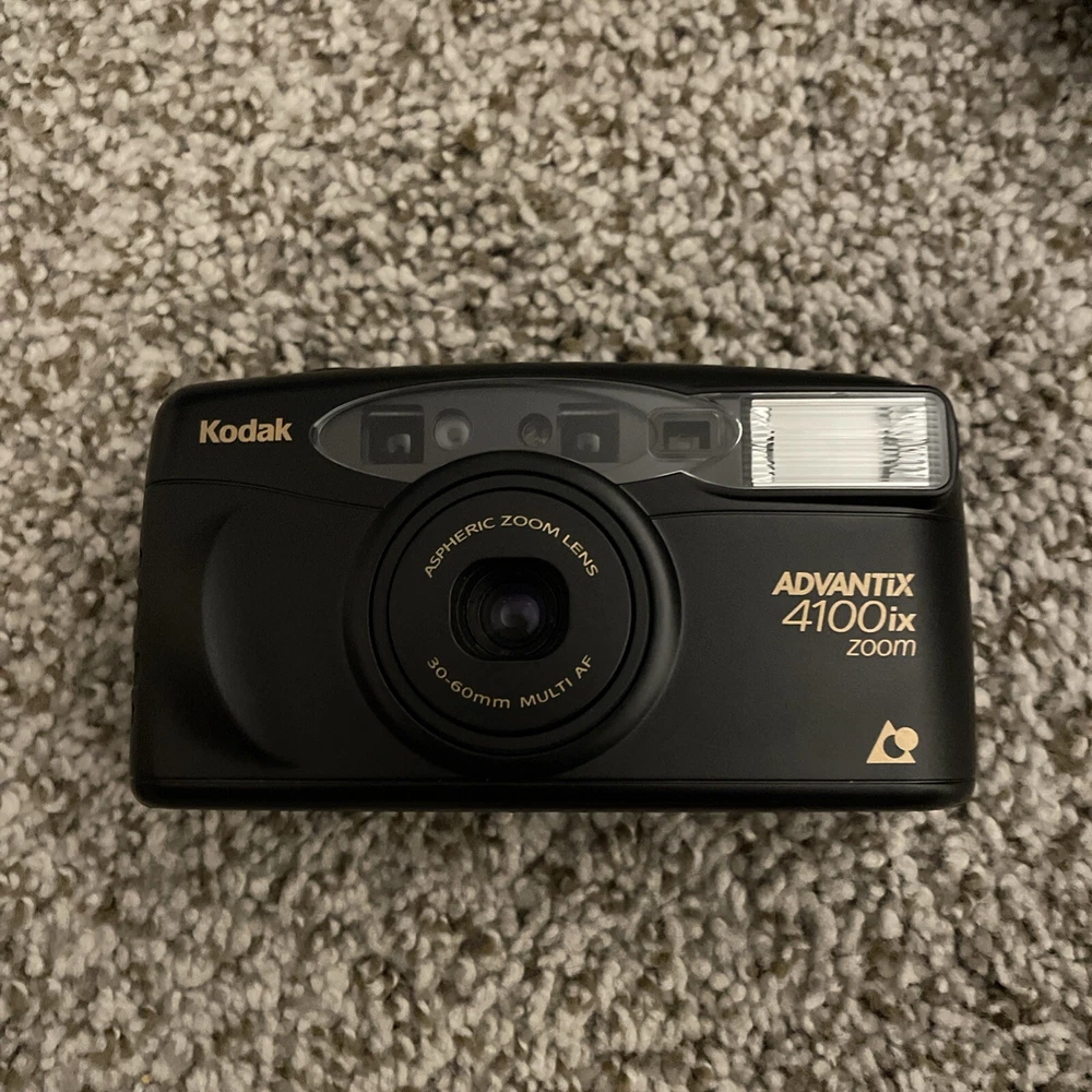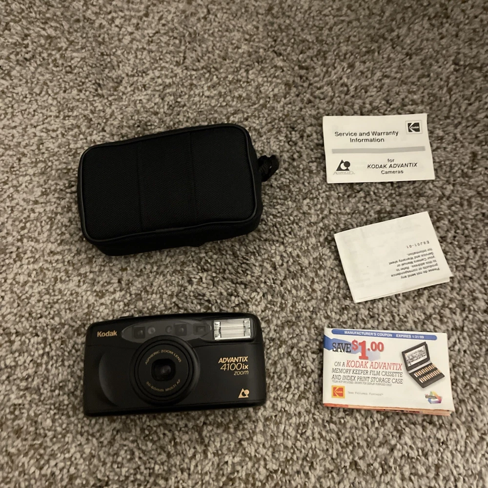 Capture the essence of retro photography with the Vintage Kodak Advantix 4100ix Zoom 35mm Point & Shoot Film Camera. This classic camera, boasting a sleek black design, takes you back to the roots of film photography. Made in Indonesia, the Advantix 4100ix model is a testament to Kodak's enduring legacy in the world of imaging. Ideal for enthusiasts and collectors alike, this camera has been tested to ensure it's in working order, ready to roll film and immortalize your moments in time. Whether you're looking to add to your vintage camera collection or delve into the nostalgic world of 35mm film, this Kodak gem is a perfect choice. Pouch is missing zipper.