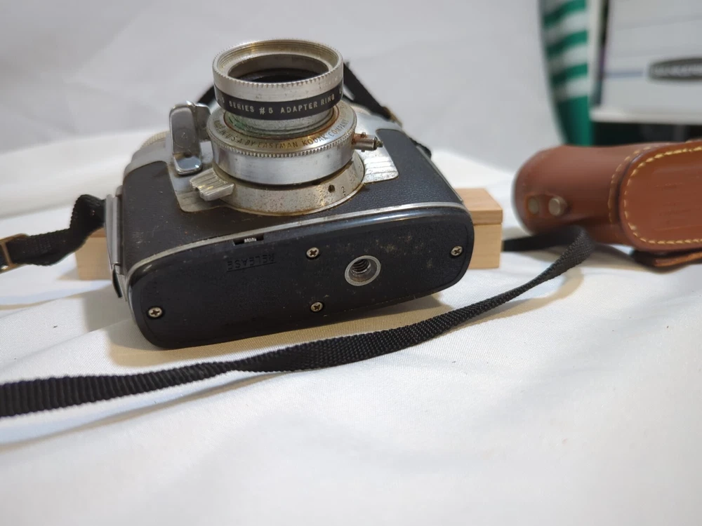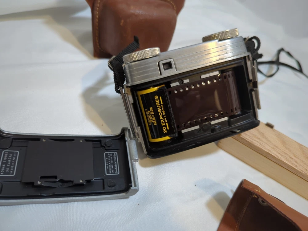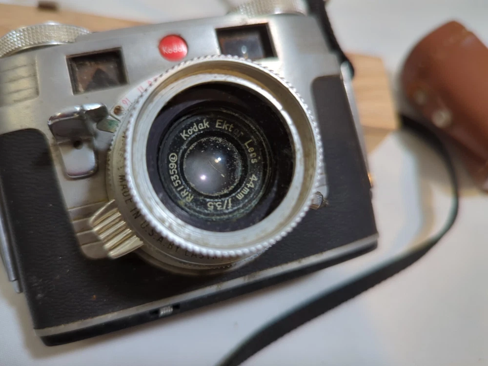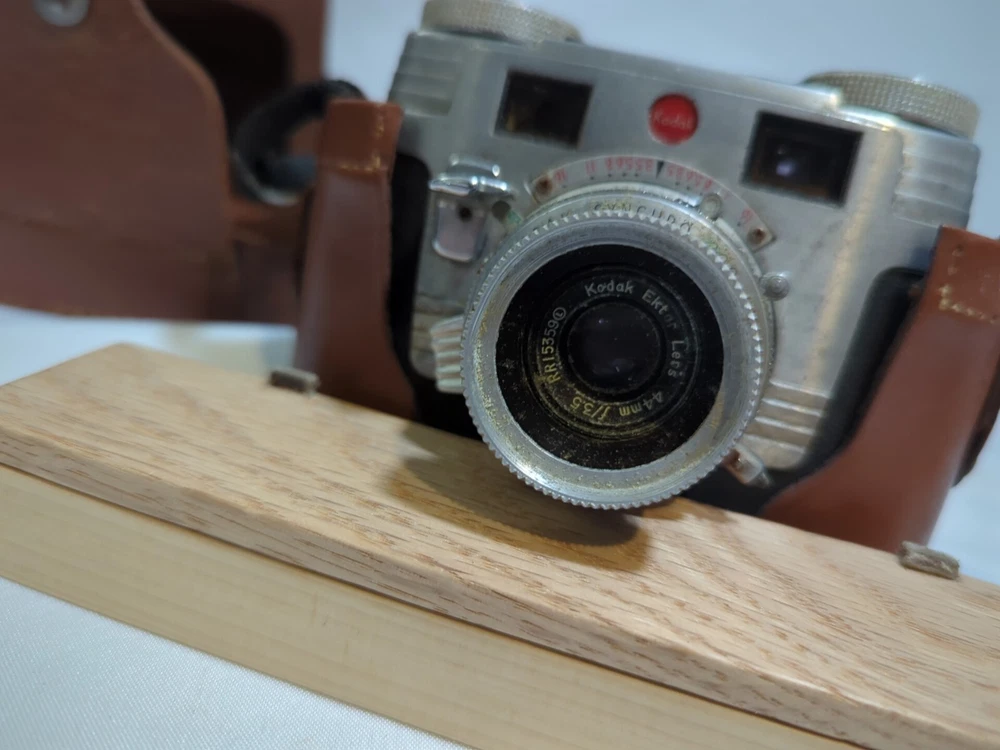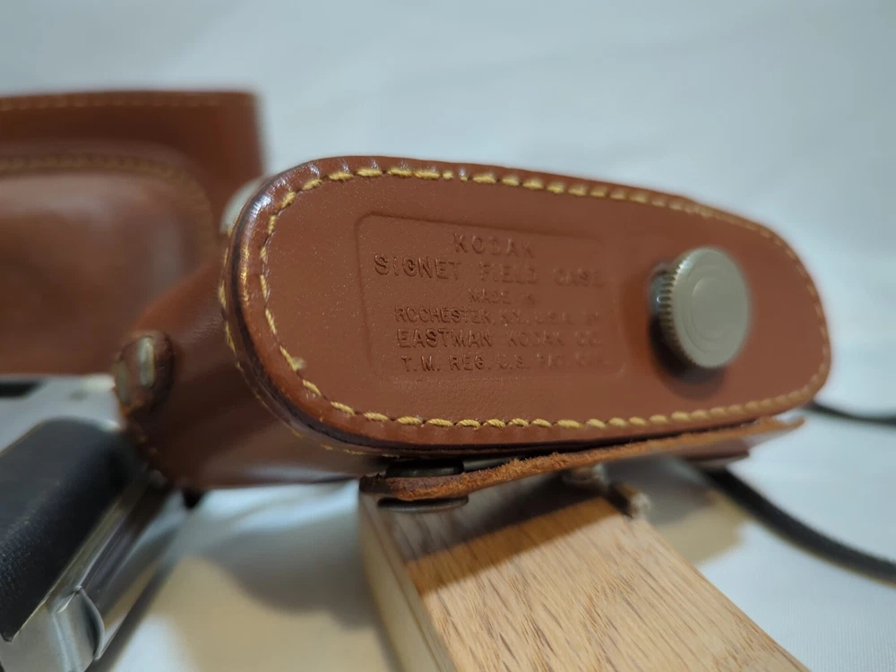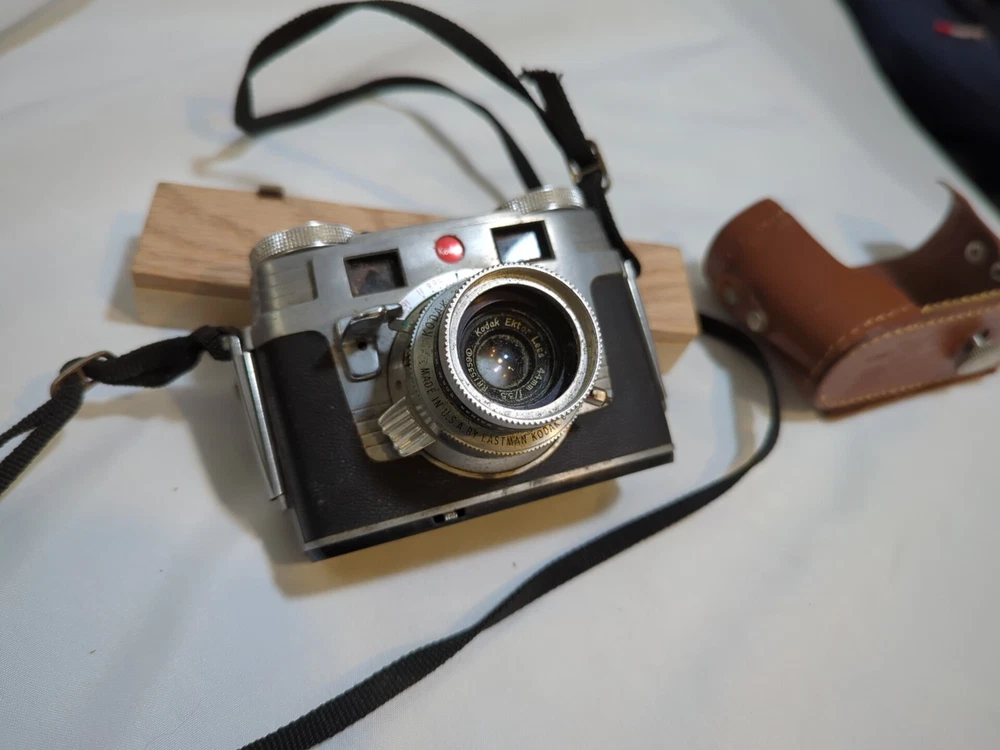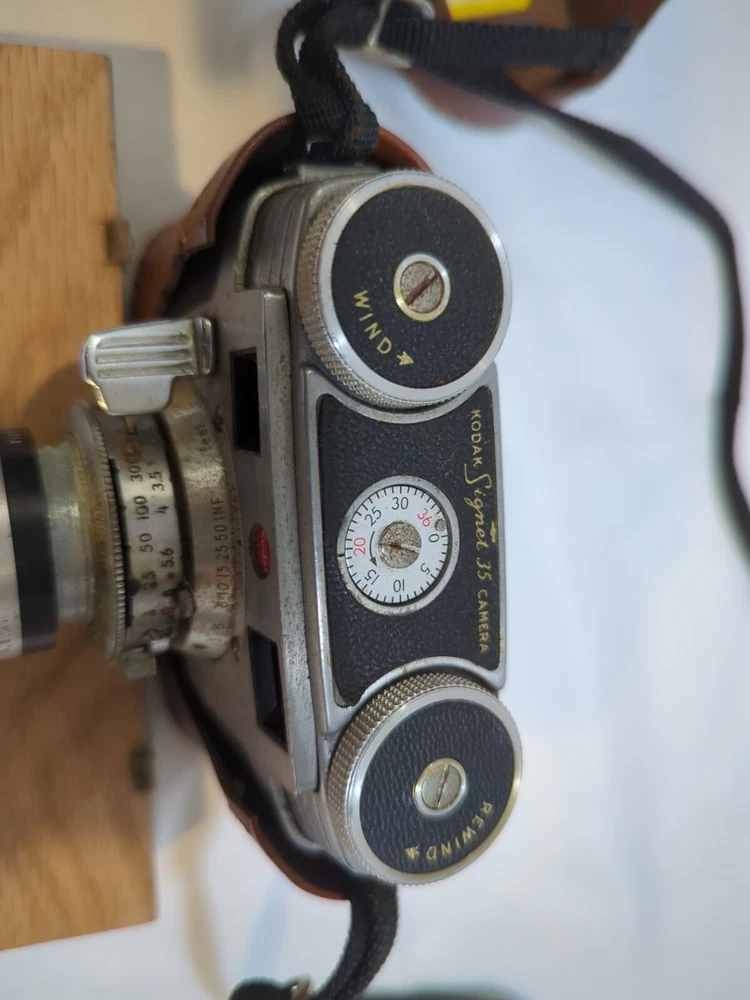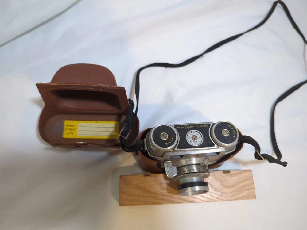 Capture timeless memories with this vintage Kodak Signet 35 film camera. Made in the United States, this classic piece of photography equipment features a sleek silver design and comes with a matching case for safekeeping. The camera is perfect for those looking to add to their vintage camera collection or those who simply appreciate the beauty of film photography. With its iconic Kodak brand and Signet 35 model, this camera is sure to impress any photography enthusiast. Its 35mm capabilities allow for stunning image capture and its vintage charm makes it a unique addition to any collection. Don't miss out on the opportunity to own this piece of photographic history.