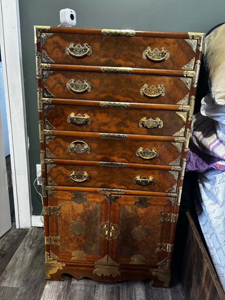 Vintage Korean Elm Burl Brass Bound Bandaji Scholars Chest Wedding Cabinet Felt