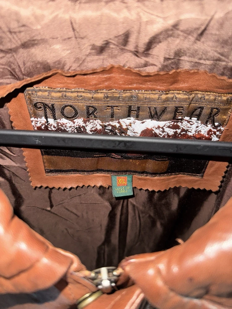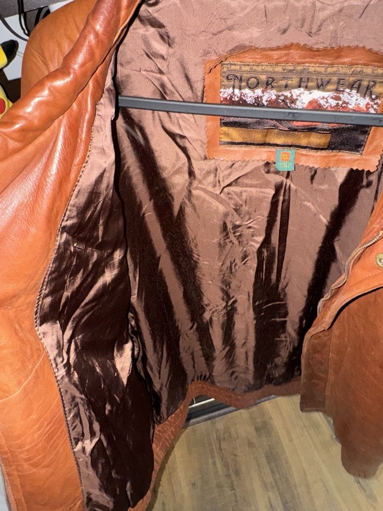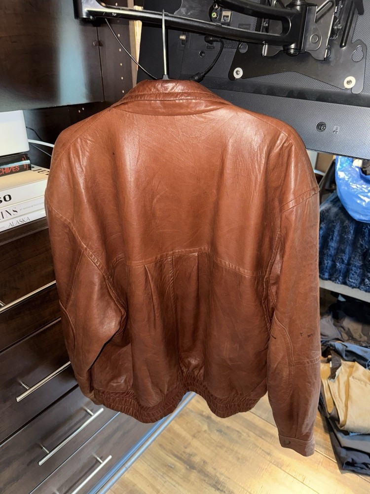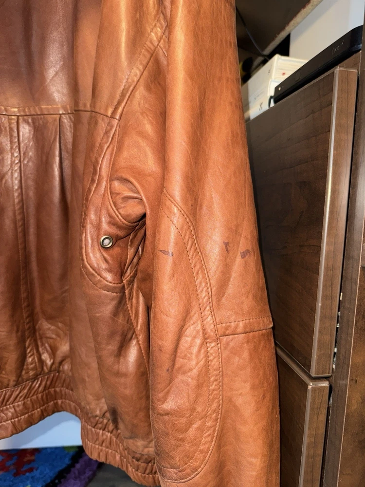 Rare find. Genuine leather. Fairly worn. Visible wear and tear. Visible stains. Elbow pads on sleeves! Please review photos before purchasing. Item is sold as is.