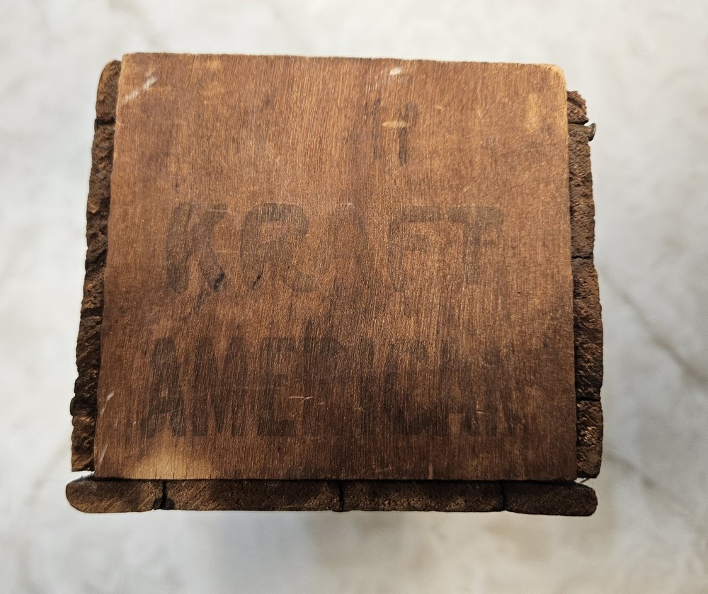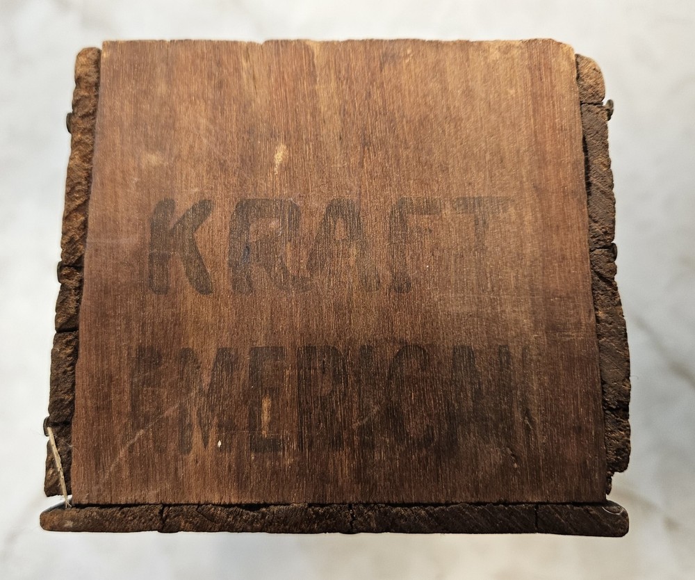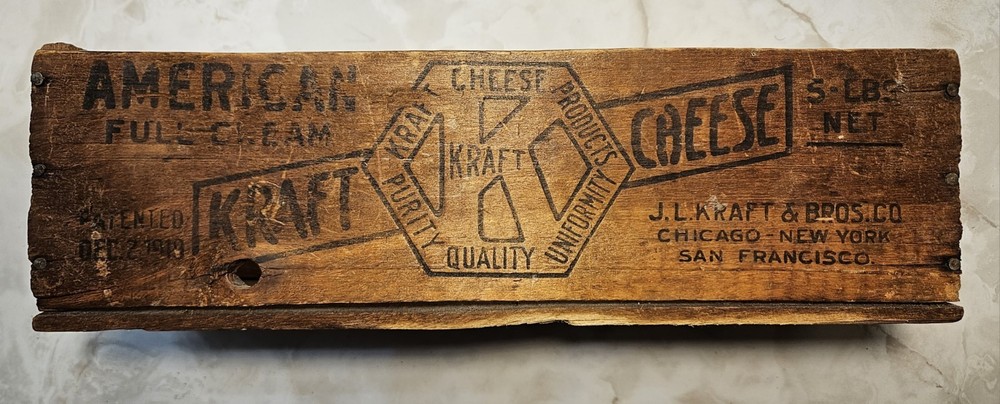 Item Description: Original vintage Kraft American Cheese wooden crate from the early 20th century, marked J.L. Kraft & Bros. Co. – Chicago, New York, San Francisco . Features branding on both sides including "American Full Cream Cheese" and "5 LBS Net" with the hexagonal Kraft logo. Dimensions: 12" L x 4" W x 3.5" H Dated with Patent Dec 2, 1916 Shows age-appropriate wear, dark staining, and one hole on the front panel All original wood and nails; finger-jointed corners Great for farmhouse, rustic, or industrial decor Perfect for display, storage, or repurposing Please review all photos for condition. A fantastic piece of Kraft history!