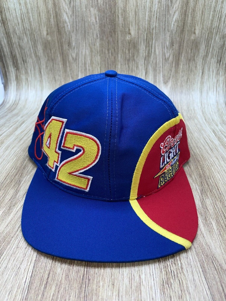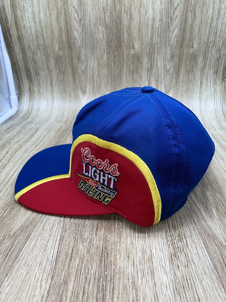 Get your hands on this vintage Coors Light snapback hat featuring Kyle Petty, a famous Nascar racing character. The blue color and adjustable size make it a perfect addition to your collection. This snapback hat is perfect for any occasion, whether you're traveling, going to a party, or just chilling casually. The 90s racing and hipster theme of this hat make it a unique and must-have item for sports enthusiasts. The snapback feature ensures a comfortable fit for all head sizes. This preowned hat is a great buy for fans of Nascar and vintage clothing.