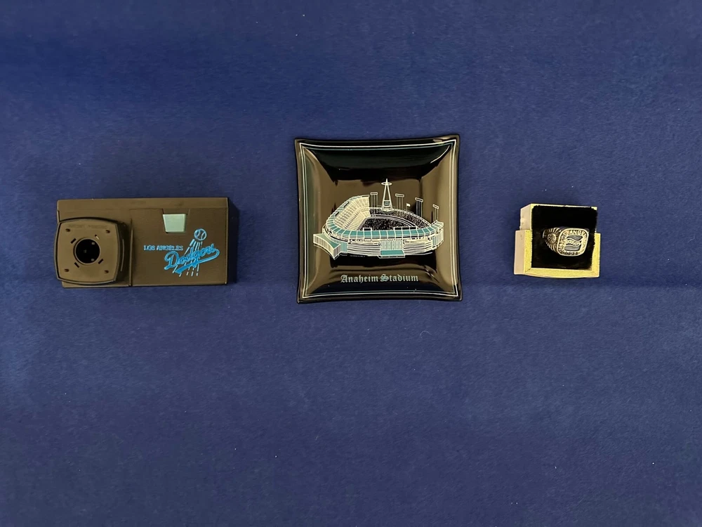 Vintage L.A. Dodgers & CA Angels memorabilia from the 1960's -- These items were probably game-night giveaways. Item #1 - Adjustable Dodgers memorabilia ring. Item #2 - Dodgers 110 camera - manufactured by Lure Camera, LTD. There is no way to remove the film or to reload the camera with new film (if you could find the film). We suspect this camera would have had to be mailed somewhere in order to get the pictures developed. Item #3 - Is a 3 1/2" x 3 1/2" memorabilia dish (or ashtray ??) from the Anaheim Stadium grand opening on April 23, 1966. See the picture of the back of the dish for more detailed information.