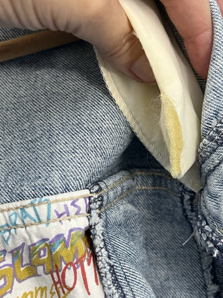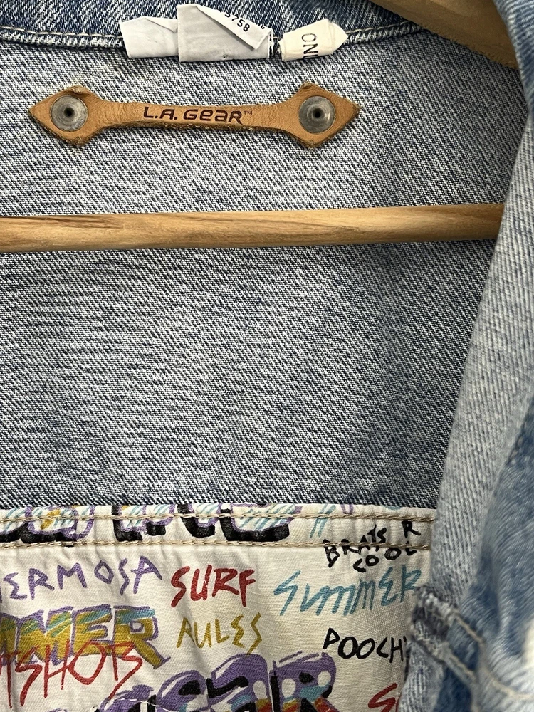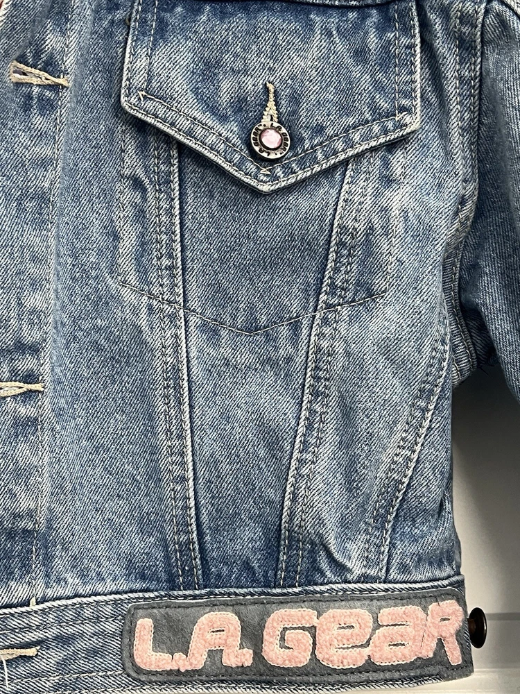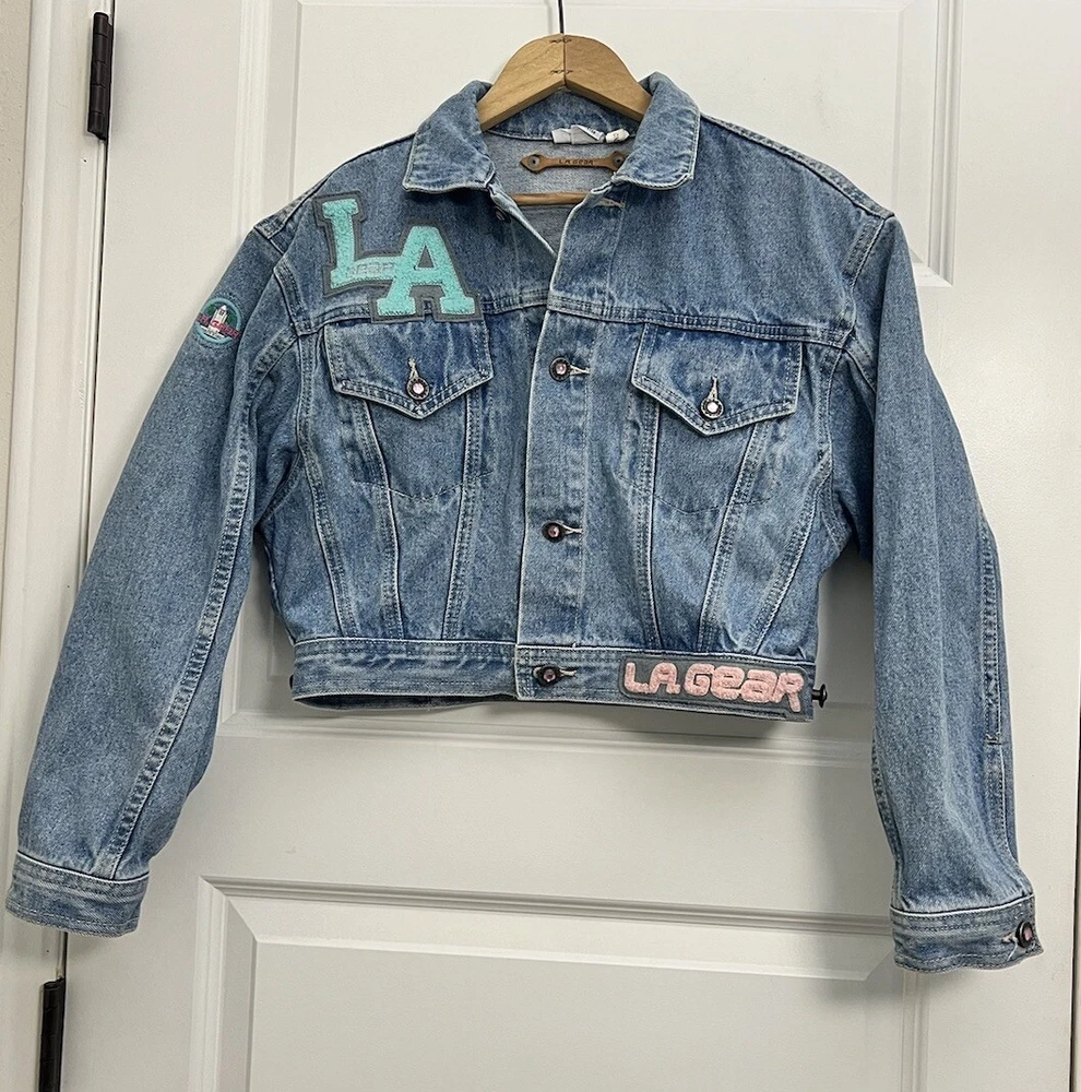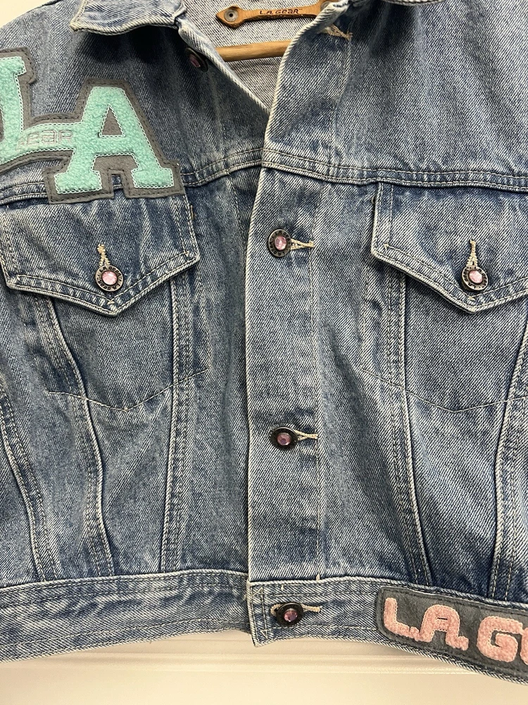 Double sided letterman Cropped, adjustable sides Pleated Pink Jeweled buttons Patches Inside graffiti In good preowned condition. The shoulder pad has an about an inch section that needs to be resown. Please see all photos. Follow for more.