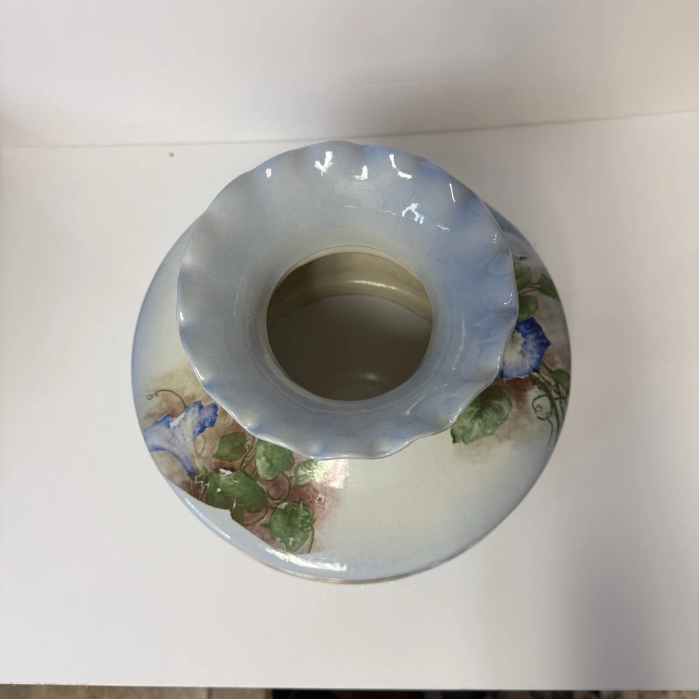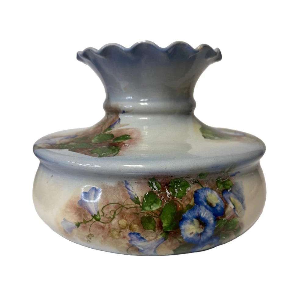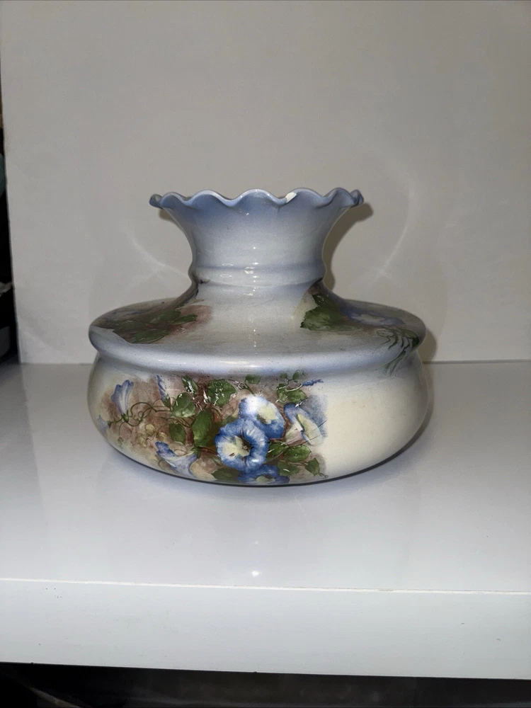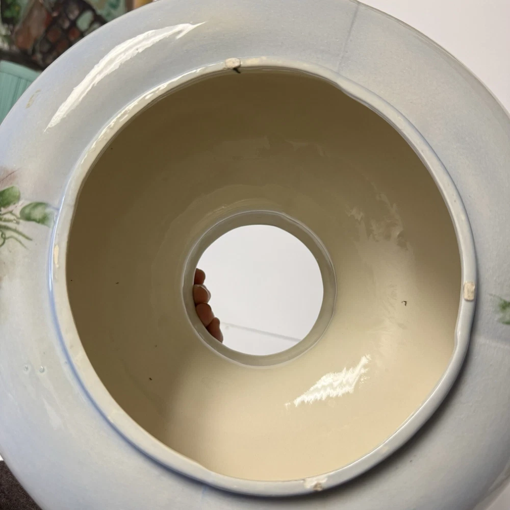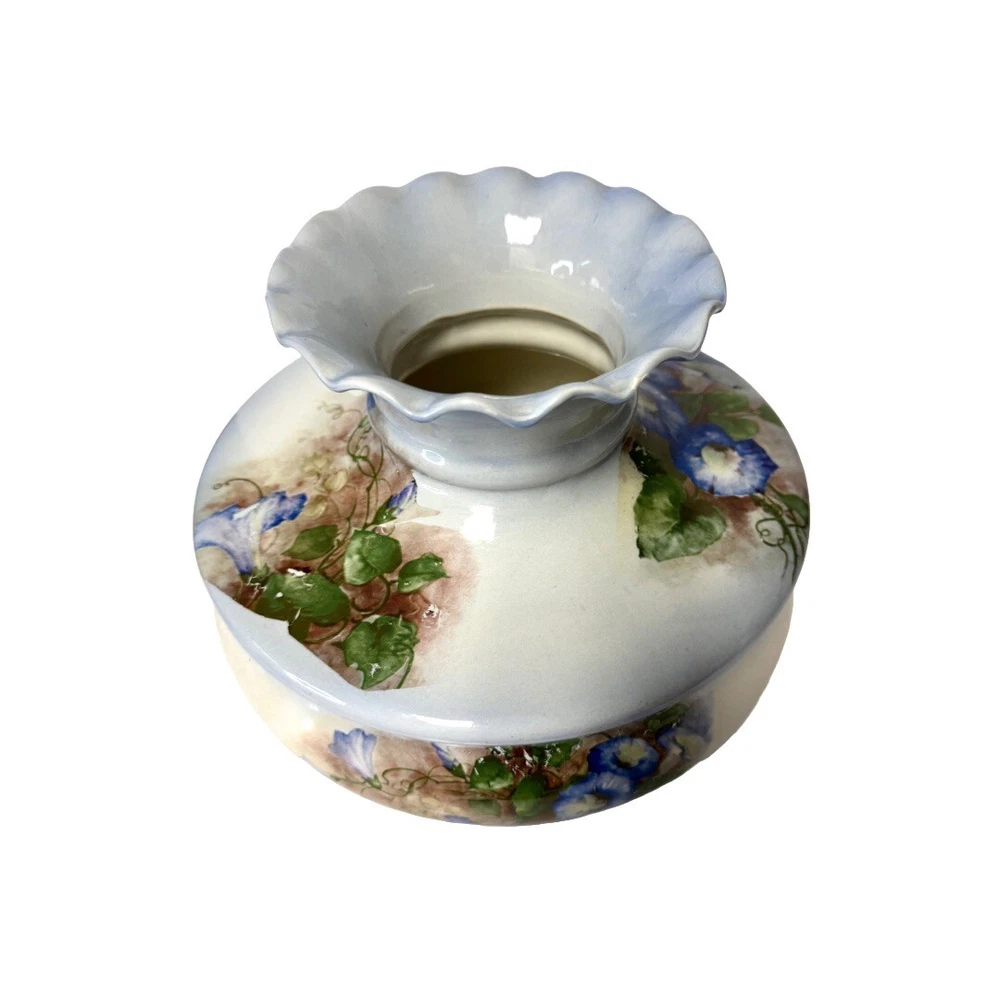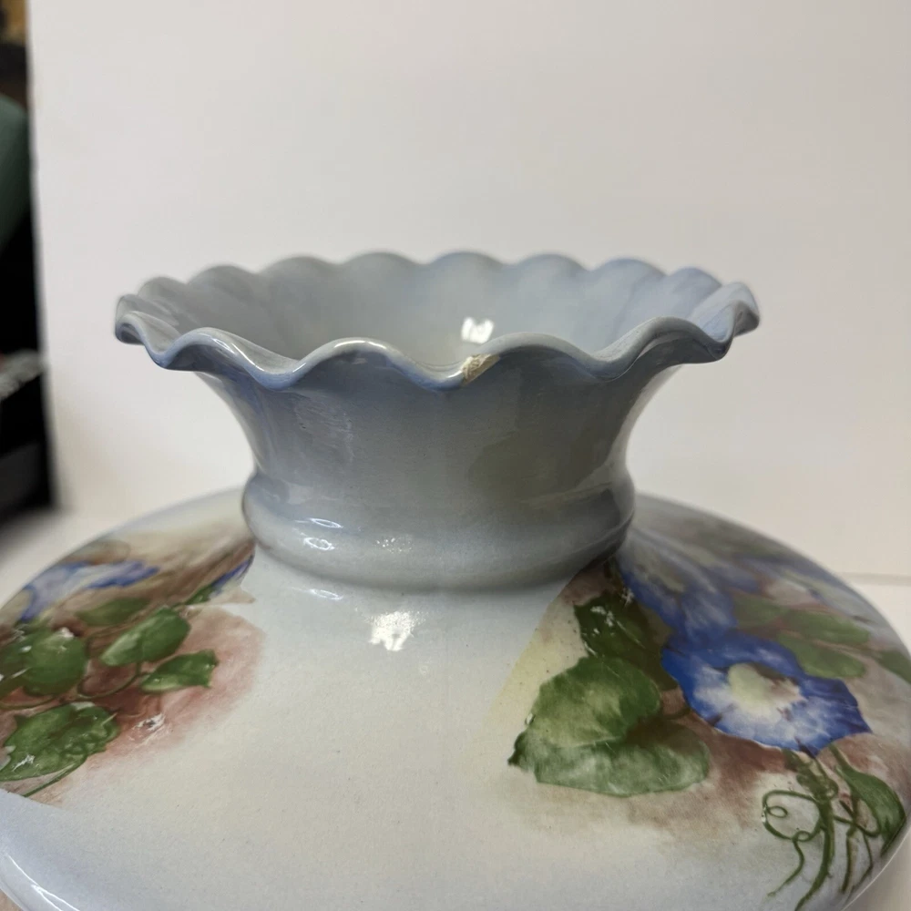 This large vintage Gone with the Wind hurricane lamp shade features a blue flower design with a Victorian style. It is the original hurricane lamp style from the 1970s. The shade has a white color and a flower design, making it a striking piece for any space.