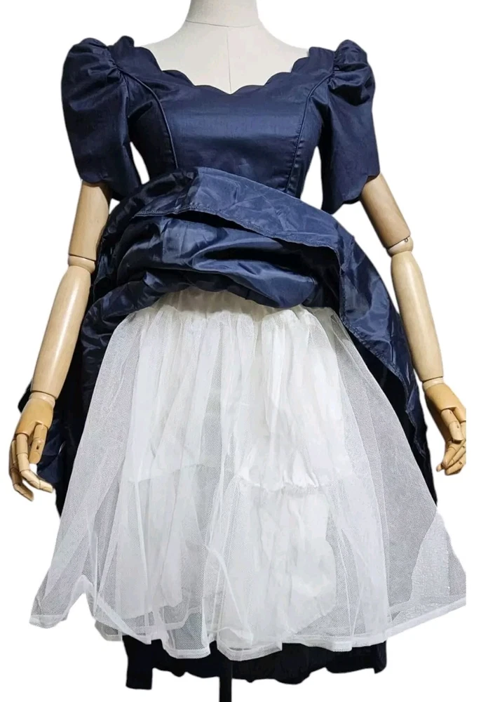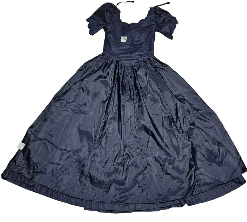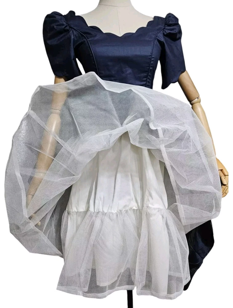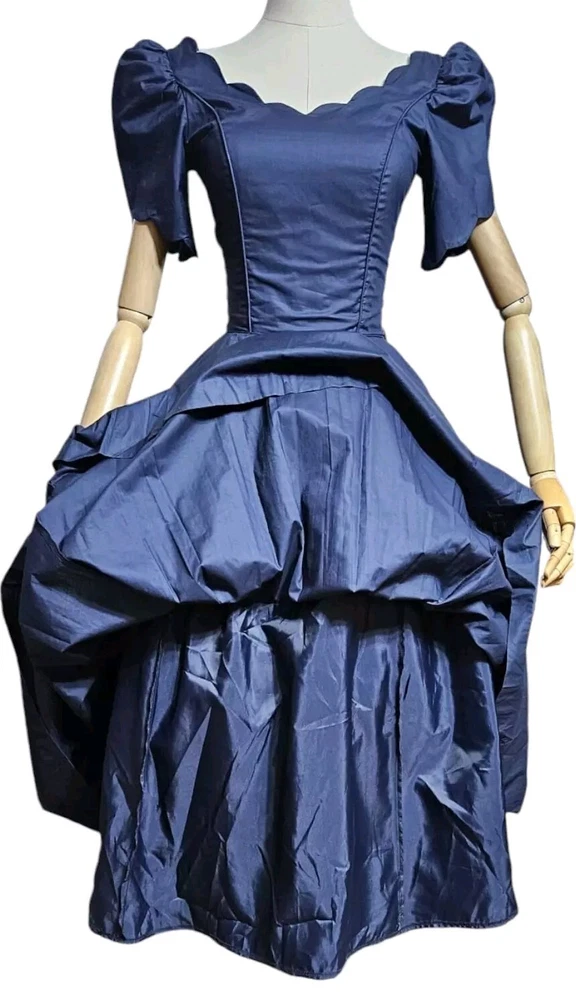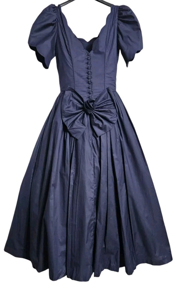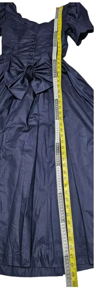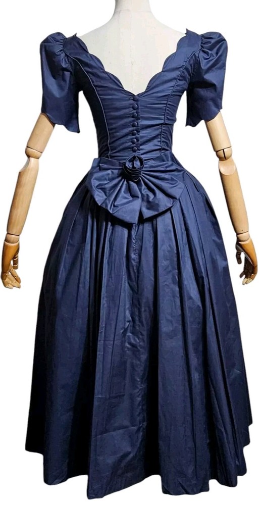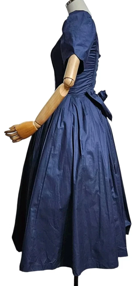 Vintage rare 80's Laura Ashley Cotton Dress in Navy Blue with Fit and Flare Skirt for Victorian Formal Occasions. Short sleeves.Very thin waist. Deep V-shaped back with bow, full midi length skirt. Three-layer white inner skirt (see photo). Closes at the back with small buttons and a hidden zipper under the bow.In good condition. For collectors, film studios, photo shoots. Tag size UK 10, USA 6, 36 EUR. BUT PLEASE NOTE THAT THE SIZES ARE SMALL!!!(in inches/centimeters). If you have any questions, please ask before purchasing the product. I included a tape measure in the photos for you to determine the fit, the quality, and condition of the item. PLEASE USE MEASUREMENTS NOT SIZE LABEL TO DETERMINE FIT! Please note that the color of the product on the screen may vary slightly from the actual color, depending on the screen settings, lighting and other factors. Please see my other items! I really appreciate my business and try to meet all the expectations of the buyer. Delivery time from UKRAINE to EUROPE is about 15-30 days, to the USA about 15-36 days. AUSTRALIA 30-50 days. Buyer pays shipping and all additional costs such as taxes and customs fees. Shipping charges are non-refundable. Thank you for visiting my store! Good mood and pleasant shopping for you!