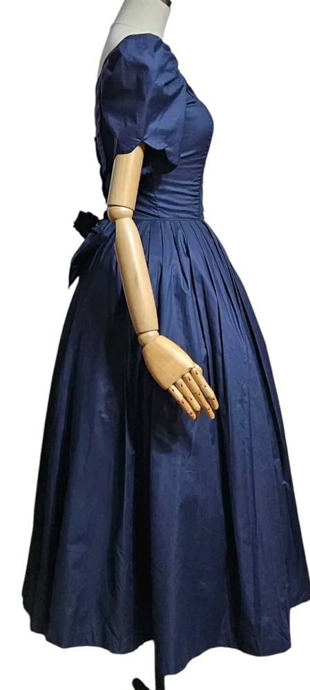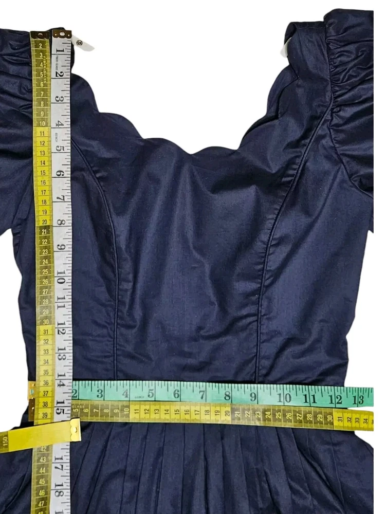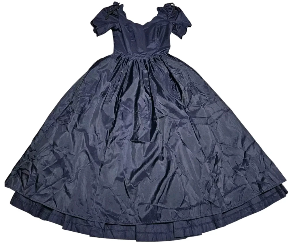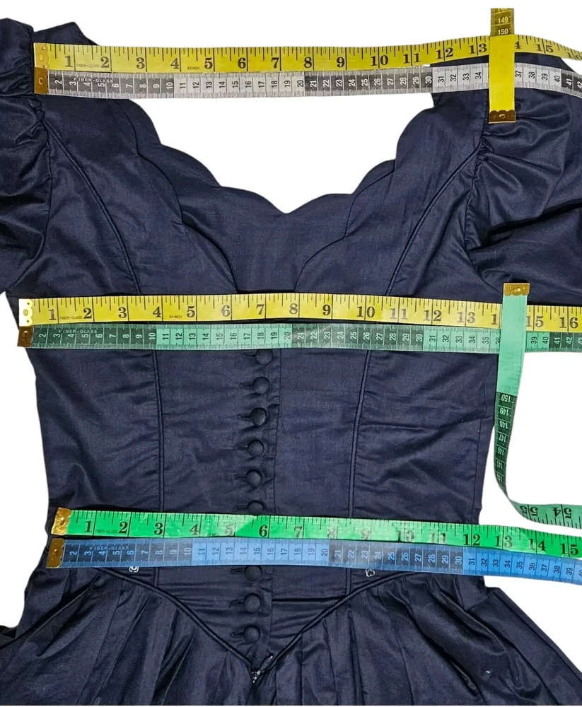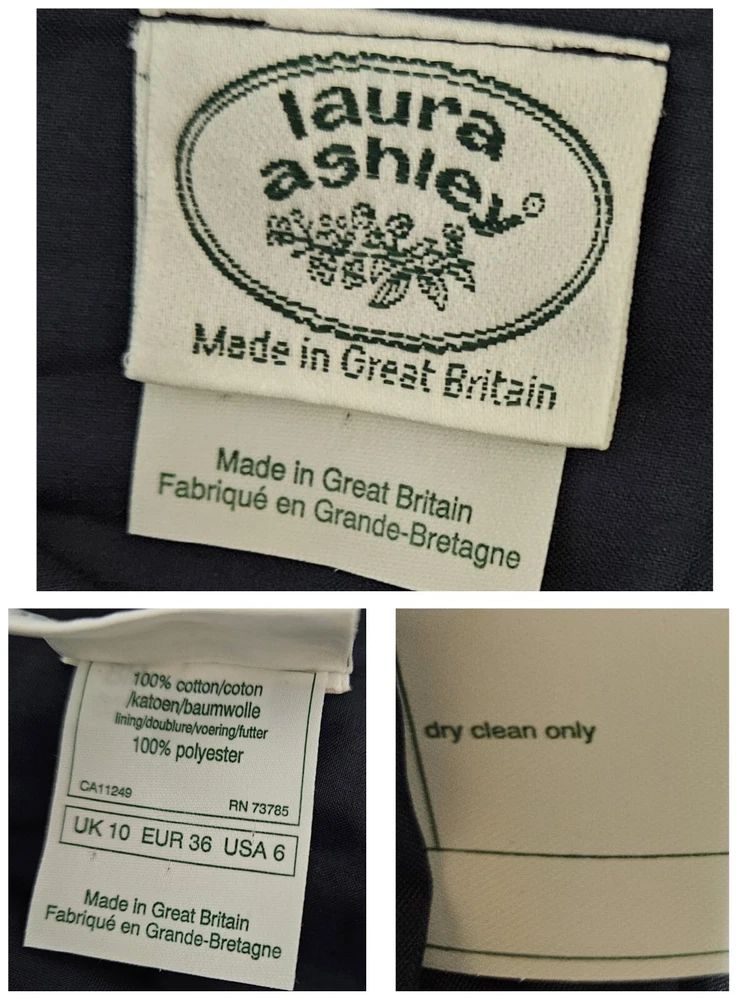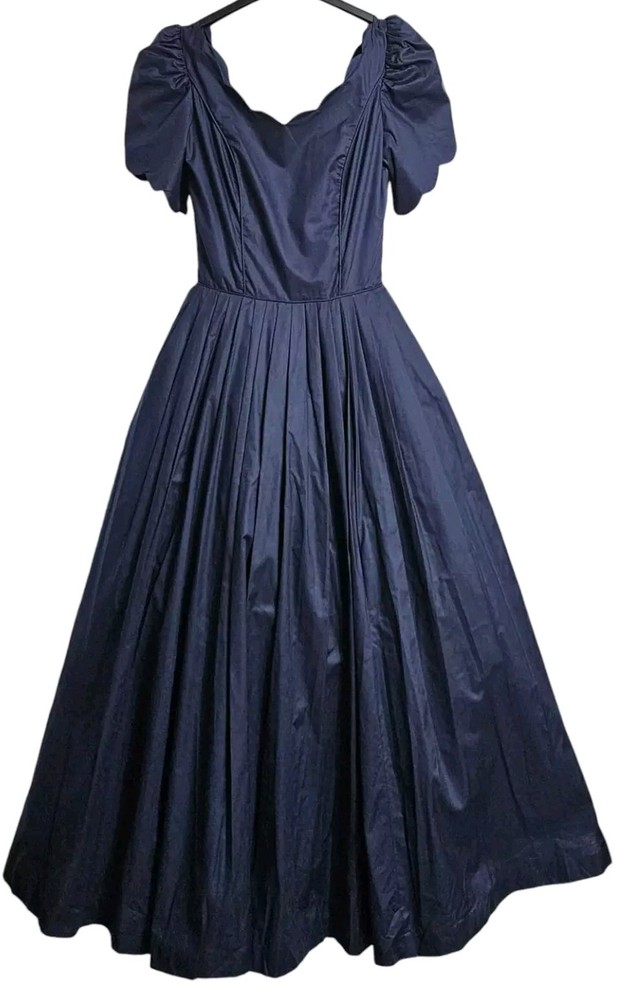 Vintage rare 80's Laura Ashley Cotton Dress in Navy Blue with Fit and Flare Skirt for Victorian Formal Occasions. Short sleeves.Very thin waist. Deep V-shaped back with bow, full midi length skirt. Three-layer white inner skirt (see photo). Closes at the back with small buttons and a hidden zipper under the bow.In good condition. For collectors, film studios, photo shoots. Tag size UK 10, USA 6, 36 EUR. BUT PLEASE NOTE THAT THE SIZES ARE SMALL!!!(in inches/centimeters). If you have any questions, please ask before purchasing the product. I included a tape measure in the photos for you to determine the fit, the quality, and condition of the item. PLEASE USE MEASUREMENTS NOT SIZE LABEL TO DETERMINE FIT! Please note that the color of the product on the screen may vary slightly from the actual color, depending on the screen settings, lighting and other factors. Please see my other items! I really appreciate my business and try to meet all the expectations of the buyer. Delivery time from UKRAINE to EUROPE is about 15-30 days, to the USA about 15-36 days. AUSTRALIA 30-50 days. Buyer pays shipping and all additional costs such as taxes and customs fees. Shipping charges are non-refundable. Thank you for visiting my store! Good mood and pleasant shopping for you!