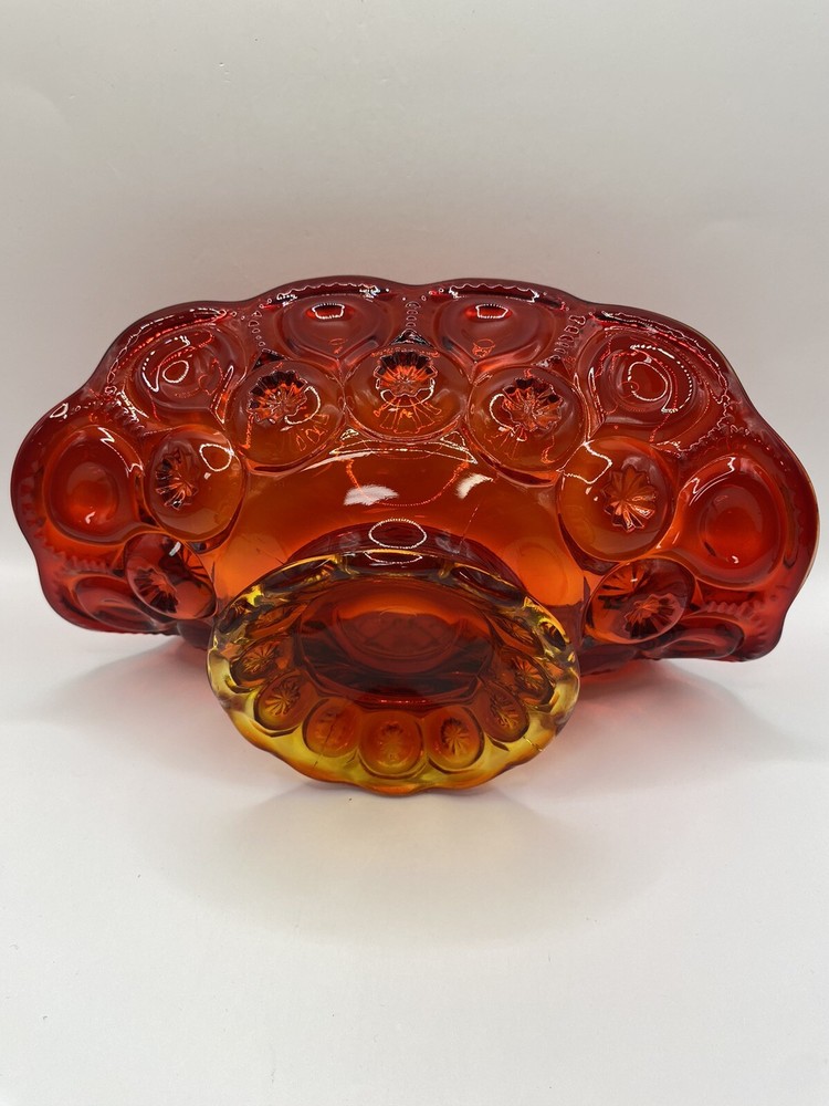 This is a vintage LE Smith Moon and Stars banana boat glass ruffle vase compote in a red color. The oval-shaped item is made of glossy glass with a moon and stars pattern and measures 9 inches in length, 41/2 inches in height, and 5 inches in width. It features a unique design and is a collectible piece from the brand LE Smith. The item is relatively lightweight, weighing 1 pound and 11.1 ounces.