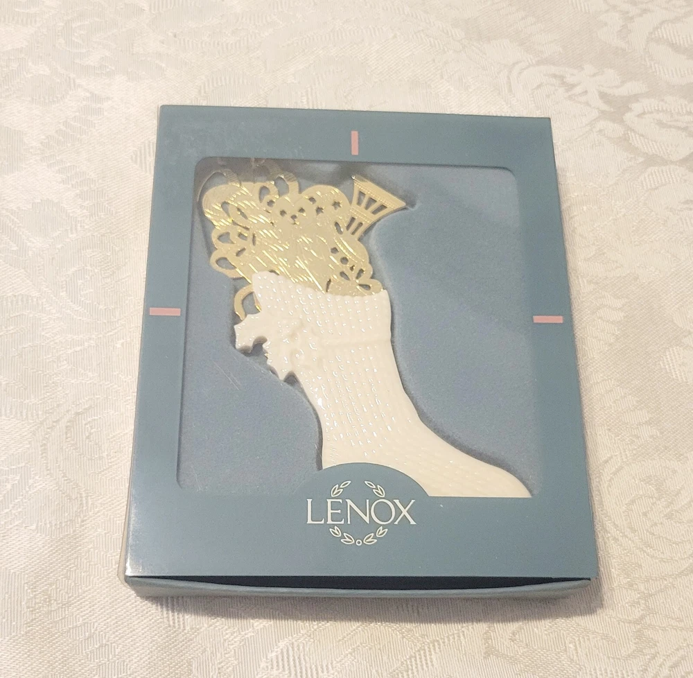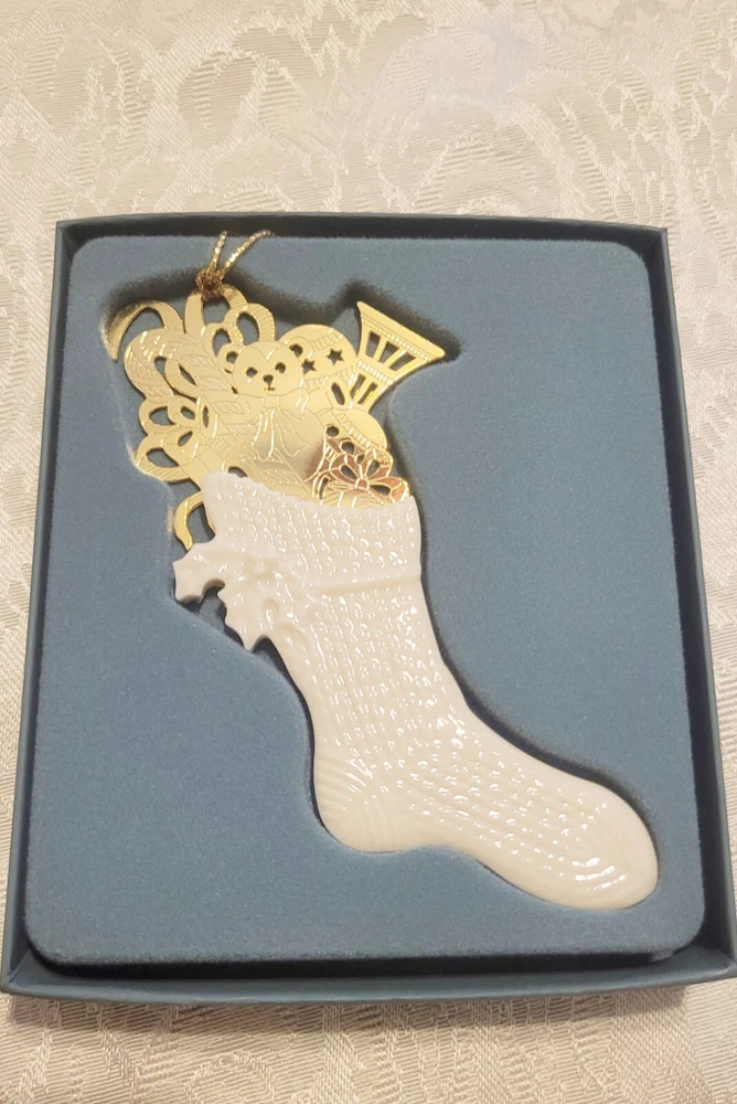 New in original box with tag, Lenox Ivory & Gold Christmas Stocking Ornament, vintage 1990s Smoke free home