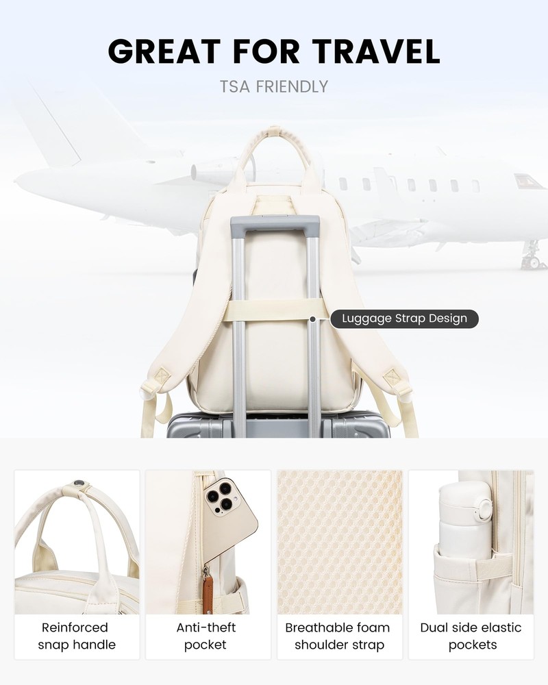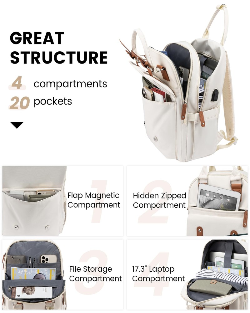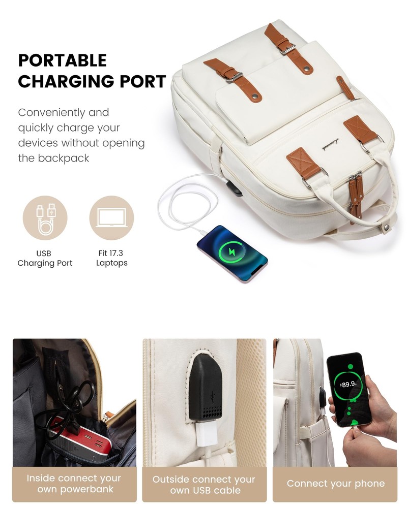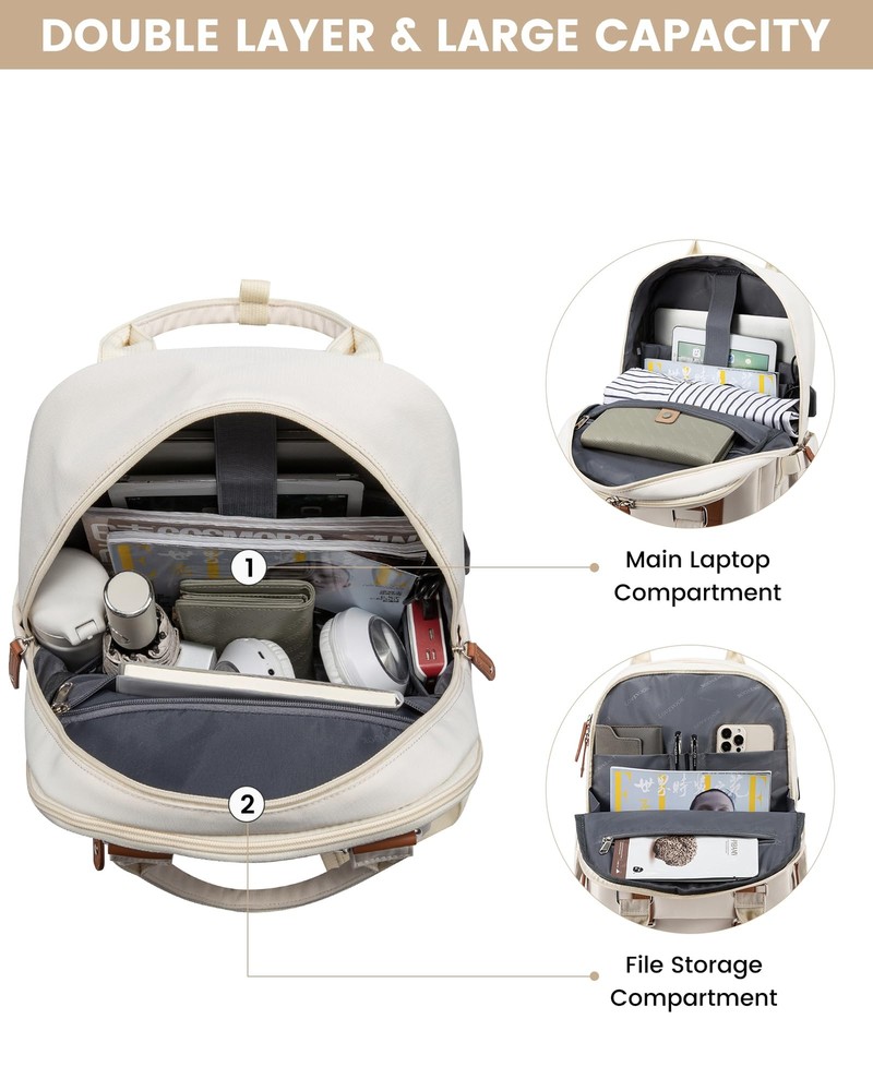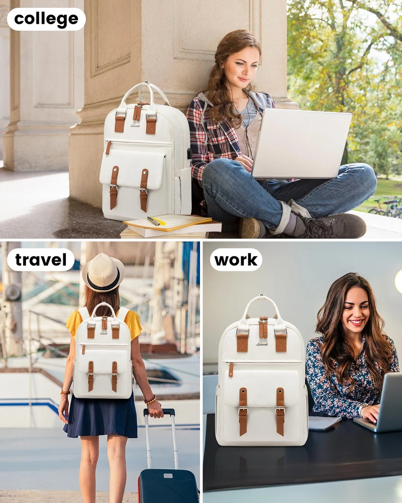 Fashionable Design & Multipurpose: vintage laptop backpack can used as a commuter travel backpack, a office business work backpack, a computer backpack, a college backpack purse.It's a perfect gift for women, teacher, doctor, nurse and college.The front flap design makes this laptop backpack more stylish, is your must-have computer bag Double-Layer Structure & Four-Layer Pockets: This college backpack purse has ample capacity with a total of 20 pockets. Velcro and padding keep your laptop and iPad from slipping, you can keep your headphones, laptop charger, wallet, clothes, mouse, pens, 3 ring binder in this laptop backpack's main pocket area and inner table pocket. Hidden front zippered pockets and buckle pockets provide easy access to everyday essentials Travel Friendly & More Details: travel backpack(airline approved) has double zipper for smoother opening, top handle with snap button for added security, two external side pockets to store hydroflask and umbrella, front magnetic snap buckle is easy to access.The breathable foam shoulder straps can effectively relieve shoulder pressure and the luggage straps can be slipped over the suitcase handle to make your travel easier and more comfortable External USB Charging Port & Anti-Theft Pocket: With USB charging port outside and built in charging cable and pocket inside, this usb charging port design commuter backpack gives you convenient way to charge your phone while commuting to college or company.(Power bank not included)With a hidden anti theft pocket on the back protect your valuable items from thieves.when you are having a business trip or traveling,the above two functions are very useful Premium Materials & Notes: retro laptop backpack is made of high tenacity polyester fabric, lightweight, scratch-resistant, tear-resistant, durable and splash-proof, dimension:11.4"L 17"H 7.5"W, can hold laptop up to 15.6".If you have any problems after receiving our backpack, please contact us, we will reply you within 24 hours with a solution