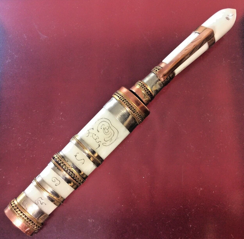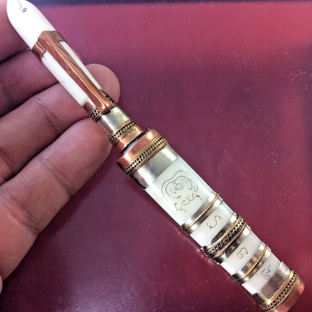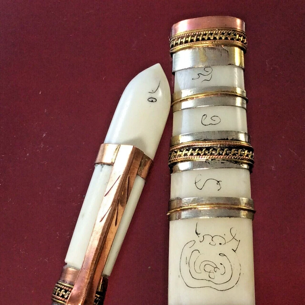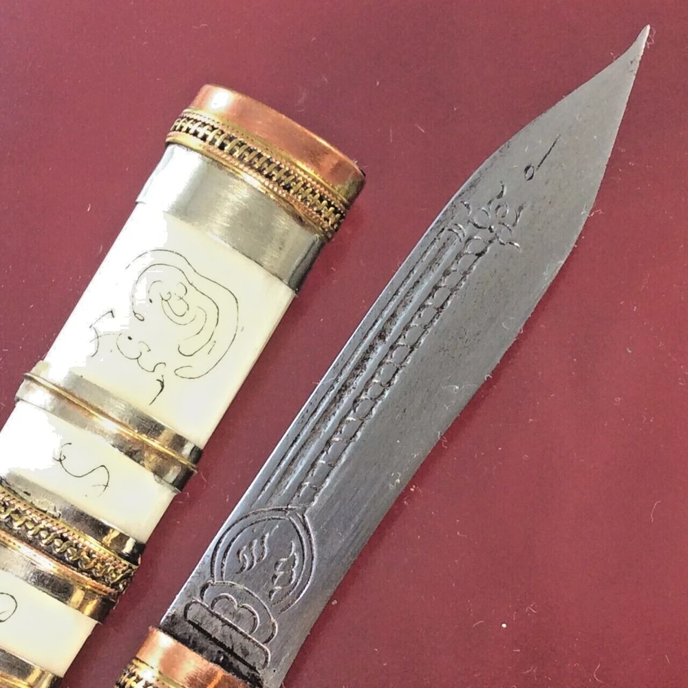 Vintage LP Derm Ceremonial Knife Unique Thai Buddhist Talisman Sacred Artifact This rare and authentic LP Derm ceremonial knife is a highly revered artifact, originating from the renowned Wat Nong Po Temple in Thailand. Measuring approximately 5 inches in length, this compact yet powerful knife (มีดอันเล็ก) was expertly handcrafted with exceptional attention to detail. The blade is forged from high-quality steel and features intricate engravings that symbolize spiritual protection, power, and blessings. The handle and sheath are beautifully adorned with traditional Thai patterns, premium materials, and sacred inscriptions, reflecting outstanding craftsmanship and deep spiritual significance. Attributed to the legendary monk LP Derm of Wat Nong Po Temple, this small ceremonial knife is not only a collectible piece of history but also a meaningful spiritual talisman. LP Derm is widely respected for his powerful amulets and sacred objects, believed to provide protection, prosperity, and good fortune. Its vintage condition, with a natural patina and fine detailing, adds to its authenticity and charm, making it an ideal addition to any collection or spiritual practice. Note: The photos shown are samples from our stock. The actual product may vary slightly FREE!! Shipping registered mail WORLDWIDE with tracking number. If you have questions, feel free to write me on e B a y message. THANK YOU FOR SHOPPING