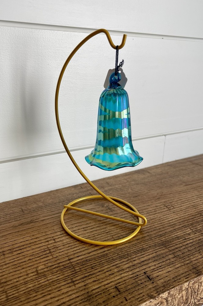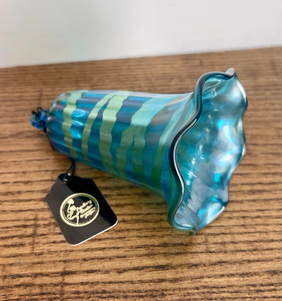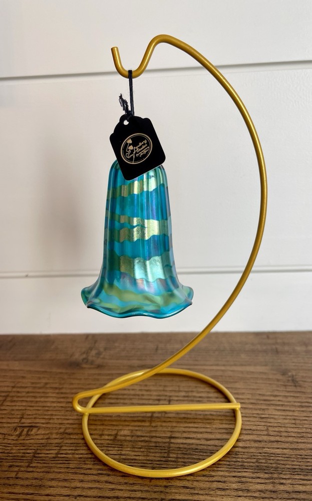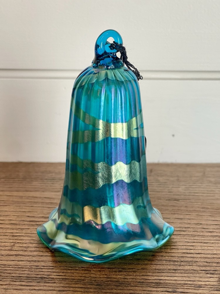 LUNDBERG STUDIOS-Vintage AURENE Art Glass Green & Gold Iridescent BELL Shaped Ornament-Signed-NWT Made in 1988...absolutely beautiful colors and execution. Original Tag-Never Used...MINT Like New Condition. Measurements: 2.5" round at bottom, 4" high Signed LS 88