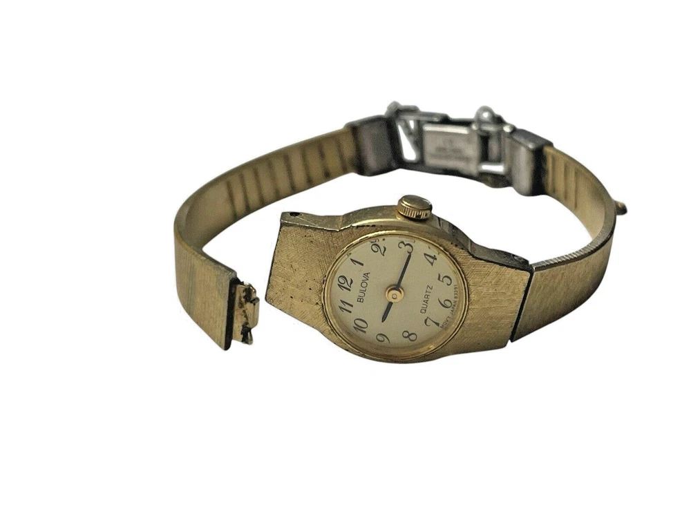 This vintage Bulova Quartz wristwatch is a timeless piece for any collection. With a gold plated case and fold over clasp, this watch is both elegant and practical. The geometric dial with self-winding movement makes it a versatile addition to any outfit. The watch is 5.76-6 in (146.3-152.4 mm) in size and has a 6.35mm band width. It features a solid caseback and base metal bezel type. The watch is designed for women and has a classic, dress/formal, and casual style. It is a Bulova Quartz model with reference numbers COP3 and COP4. This watch is a vintage piece from Japan and does not come with service records, manual/booklet, or seller warranty. needs repair good for parts