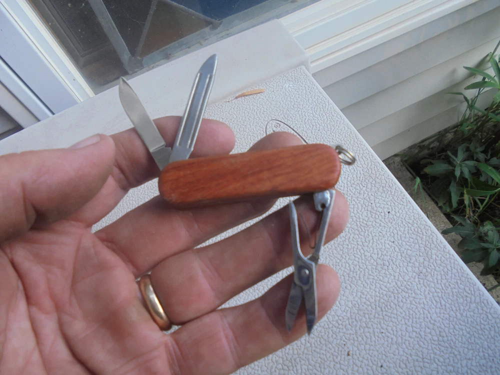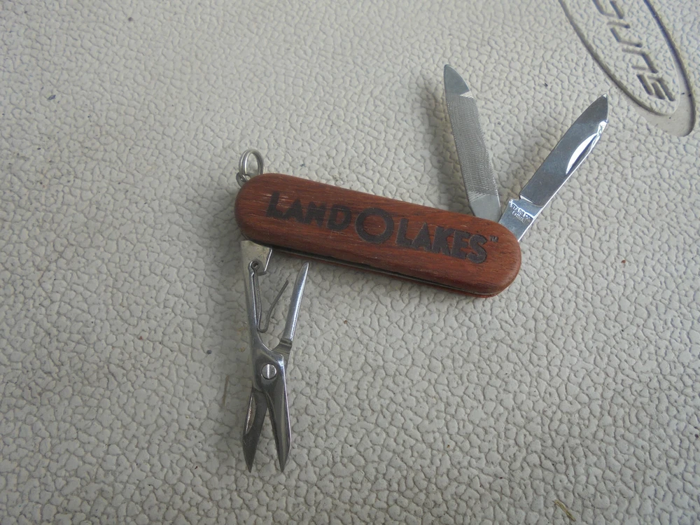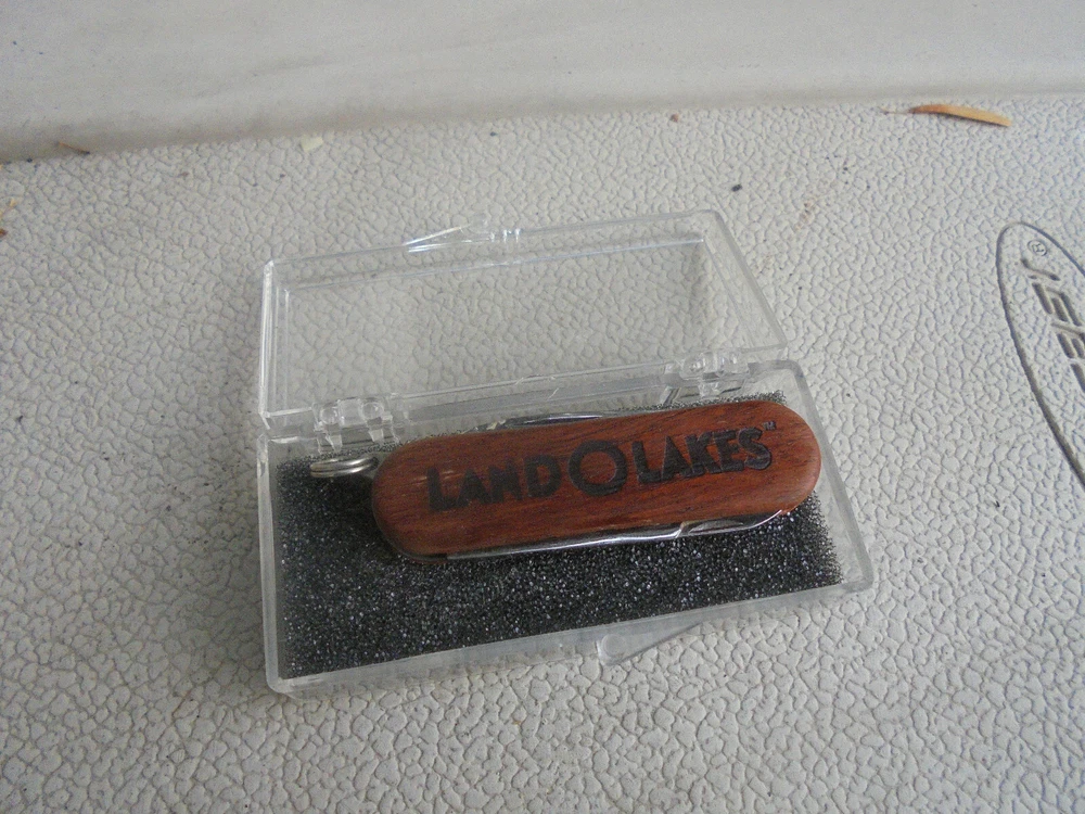 You are bidding on a Land O'Lakes pocket knife. It has a wood handle. There is a scissor, a small blade and a finger nail file. It comes in the original plastic box. This knife comes from an estate of a Land O'Lakes executive that retired in 2001. It measures 2 and 3/8 inches long. It is in excellent condition. I combine shipping on multiple purchases.