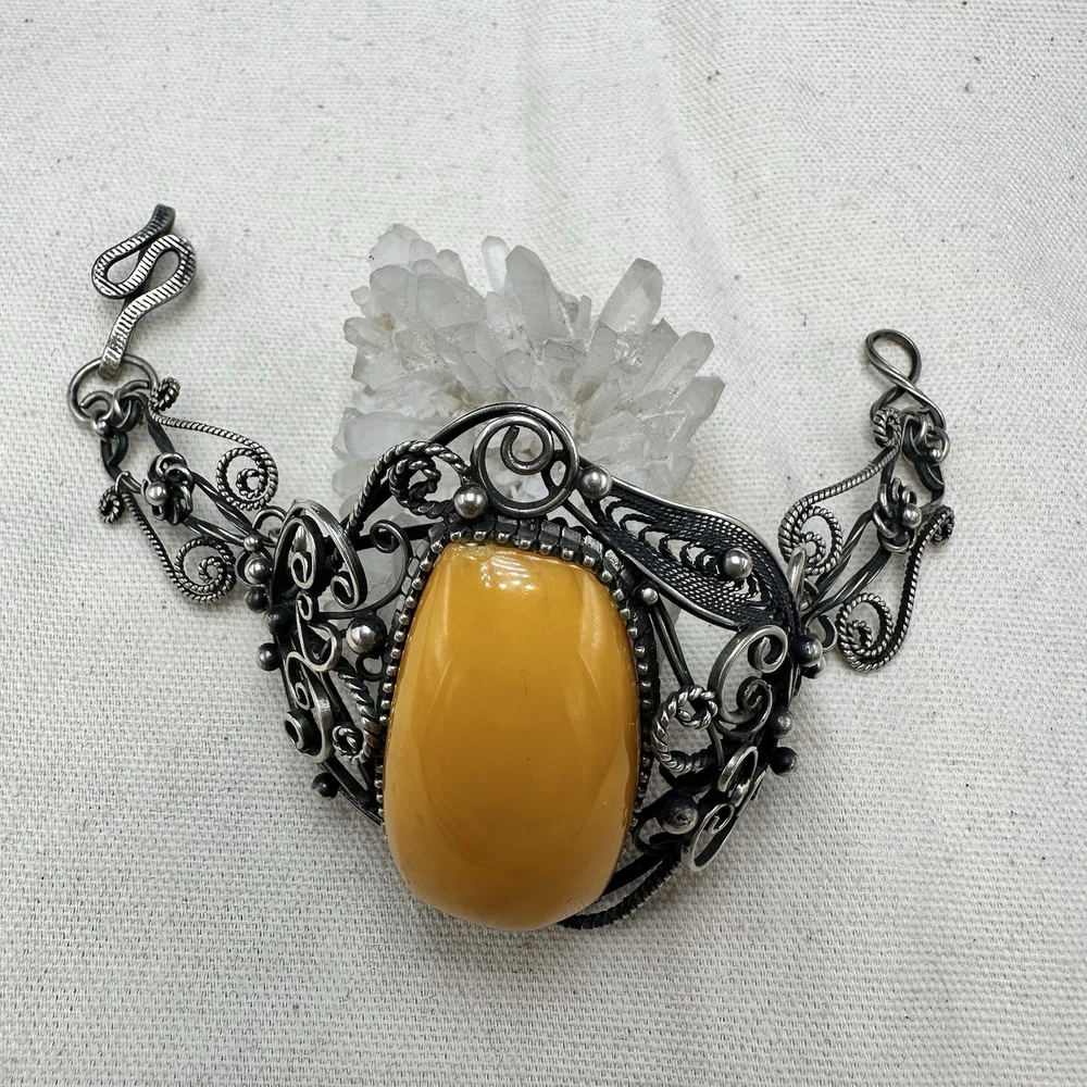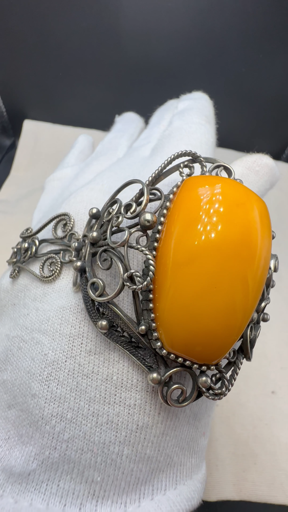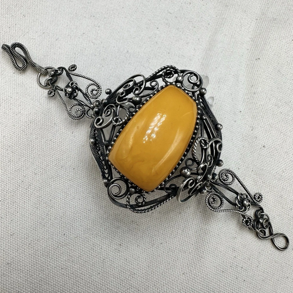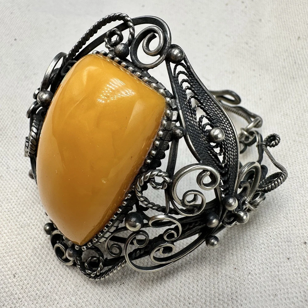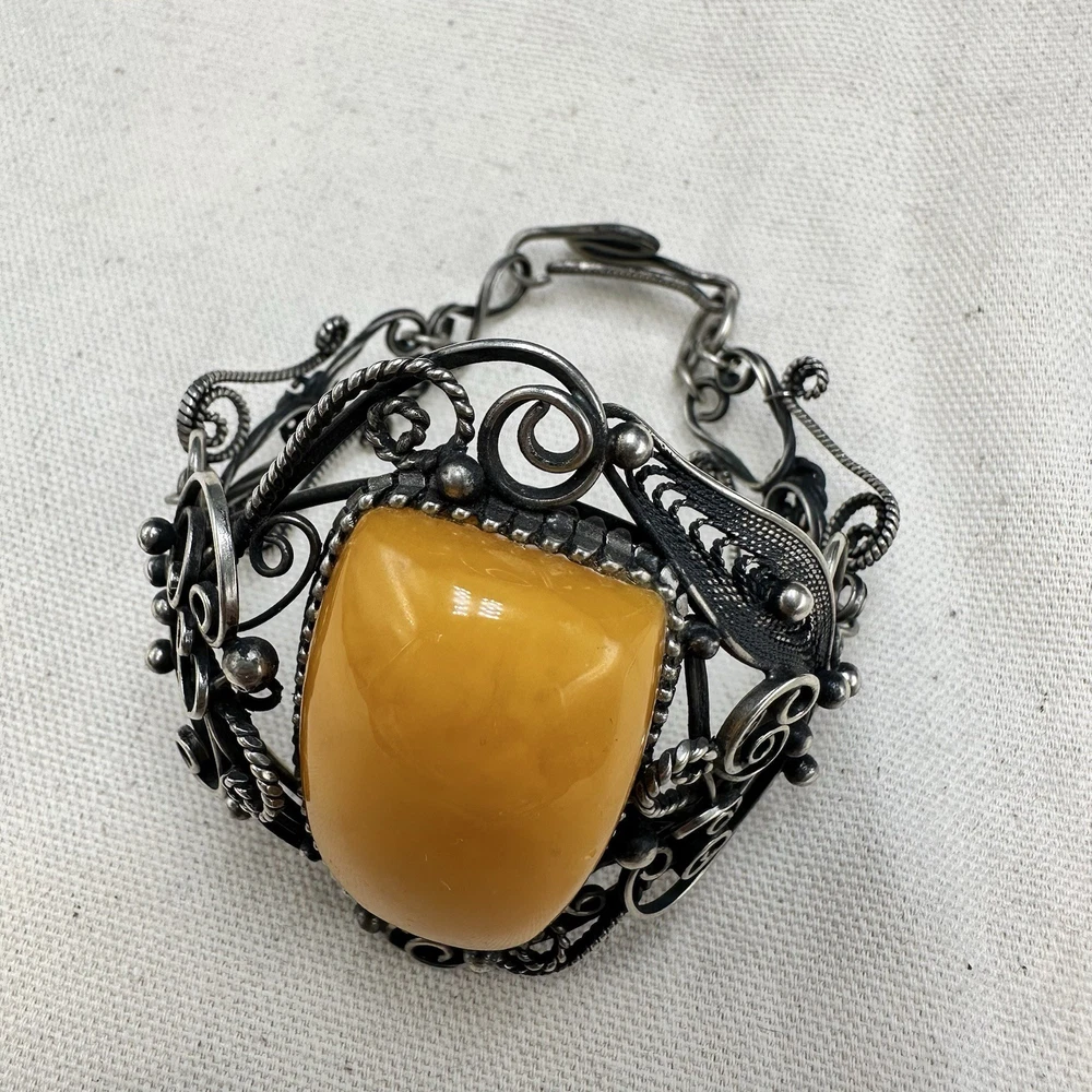 This vintage Baltic egg yolk amber bracelet in yellow color exudes a unique and timeless beauty, perfect for various occasions such as Mother's Day, Christmas, birthdays, and valentine's Day. The asymmetrical shape and huge cabochon main stone add a touch of elegance to the piece, which is a one-of-a-kind item with a Soviet-era charm. The bracelet is made of natural amber, making it suitable for women who appreciate vintage and bohemian style jewelry. There are my other items... https://www.ebay.com/usr/universeofjewelry