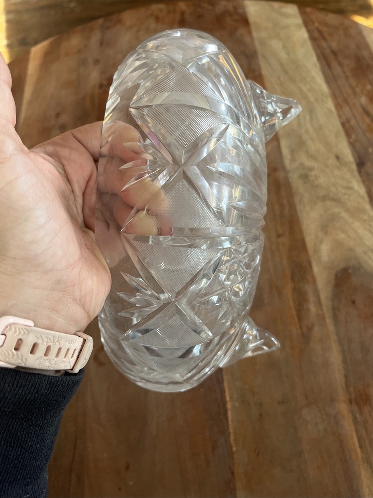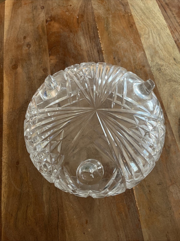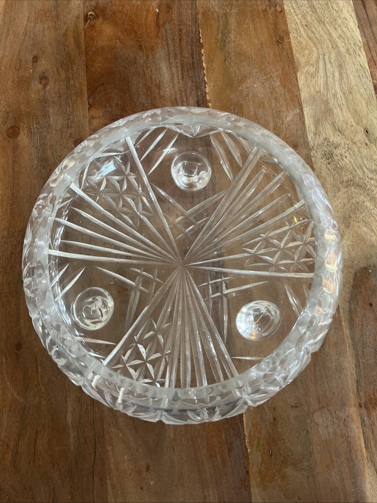 This vintage crystal cut glass large candy dish serving bowl is a beautiful addition to your mid-century modern collection. Measuring 10 inches across and standing on three legs, this bowl is perfect for displaying candies, fruits, or other small treats. The intricate cut glass design adds a touch of elegance to any room. Crafted using hand-blown glassmaking techniques and fused glass production style, this vintage original bowl is made of high-quality crystal material. The clear color and vintage pattern make it a versatile piece that can be used for any occasion. This bowl is a must-have for collectors and enthusiasts of mid-century modern design.