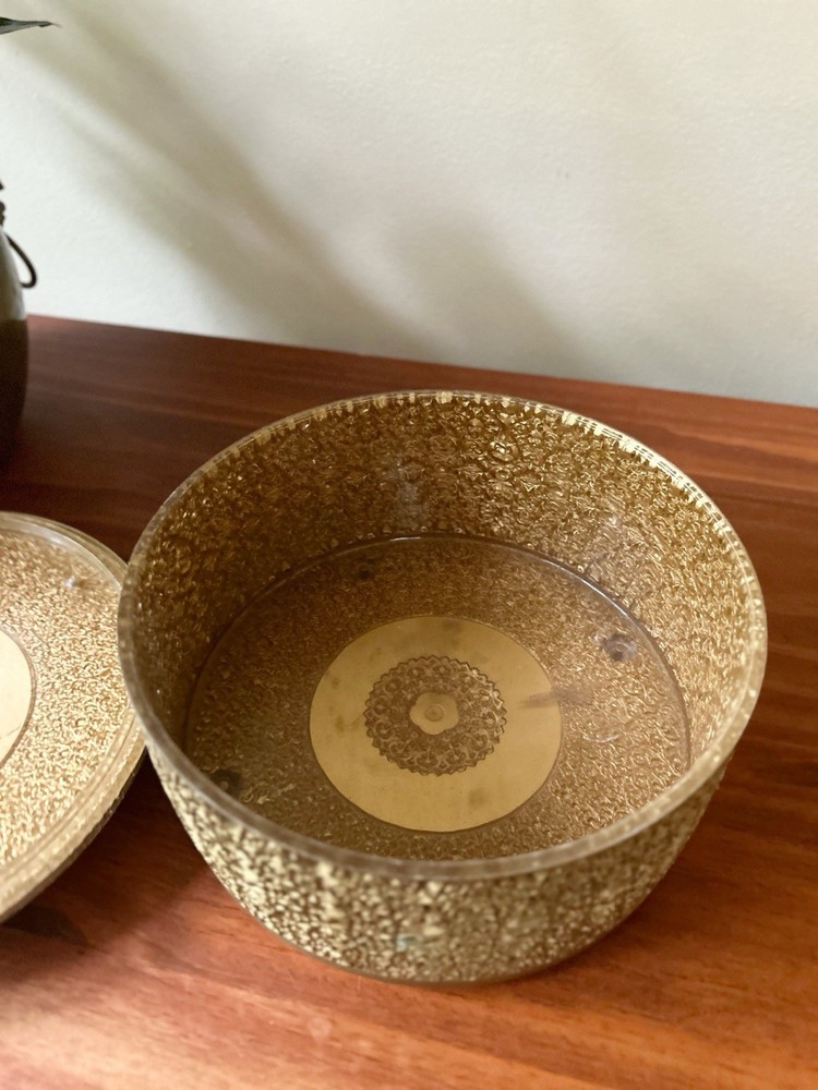 Vintage gold plastic storage box with lid. Good condition. Measures 5.5 inches tall and 8.5 inches in diameter. Combined shipping is available for all of my items listed.