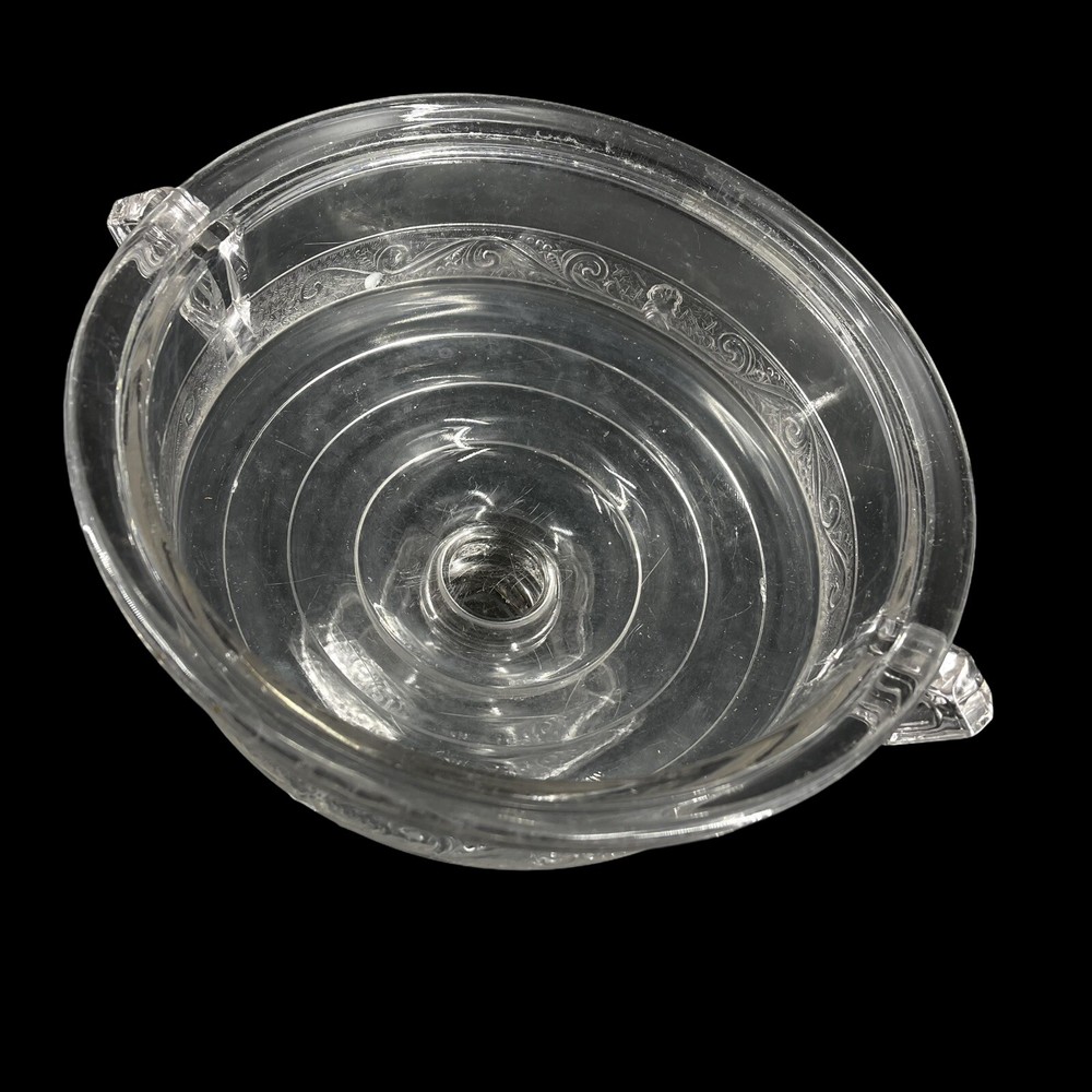 Large Vintage Pedestal Compote Two Handles Embossed Scrollwork Centerpiece 8" Embossed band around lower portion of bowl. Appears to be Caesar head and scrollwork. Similar scrollwork around the base and the stem. Internal bubbles in glass. 7 3/4" diameter at top rim and 6 1/2" tall.