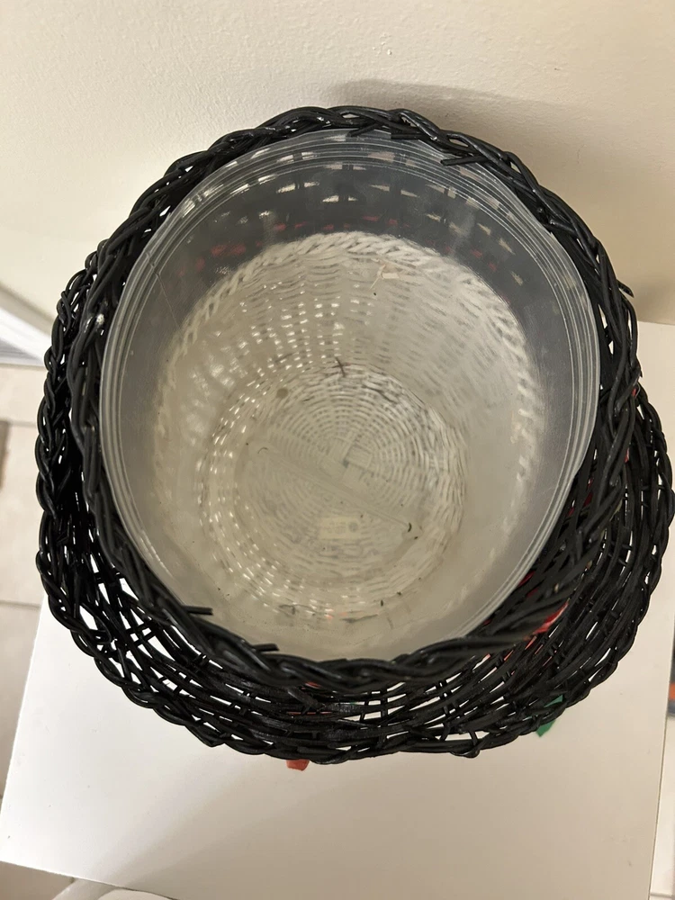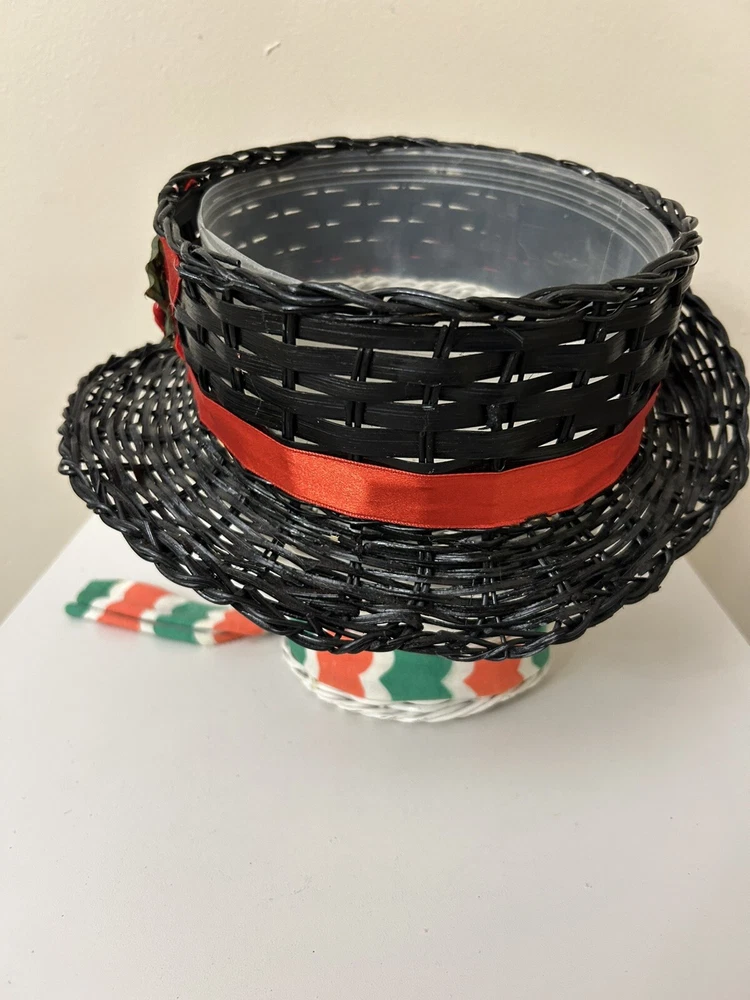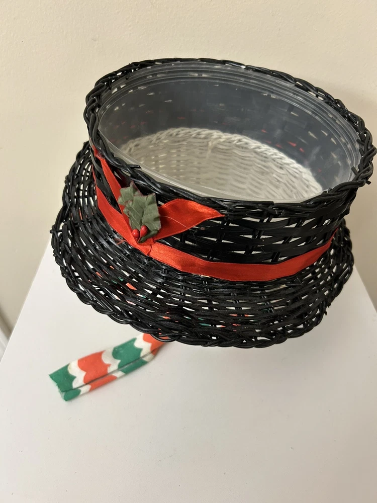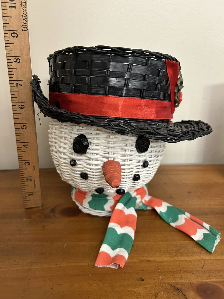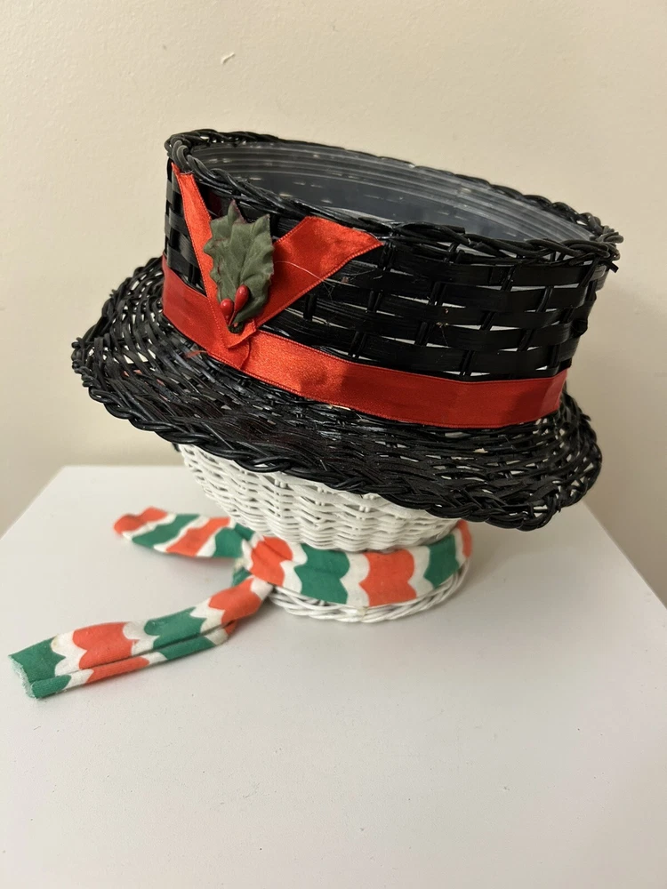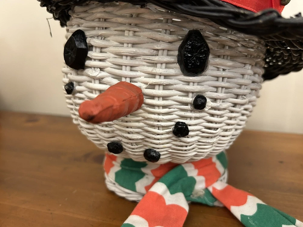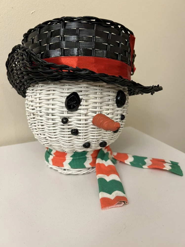 Vintage Large Wicker Rattan Snowman Frosty Head Hat Planter Basket Hand Painted Approximately 8.25” H and 6” W Good condition- refer to pics With Plastic insert