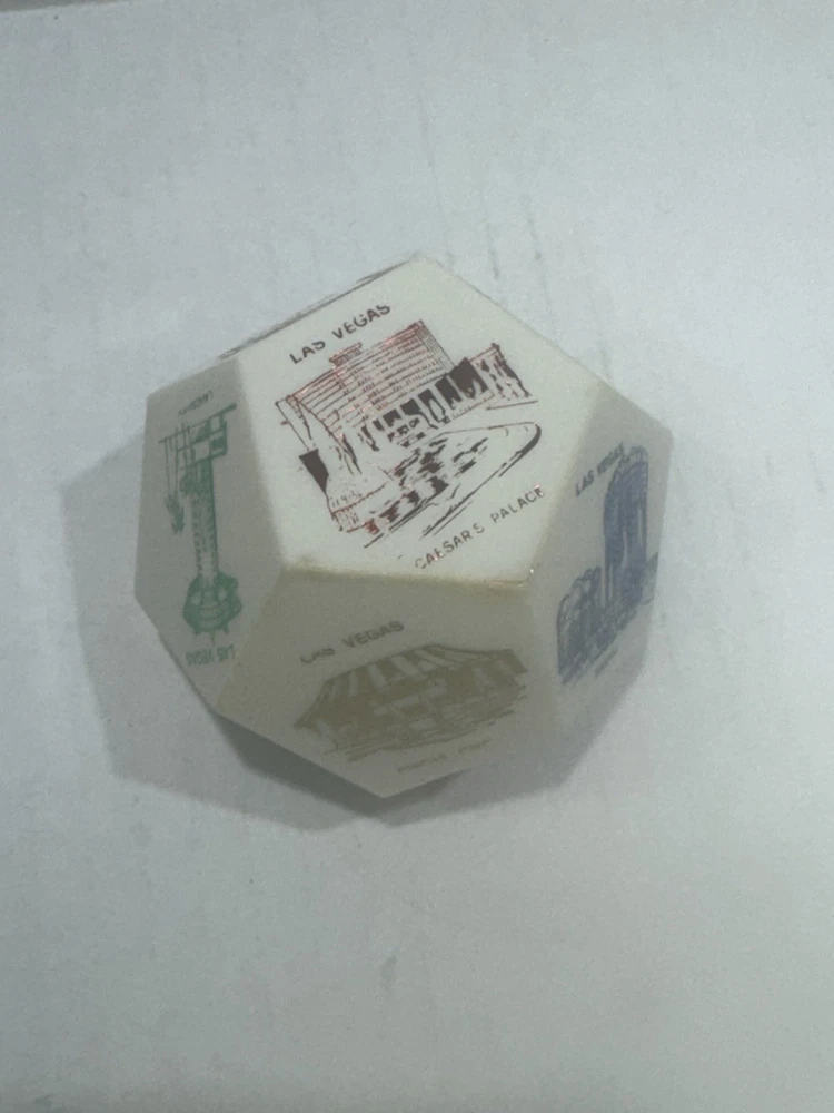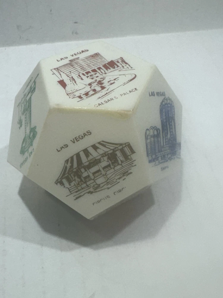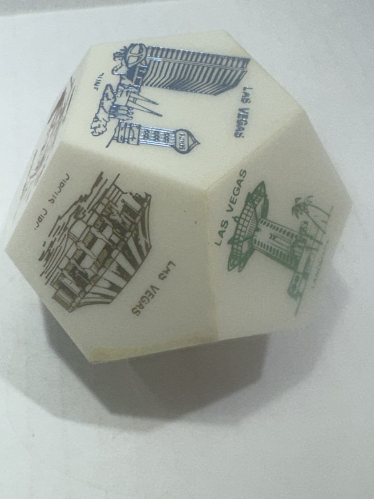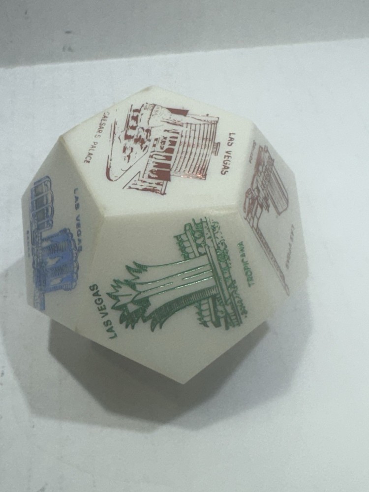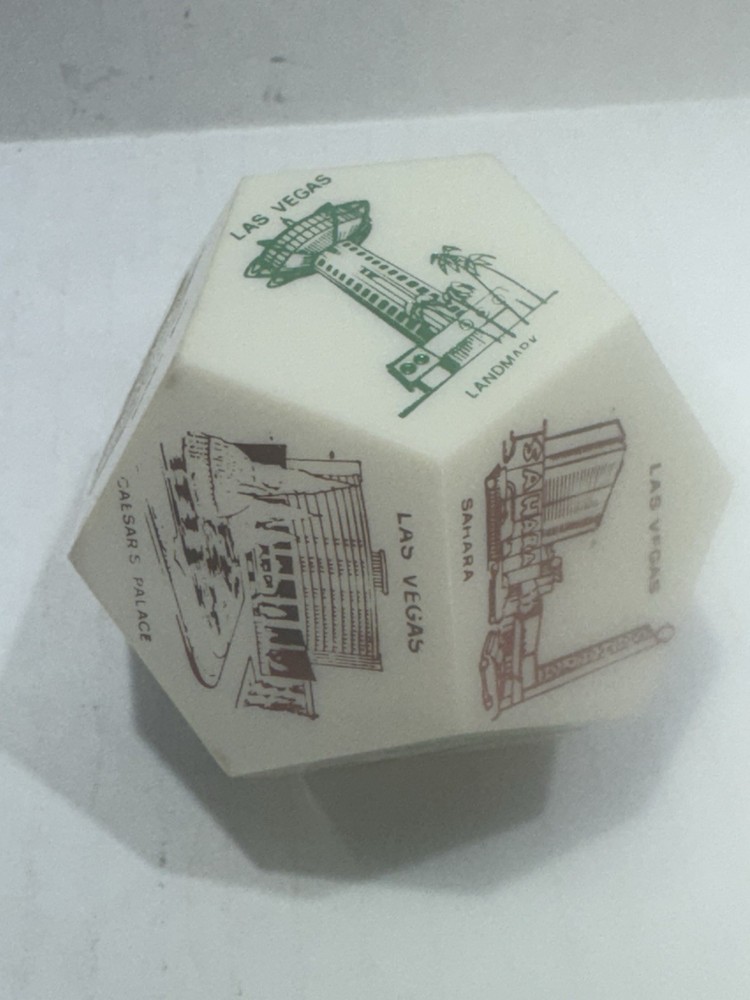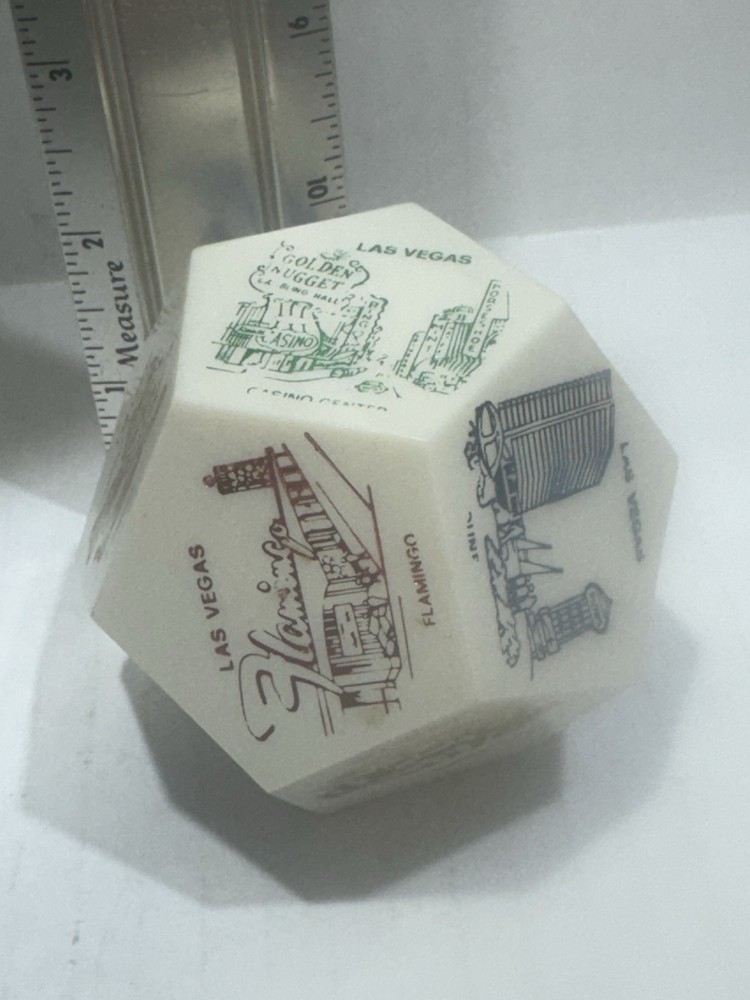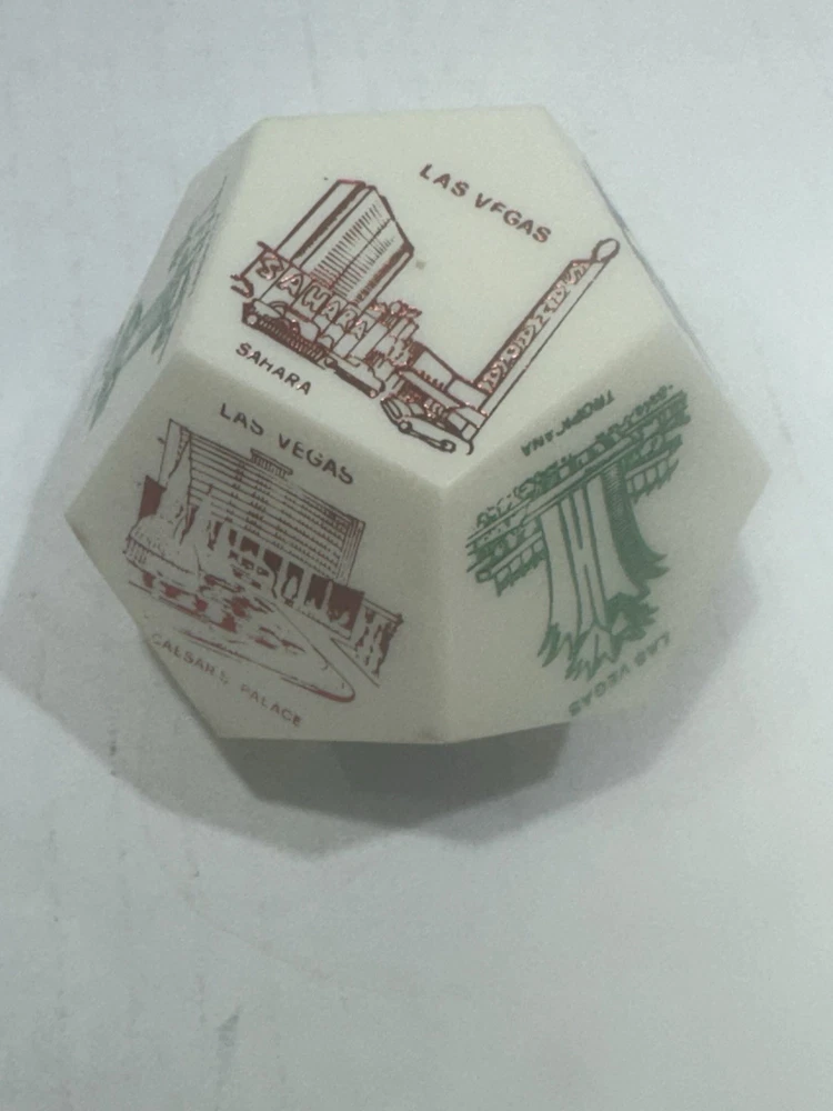 Vintage Las Vegas Jumbo Dice Souvenir – Casinos, Hotels, Rare Collectible ⸻ Item Description: Take a nostalgic roll through vintage Vegas! This rare jumbo souvenir die showcases iconic Las Vegas hotels and casinos, including: • Caesars Palace • Flamingo • Golden Nugget • Sahara • Hilton • Tropicana • Fremont Hotel • Landmark • Casino Center Each face of the die features a colorful retro-style illustration, capturing the essence of mid-century Las Vegas glitz. A perfect display piece for collectors of vintage gambling memorabilia, retro décor, or Sin City souvenirs. Material: Likely early plastic or resin Size: Approx. 2” across (see scale in photos) Condition: Very good vintage condition with mild signs of age (minor wear, some print fading on a few faces—see photos). No cracks or chips. ⸻ Keywords: vintage Las Vegas dice, jumbo casino die, souvenir collectible, 1960s Vegas memorabilia, retro hotel décor, mid-century Nevada gift, novelty game piece, dice collection, Caesars Palace, Flamingo, Sahara, Tropicana ⸻ ⸻ I try to ship within 24 hours (excluding weekends and holidays). Follow me and come back often as I list new treasures daily. Thanks for shopping with Vintage Wowzers – XOXO 💋 ⸻ MAY0025