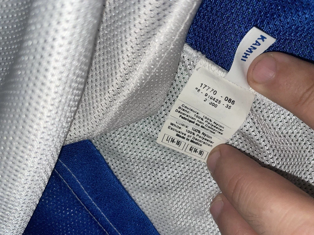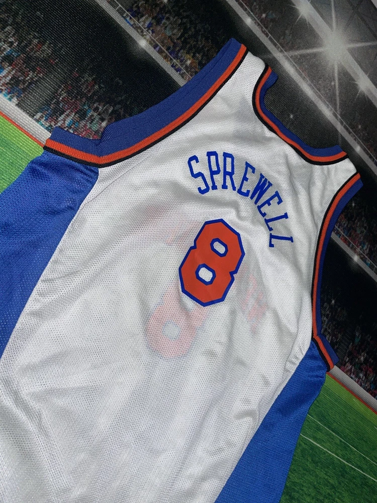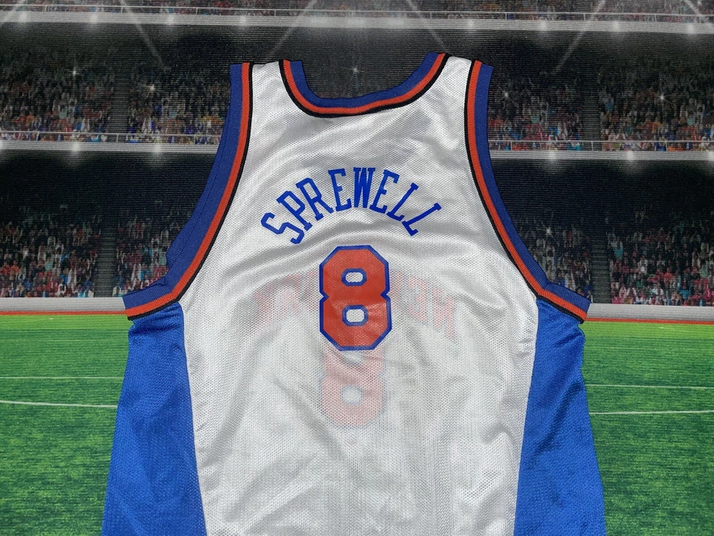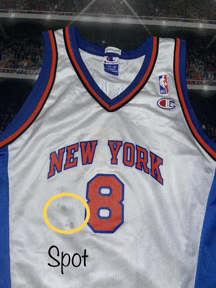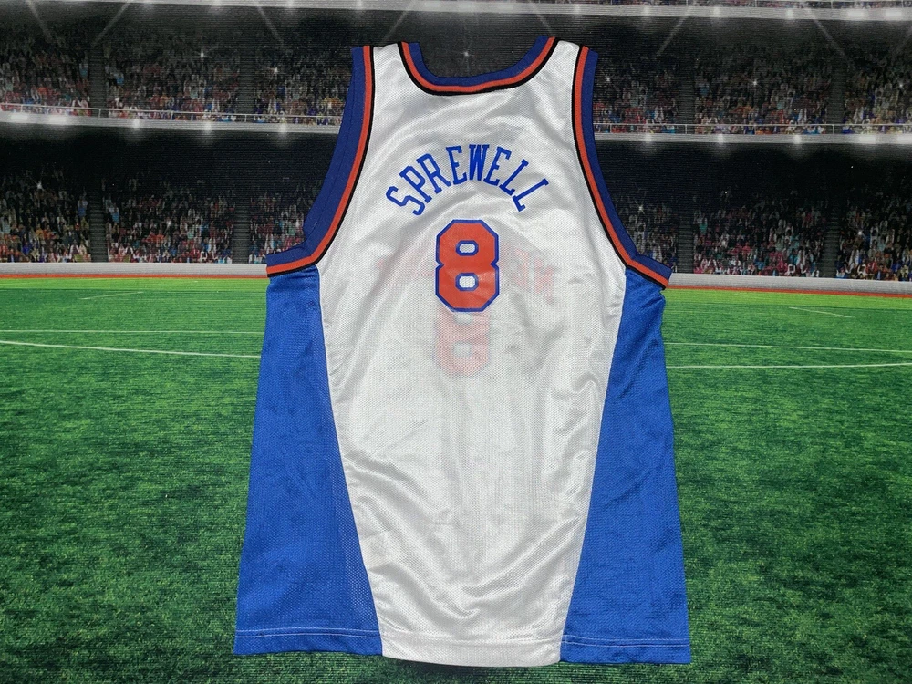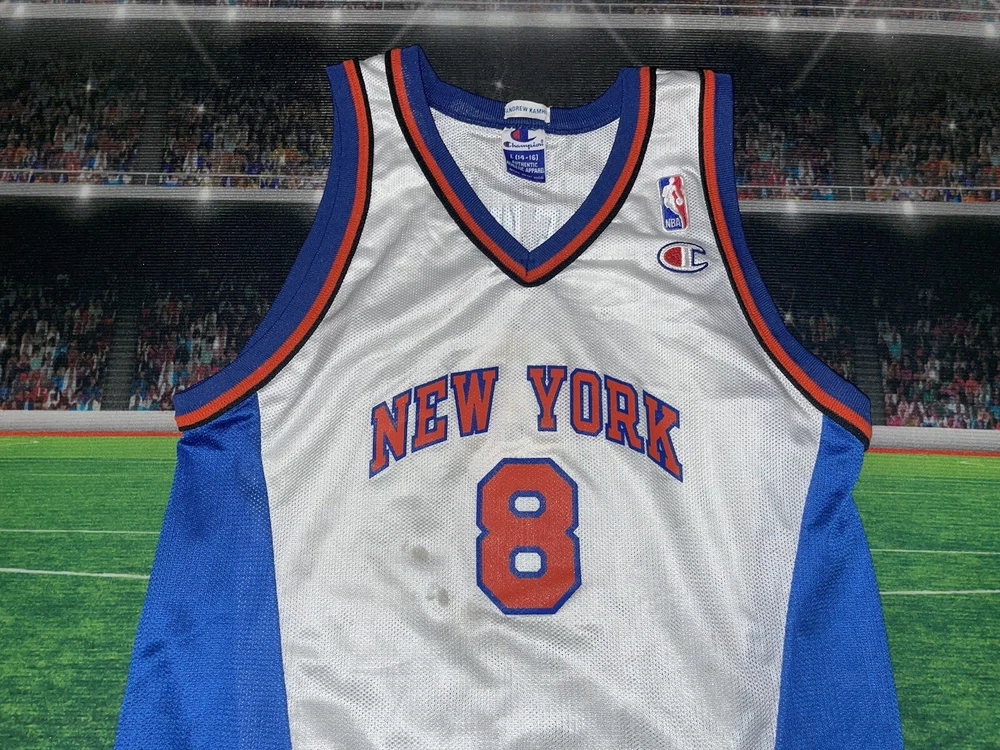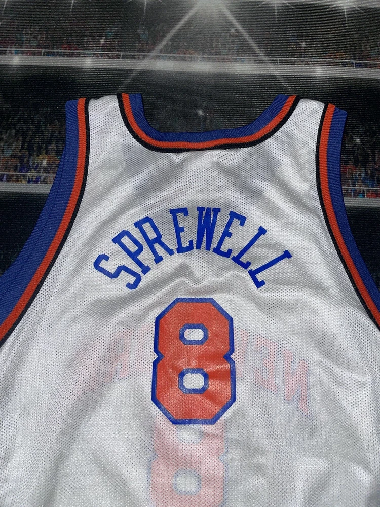 This vintage Champion jersey features Latrell Sprewell's number 8 for the New York Knicks in white. The jersey is officially licensed by the National Basketball Association (NBA) and is perfect for any basketball fan. It is made for boys in size large and is ideal for regular season games. The jersey is a great addition to any sports memorabilia collection and is perfect for wearing to games or displaying in a fan cave. Note: lite spot