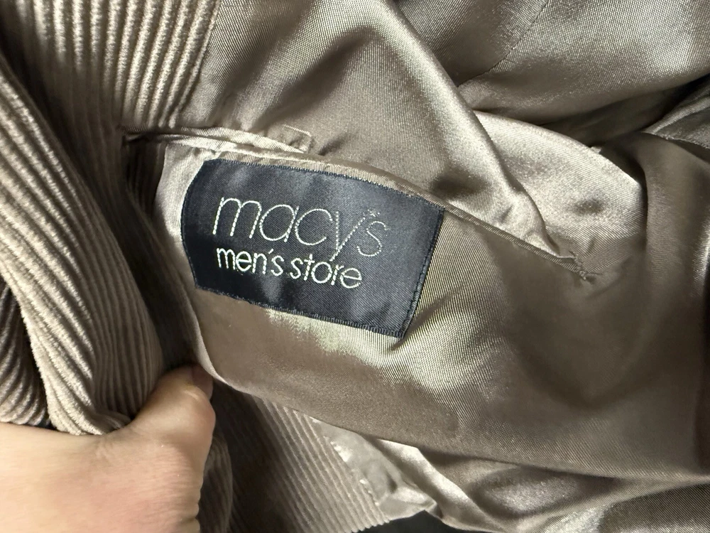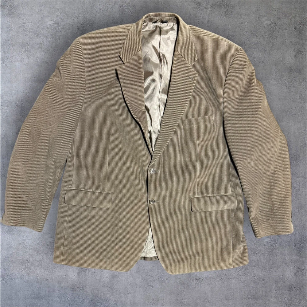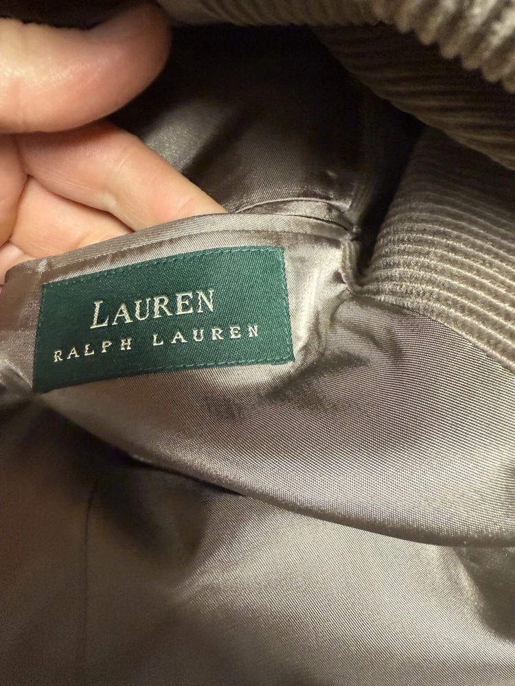 This is a vintage-inspired Lauren Ralph Lauren blazer in brown corduroy, suitable for occasions like casual outings or business settings. The blazer is crafted in a regular fit with a single-breasted design featuring a two-button front and a notch lapel style. It has a single-vented back and a regular length, offering a classic and timeless look. The blazer also includes inner pockets for added functionality and is made from a blend of polyester, nylon, and spandex with a cotton lining material, ensuring both style and comfort for the wearer.