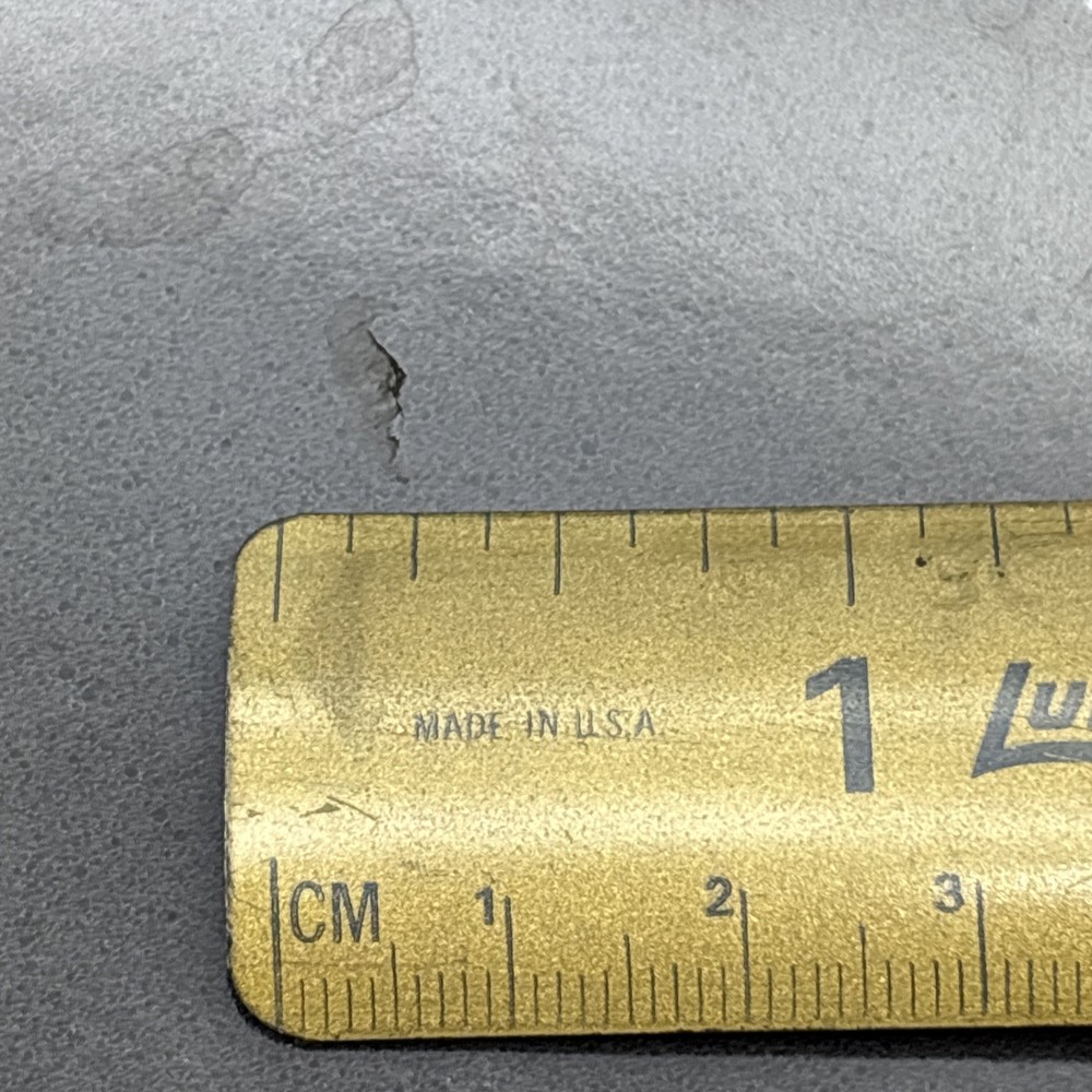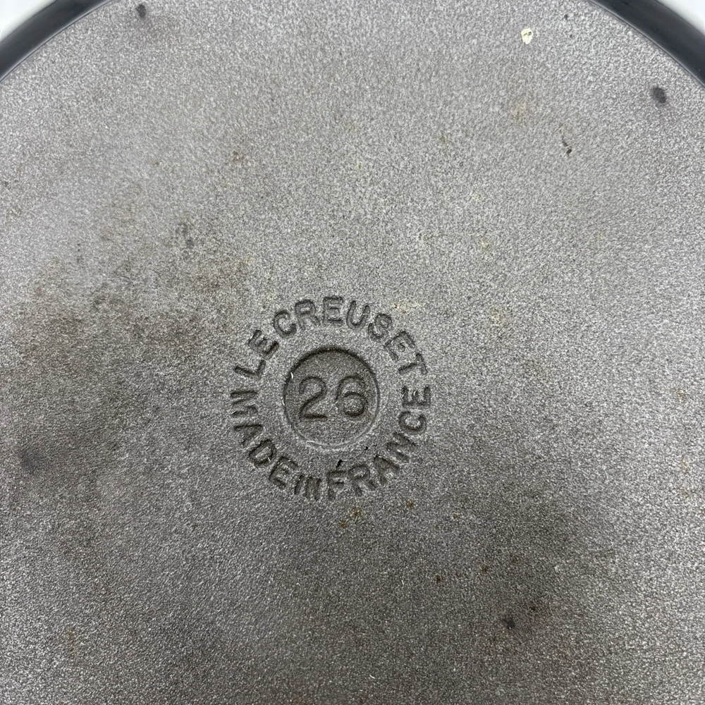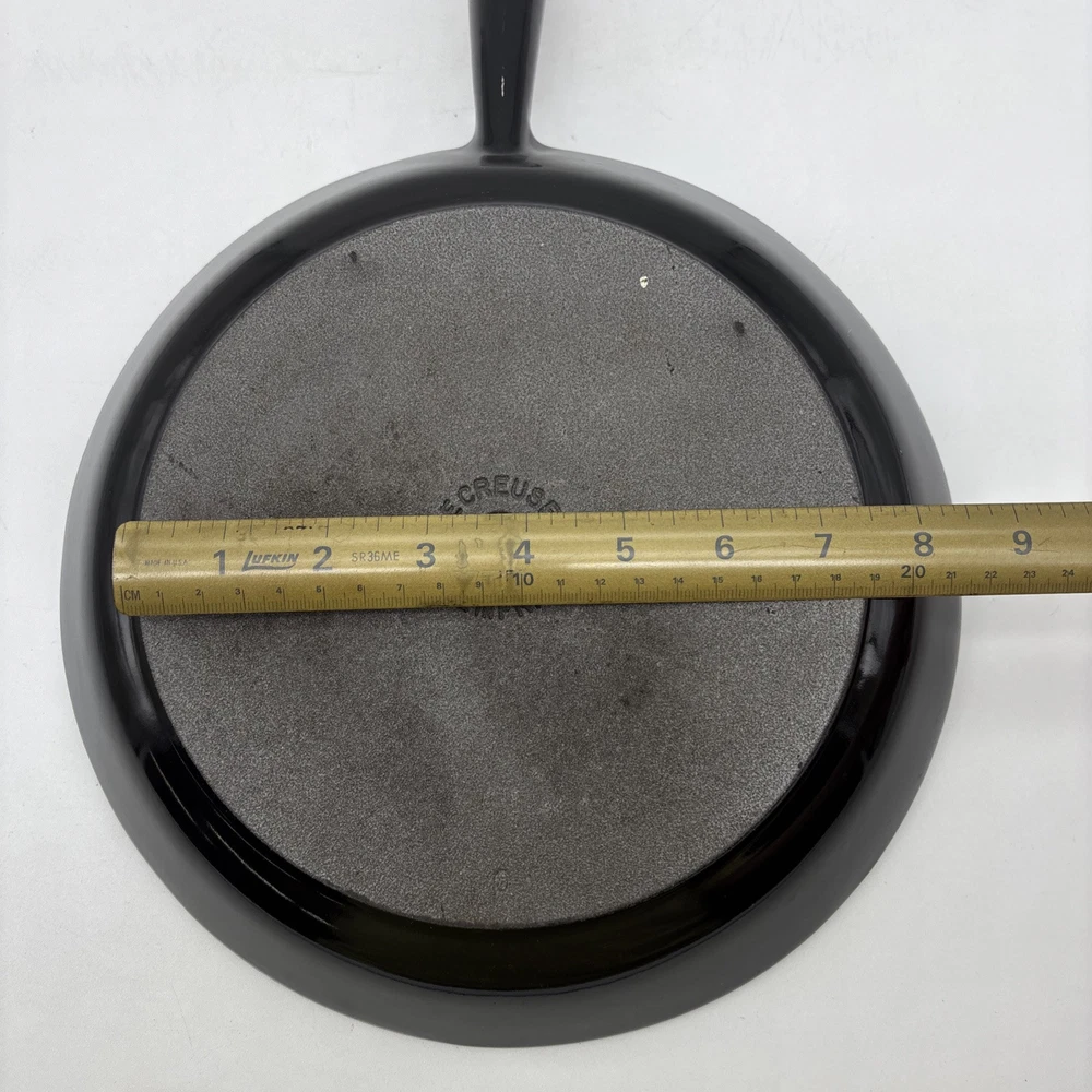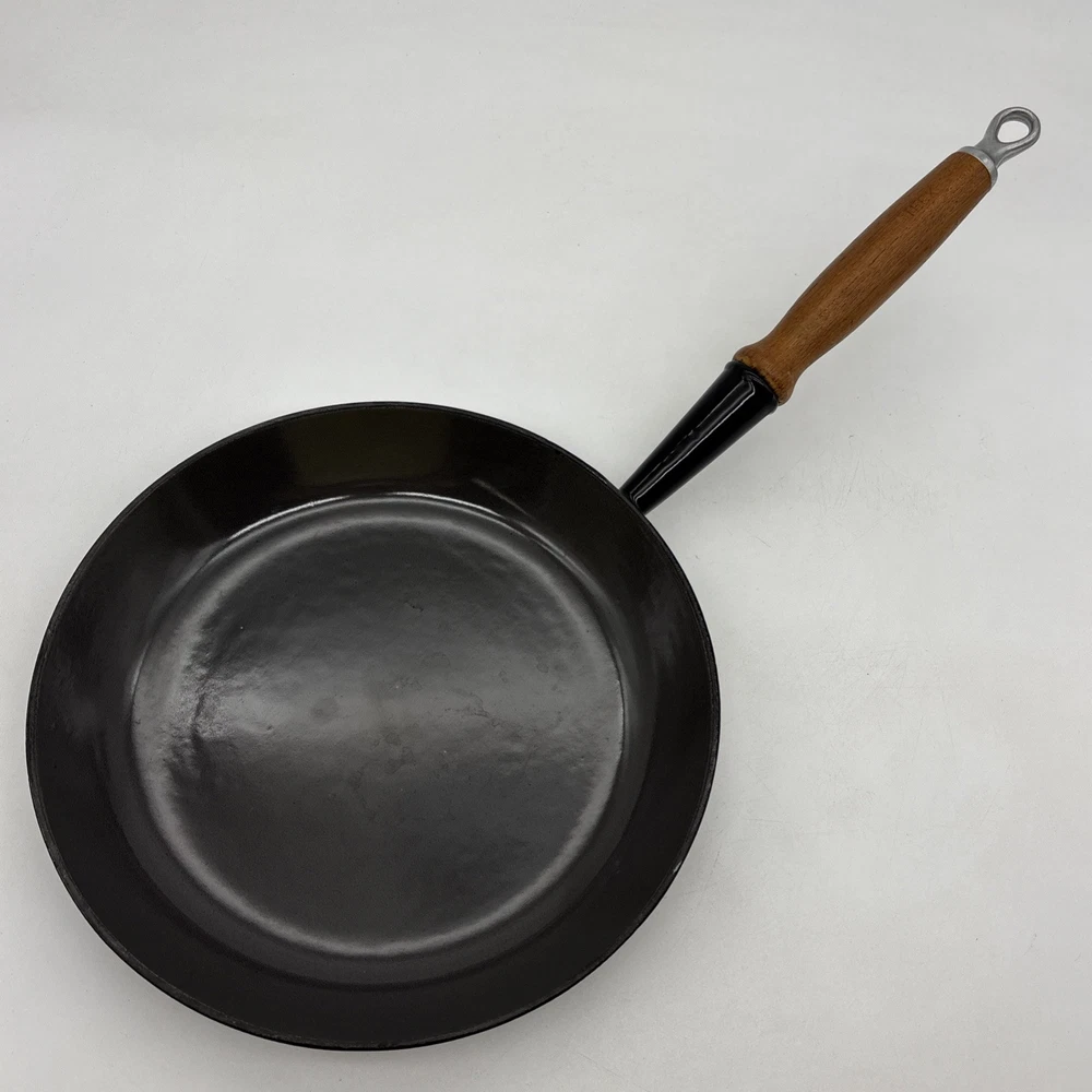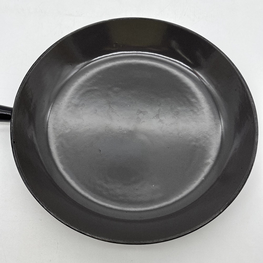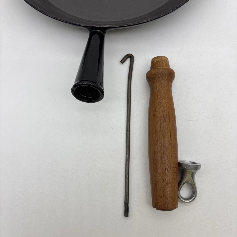 Pan is warped and rocks slightly from front to back. There is also a small chip in the enamel on the inside bottom of the pan. Please see pictures. Otherwise, the enamel is in fantastic shape! Pan features a long wooden handle. Ships with handle detached.