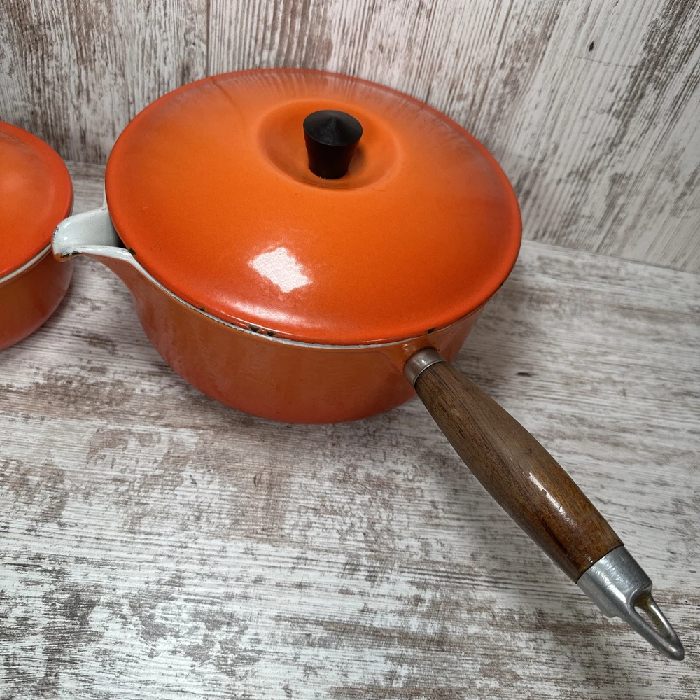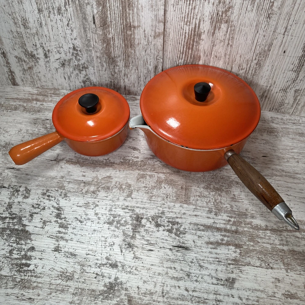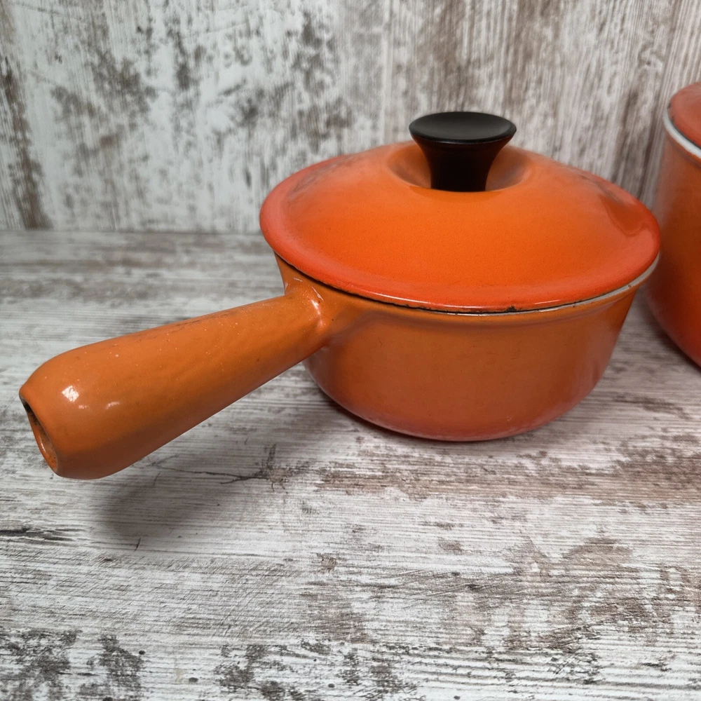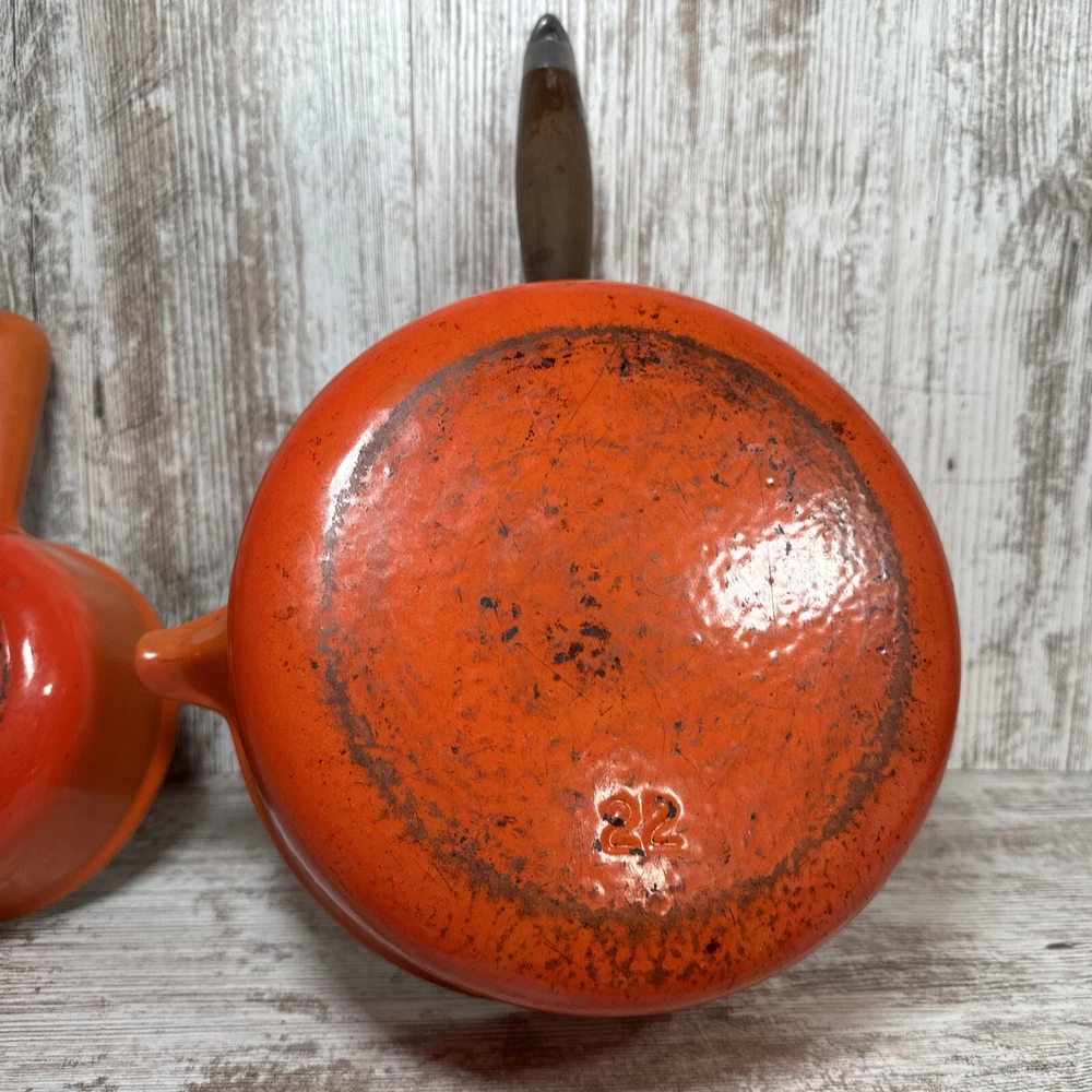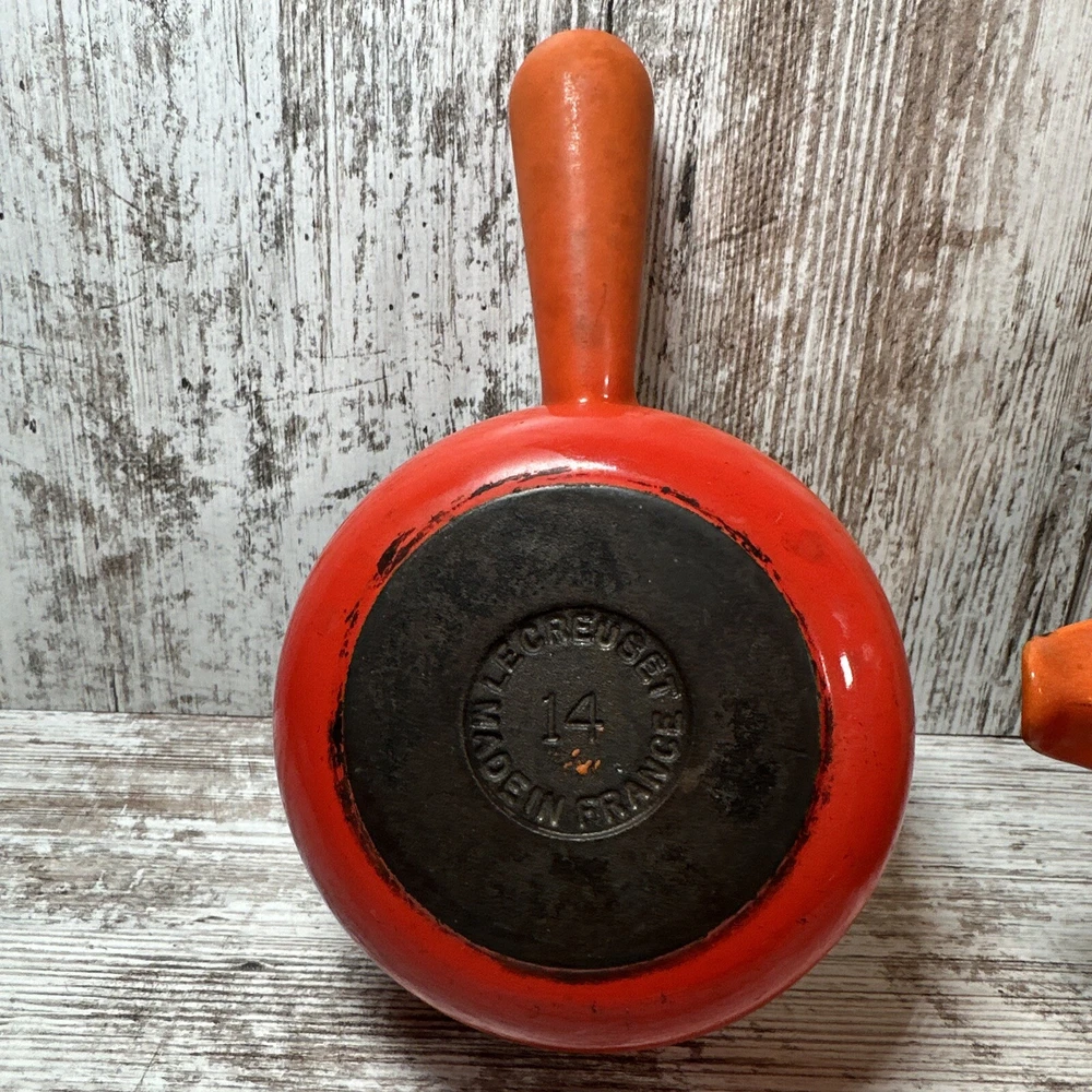 Vintage Le Creuset Flame Orange #14 and #22 Sauce pan - Set of 2 with Lids. Little sticky in some spots. Just needs a good cleaning. Please see photos Ready2Rummage Thank you so much for taking the time to view our item today. Everything you find in our eBay store was handpicked by either my husband or myself. We are a very small business and we enjoy bringing you all the cool/useful items we find when out on our auction date nights. Most items we offer are vintage and used, some are Vintage New Old Stock (NOS). All Items are Sold As Is/ As Found. We do our best to give you a ton of photo shots so you can get a clear description of what it looks like. I find that pictures are better than words most times. So if you need a photo of a certain angle or maybe a measurement that I missed, reach out... I am happy to help. I want to make sure you have all the information you can get before you buy. We try to point out any unnatural damage or flaws that we see with accuracy and honesty. However, we are human and we may miss something so please don't hesitate to reach out to us after you receive the item and send us photos if you find any issues that were not clearly shown in the listing. -PAYMENTS- Please pay for your purchase as soon as possible to ensure fast shipping. If you need to wait a couple days to make the payment, please shoot me a message so I know to hold it for you. Any items unclaimed and unpaid will be put back on the shelf after 3 days. -SHIPPING- I am centrally located in the US so my shipping time should be faster and my shipping/handling prices should be better. I do send out daily discounts and accept reasonable offers to help offset the shipping prices. I ship with USPS, UPS and every now and then FedEx. ** All items are packed with care as you can see from my exceptional feedback.** Orders are usually processed within 1 business day; exceptions are only for extenuating circumstances. Sometimes I put 3 day shipping so that I have time to locate proper and safe packaging for your item or if I am on vacation for a couple days. Typically the items go out same day. Items purchased late in the day (CST) will be processed the next business day. I do accept orders from outside of the country, but I only run them through the eBay Global Shipping Program. Make sure your address is correct in the eBay system. I will only ship to the address you have on file with eBay. -RETURNS/REFUNDS- We lean on eBay return policies to help not only protect our buyers, but also ourselves. If you need to make a return, please reach out quickly so we can promptly get you taken care of. Refunds are processed within 2-4 days after the item is delivered back to me. I video record opening all my return packages in case there is ever a situation that needs to be turned into the eBay fraud team. I would encourage you to do the same on your packages. -CONTACT US- We take pride in taking care of our customers and do everything in our power to make sure they are satisfied! If you are not satisfied with your purchase please reach out to me to make it right before you leave a negative or neutral feedback. We are a small family operation and we are always very cautious about scammers trying to pull a fast one on us, but if you have a legitimate issue and everything falls within the eBay guidelines, I am always available to help find a solution for my customers needs by contacting the eBay customer service to find the appropriate solution. Don't hesitate to reach out. Thanks!