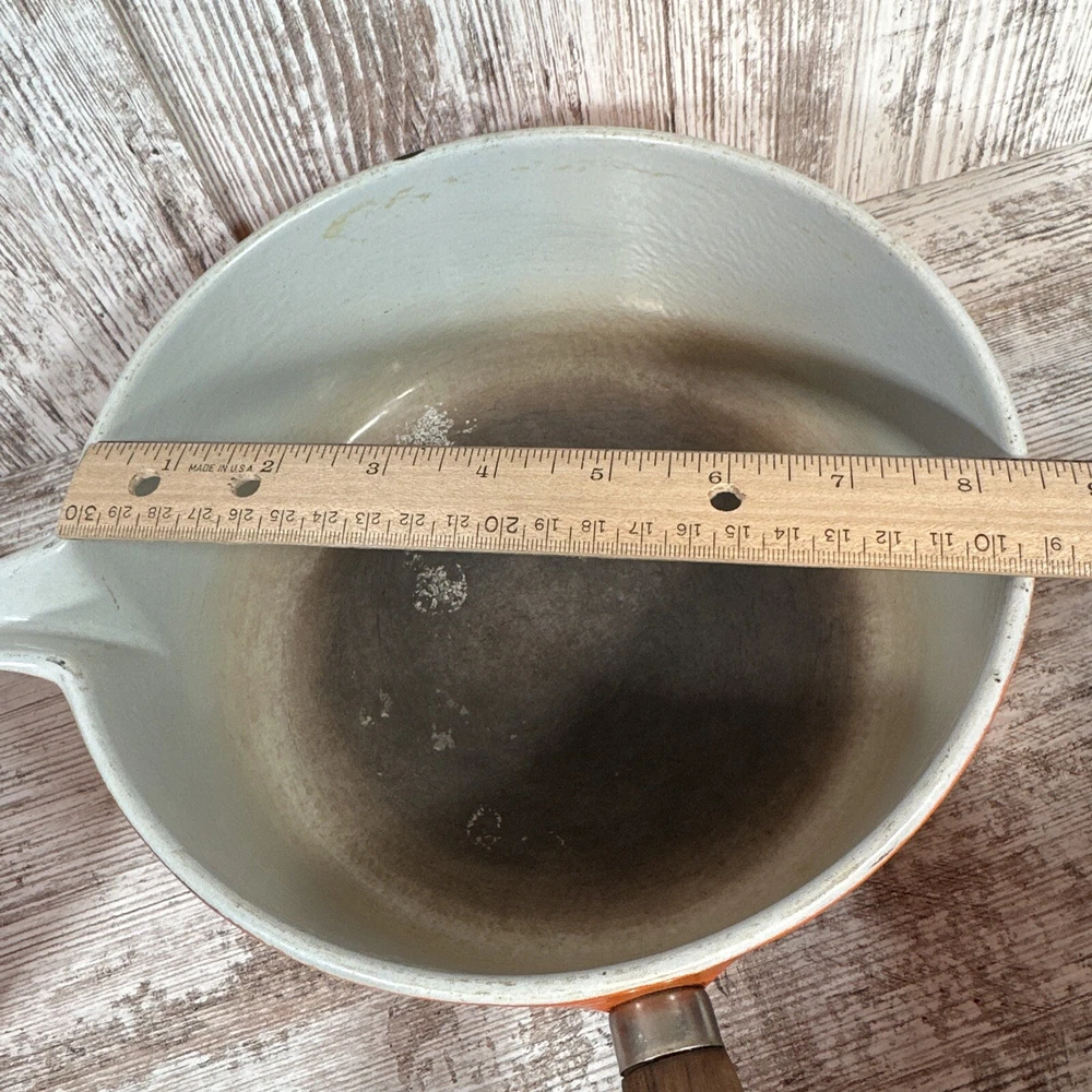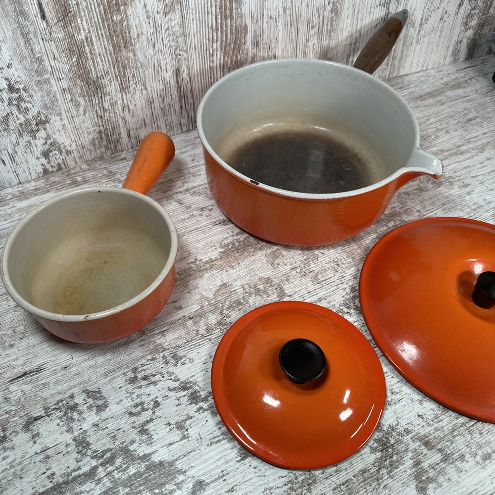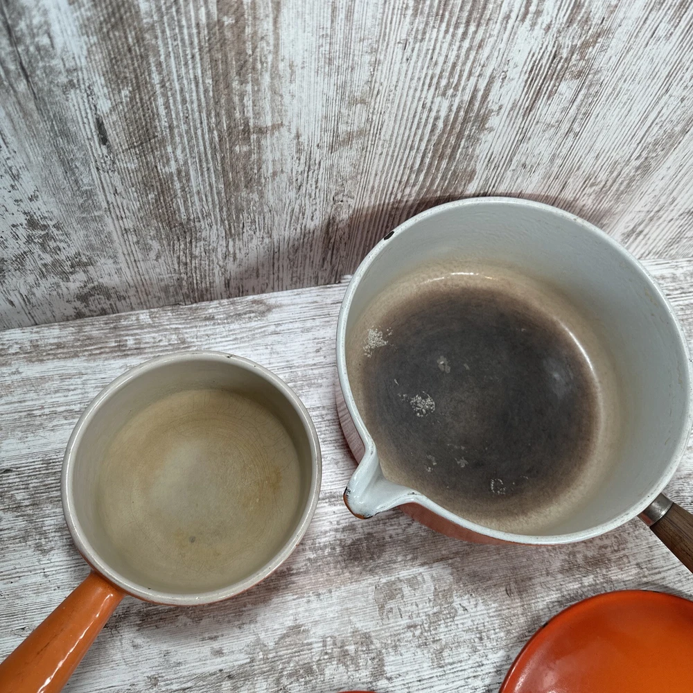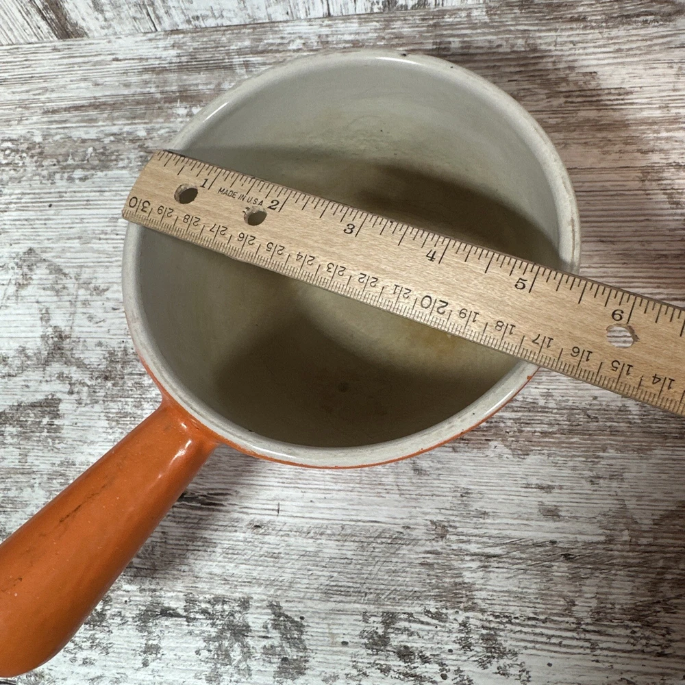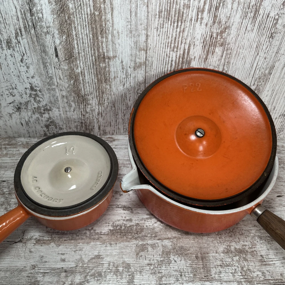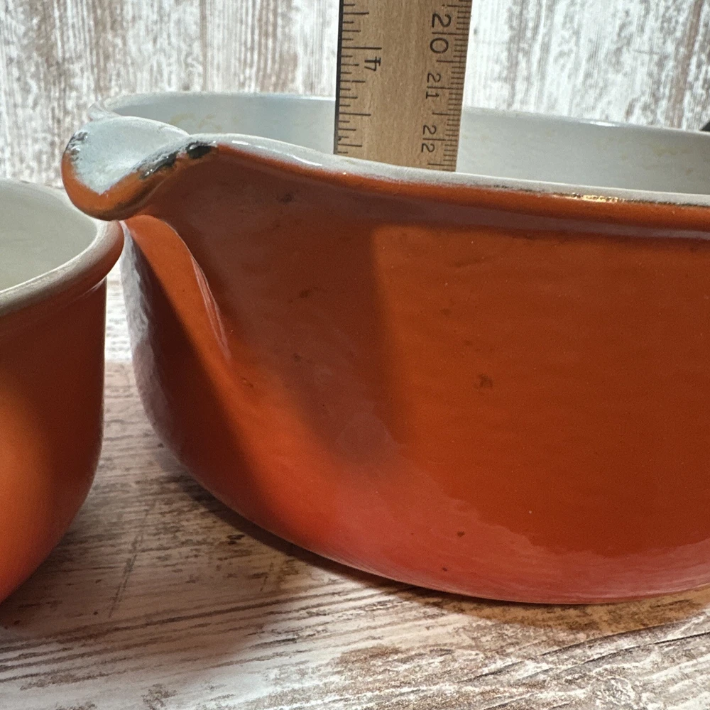 Vintage Le Creuset Flame Orange #14 and #22 Sauce pan - Set of 2 with Lids. Little sticky in some spots. Just needs a good cleaning. Please see photos Ready2Rummage Thank you so much for taking the time to view our item today. Everything you find in our eBay store was handpicked by either my husband or myself. We are a very small business and we enjoy bringing you all the cool/useful items we find when out on our auction date nights. Most items we offer are vintage and used, some are Vintage New Old Stock (NOS). All Items are Sold As Is/ As Found. We do our best to give you a ton of photo shots so you can get a clear description of what it looks like. I find that pictures are better than words most times. So if you need a photo of a certain angle or maybe a measurement that I missed, reach out... I am happy to help. I want to make sure you have all the information you can get before you buy. We try to point out any unnatural damage or flaws that we see with accuracy and honesty. However, we are human and we may miss something so please don't hesitate to reach out to us after you receive the item and send us photos if you find any issues that were not clearly shown in the listing. -PAYMENTS- Please pay for your purchase as soon as possible to ensure fast shipping. If you need to wait a couple days to make the payment, please shoot me a message so I know to hold it for you. Any items unclaimed and unpaid will be put back on the shelf after 3 days. -SHIPPING- I am centrally located in the US so my shipping time should be faster and my shipping/handling prices should be better. I do send out daily discounts and accept reasonable offers to help offset the shipping prices. I ship with USPS, UPS and every now and then FedEx. ** All items are packed with care as you can see from my exceptional feedback.** Orders are usually processed within 1 business day; exceptions are only for extenuating circumstances. Sometimes I put 3 day shipping so that I have time to locate proper and safe packaging for your item or if I am on vacation for a couple days. Typically the items go out same day. Items purchased late in the day (CST) will be processed the next business day. I do accept orders from outside of the country, but I only run them through the eBay Global Shipping Program. Make sure your address is correct in the eBay system. I will only ship to the address you have on file with eBay. -RETURNS/REFUNDS- We lean on eBay return policies to help not only protect our buyers, but also ourselves. If you need to make a return, please reach out quickly so we can promptly get you taken care of. Refunds are processed within 2-4 days after the item is delivered back to me. I video record opening all my return packages in case there is ever a situation that needs to be turned into the eBay fraud team. I would encourage you to do the same on your packages. -CONTACT US- We take pride in taking care of our customers and do everything in our power to make sure they are satisfied! If you are not satisfied with your purchase please reach out to me to make it right before you leave a negative or neutral feedback. We are a small family operation and we are always very cautious about scammers trying to pull a fast one on us, but if you have a legitimate issue and everything falls within the eBay guidelines, I am always available to help find a solution for my customers needs by contacting the eBay customer service to find the appropriate solution. Don't hesitate to reach out. Thanks!