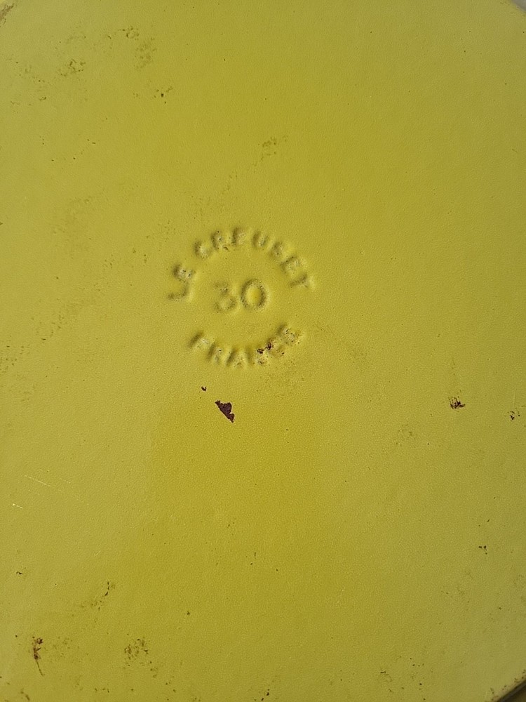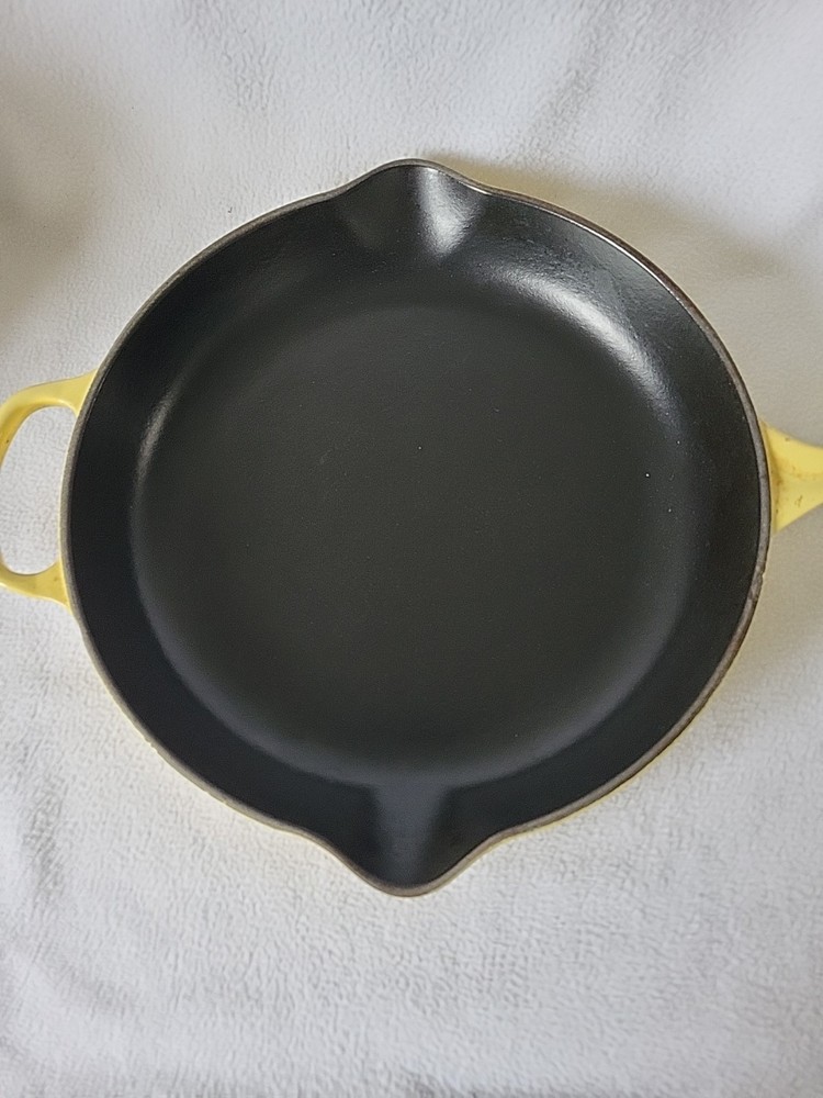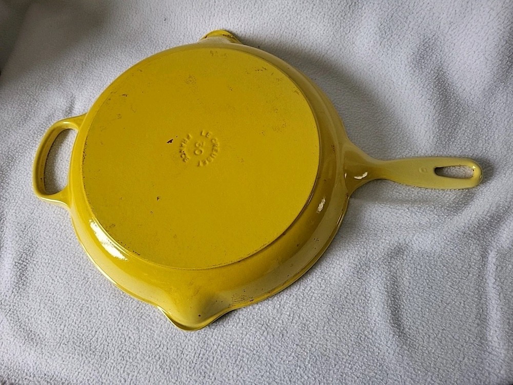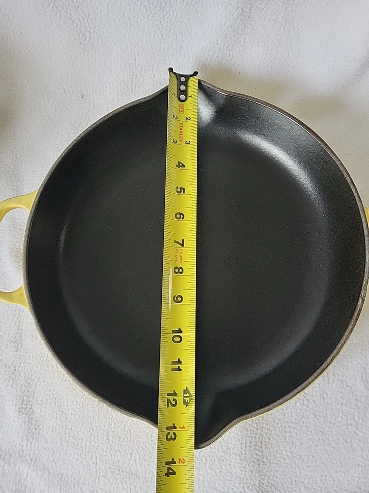 This is a vintage Le Creuset France #30 skillet/griddle, measuring 12 inches in diameter and made of yellow and black enameled cast iron. It is designed for use on induction, electric, or gas stoves, featuring a round shape and a skillet/griddle combination. This collectible piece is an original Le Creuset item, weighing approximately 5 lbs 4oz, with a surface coating of enamel and a vintage design that adds to its charm. Skillet is in good Pre-owned condition, please see photos before buying Thank you for looking at my other stuff Please follow 🤙