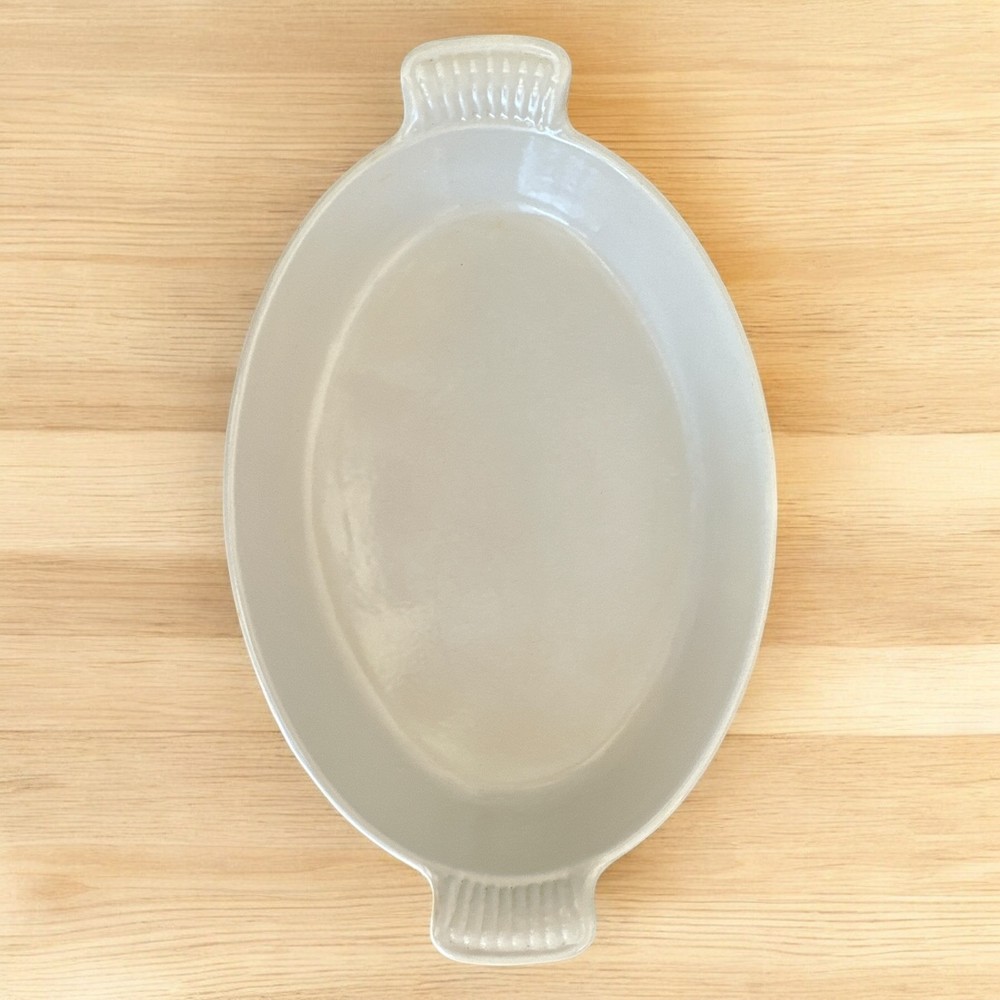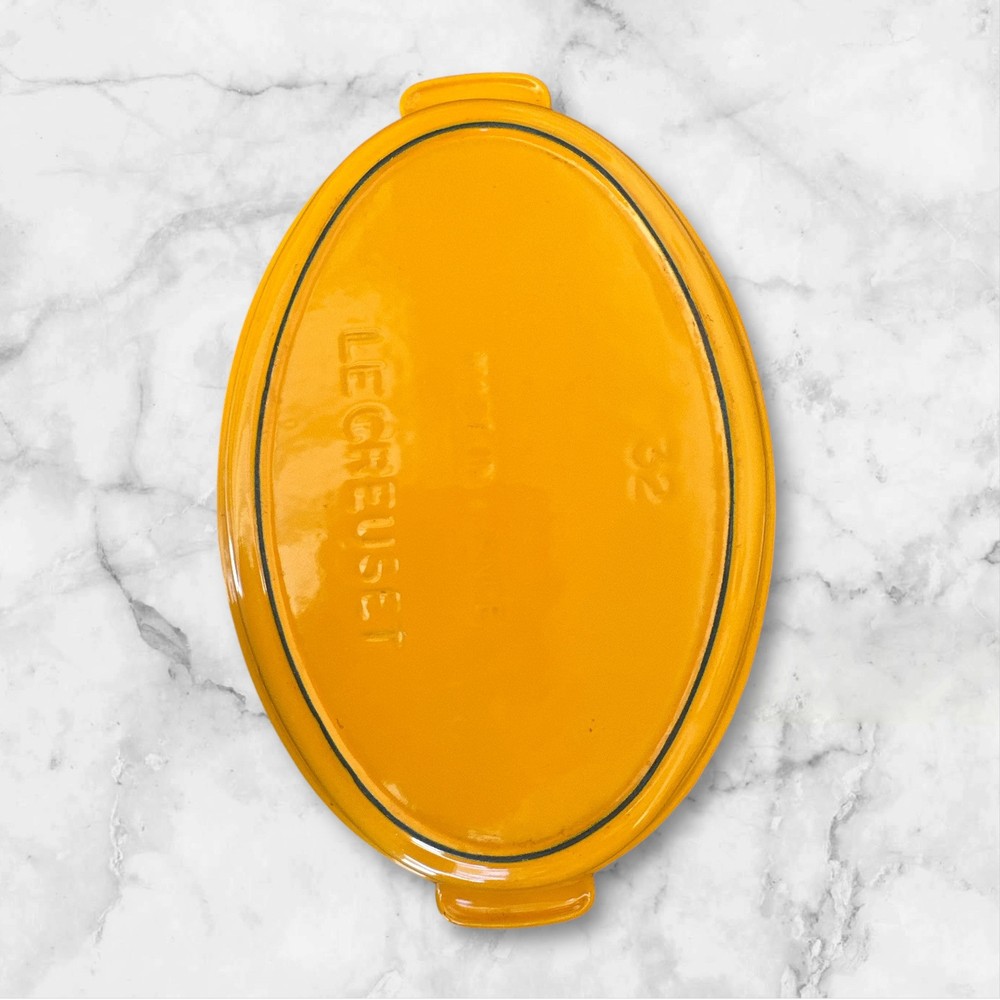 Vintage Le Creuset #32 Yellow Oval Casserole Baking Dish from France. Made of cast iron with enamel coating, this casserole dish is electric and gas stove compatible. It features a flat bottom, double handles, and is oven-safe. This piece is an original Le Creuset product, making it a collectible cookware item for any kitchen. 14.75” L - handle to handle 9.25” W 1.875” H - at center 2.5” H - at handle