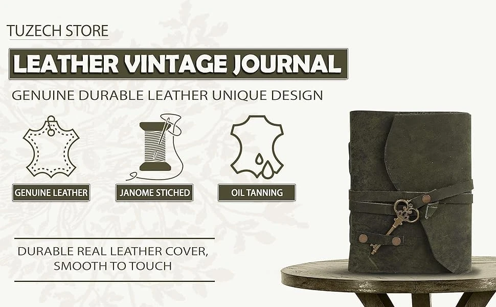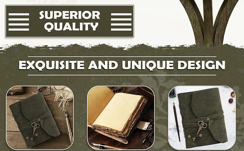How is our Vintage, Deckle-Edged Paper made? Each sheet is hand lifted, pressed, and dried with care using age-old techniques from high quality cotton rag. The result is soft, lux paper, with natural feathery deckle edges. These pieces are suitable for calligraphy, digital printing, letterpress, and light water color without bleeding or blotting. Each journal is meticulously handcrafted by skilled artisans, ensuring superior quality and attention to detail. From the stitching to the embossing, every aspect of the journal reflects the care and craftsmanship put into its creation. Crafted with meticulous attention to detail, this journal is more than just a notebook; it's a companion for capturing memories, thoughts, and dreams as you explore the world. FULL GRAIN LEATHER – Our handmade leather journal is made from full grain leather, top quality leather. Naturally oiled and tanned to hydrate the leather notebook cover and preserve its unique individuality. The old-timey appeal adds character to the material, perfect vintage journal for women and journal for men. The smooth-finish surface highlights its beauty and quality. DECKLED EDGE PAPER – Our antique brown mens journal for writing has 200 deckle edge paper. The herbal-colored calligraphy paper creates a timeless color and a rustic touch to the small journal. The thick aged paper will not bleed through with any type of pen or painting medium. Made with hand-pressed cotton paper to create a subtle texture, ideal journals for writing, journaling, painting, sketching, etc. DURABLE LEATHER STRAP - The daily notebook journal is handcrafted by artisan. Its sturdy leather string keeps the pocket journal cover and pages in place, it complements the superior craftsmanship that goes into this old-looking leather notebook to write in. Great journals for women who are on-the-go, a classic pocket notebook or travel journal for men who love to go on adventures. SIZED FOR MULTI-USE – These easy to carry vintage journals for writing are ideal for leather diary, junk journal, bible journal, daily journal, spell book, book of shadows, adventure journal, etc. Refer to images for product dimensions. A great gift for writers, budding poets or artists, your loved ones and yourself! Handy leather sketchbook that you can bring along, fits perfectly in your tote, backpack, handbag or purse. YOUR HAPPINESS MATTERS – We strongly believe in our products and we take pride in the craftsmanship of each soft leather bound journal. We ensure that the materials are of top quality and that each product has been handled with finesse. Your satisfaction is our highest priority, and we commit to provide quality customer experience. In case you are unsatisfied with our product, you can have full confidence in how quickly we will refund your money or offer a replacement.
