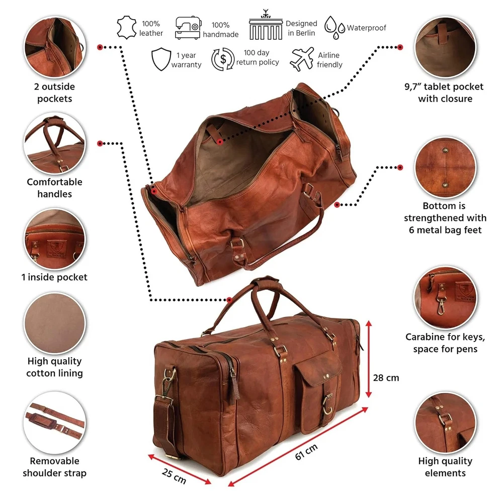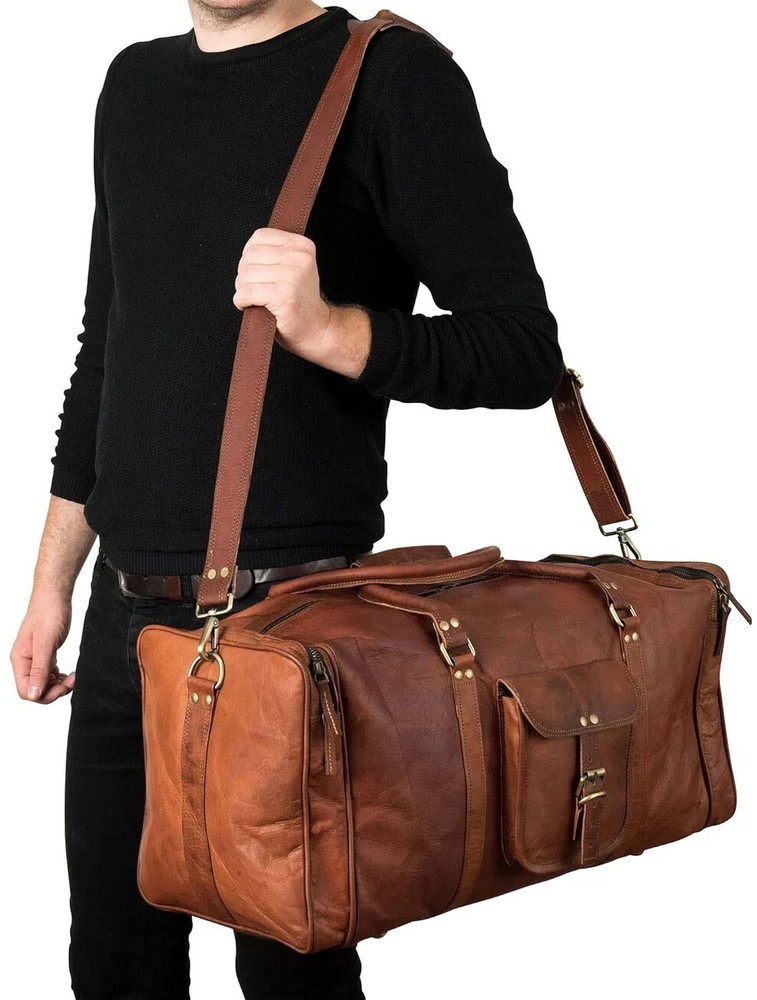 Vintage Leather Duffel Shoulder Bag -Large Travel & Gym Bag with Leather Journal Elevate your travel and everyday style with this meticulously crafted leather duffle bag, designed to cater to all your needs. Handcrafted from premium full-grain goat leather, this bag features a vintage charm and rugged durability, making it a timeless accessory for any occasion. With a thoughtful design, this bag boasts four spacious exterior pockets secured with sturdy buckles, offering both practicality and elegance. The large main compartment provides ample room for clothing and shoes, while two additional zippered side pockets are perfect for storing smaller essentials. Whether you're heading to the gym, embarking on a trip, or attending a weekend getaway, this leather duffle bag is the ideal companion. Key Features: Material: Handcrafted from premium full-grain goat leather for a rustic yet refined look. Color: Classic vintage brown, perfect for any occasion. Storage Capacity: Spacious main compartment for clothes, shoes, or larger items. Front buckled pocket for quick-access essentials. Two side zippered compartments for smaller accessories. Design: Unisex, with a detachable and adjustable shoulder strap for versatility and comfort. Hardware: High-quality brass zippers, zip sliders, and buckles add a polished finish. Available Sizes: 21” L x 10” H x 10” W Perfect for airplane carry-on or gym use. 24” L x 10” H x 10” W Great for travel, gym sessions, or vacations. Sizes in Centimeters: 53.34 L x 25.4 H x 25.4 W cm – Ideal for carry-ons and gym use. 60.96 L x 25.4 H x 25.4 W cm – Suitable for travel, gym, and longer trips. This versatile leather duffle bag isn’t just an accessory – it’s a statement of sophistication, functionality, and timeless design. Whether for personal use or as a thoughtful gift, this bag will undoubtedly leave a lasting impression. HANDMADE LEATHER JOURNAL-FREE!!!!!