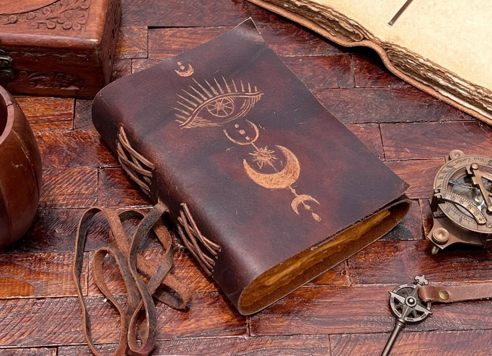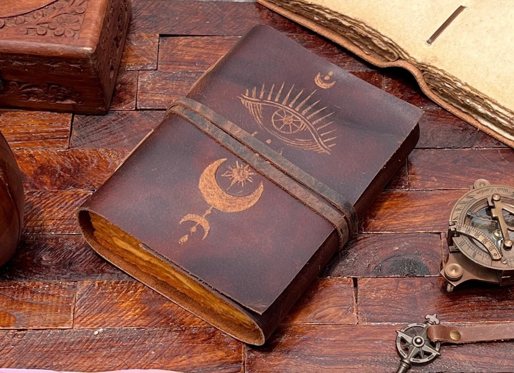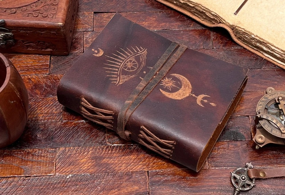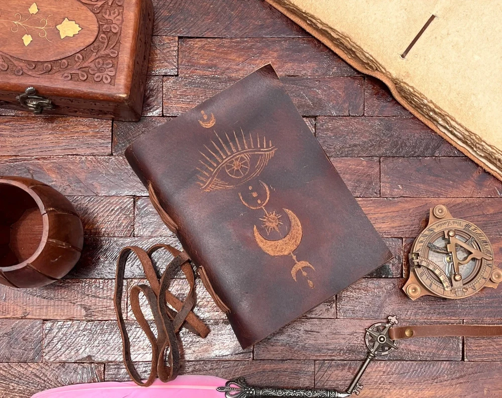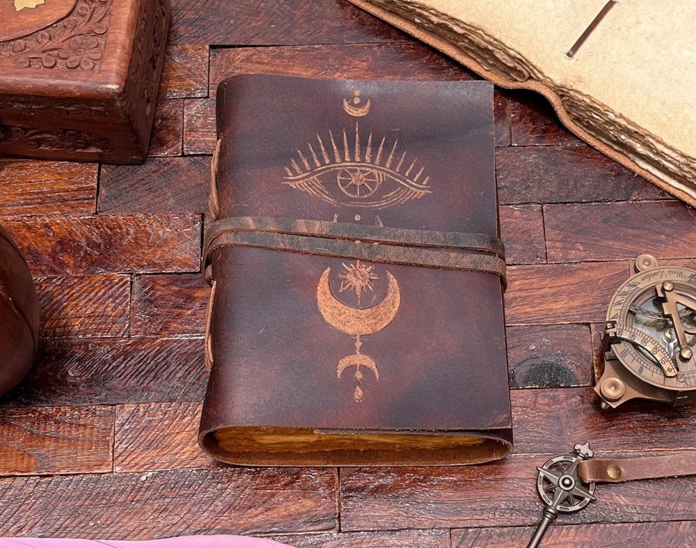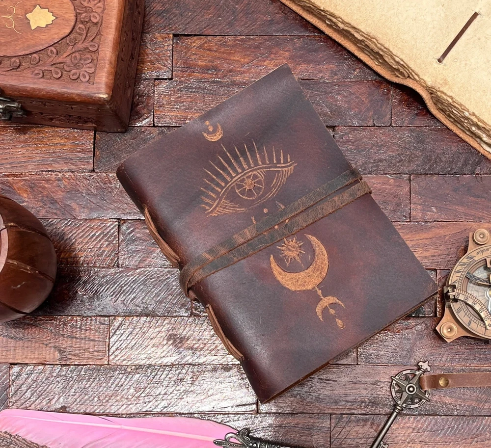Vintage Leather Travel Journal with Embossed Eye and Moon Design