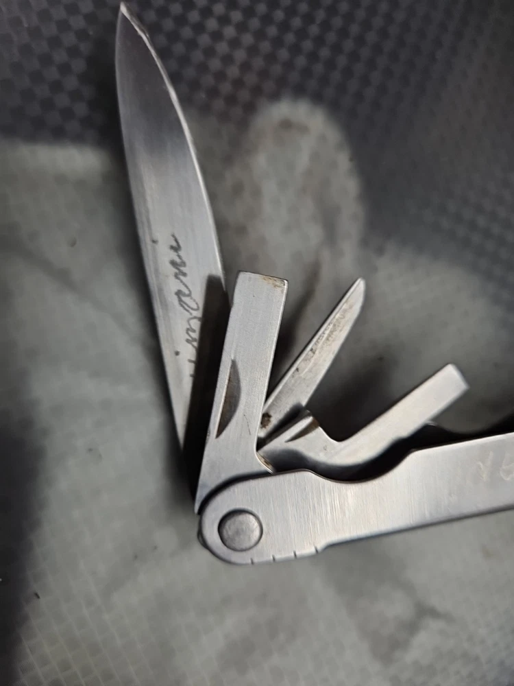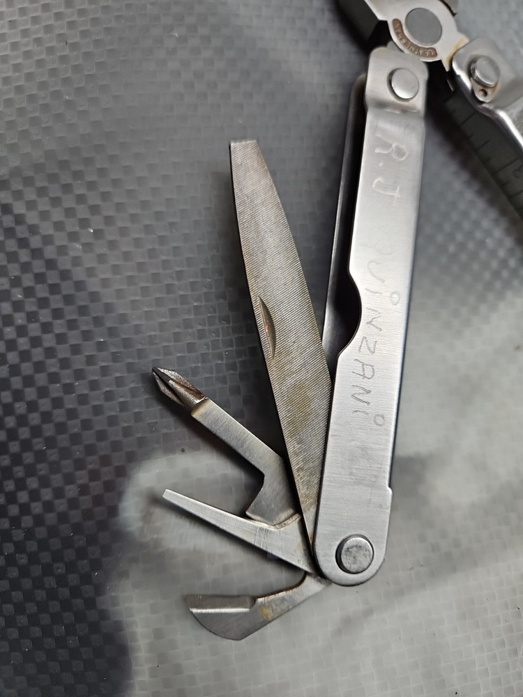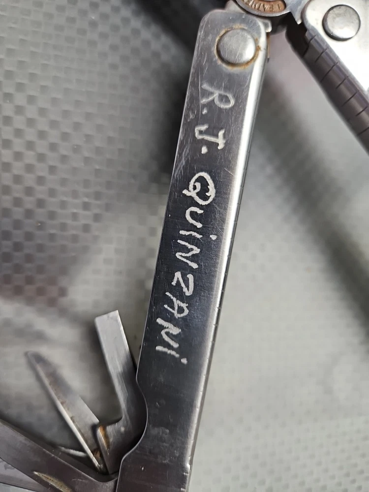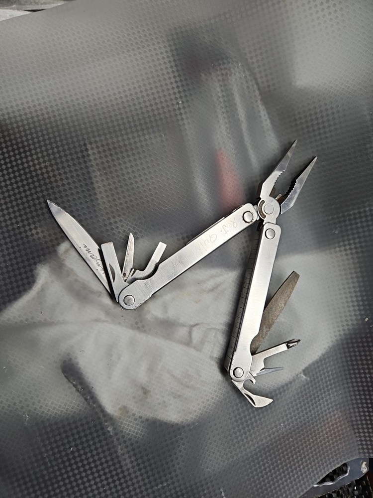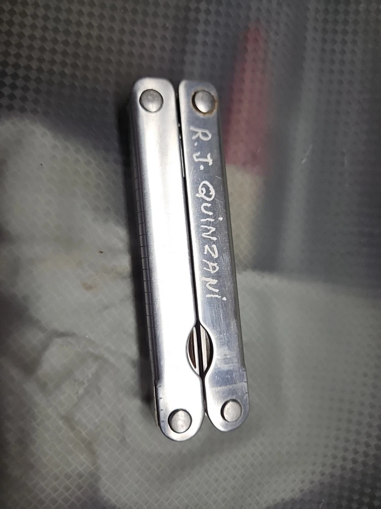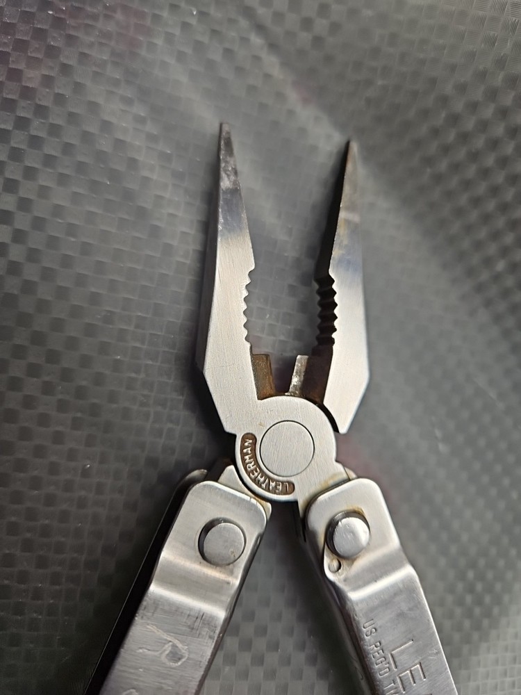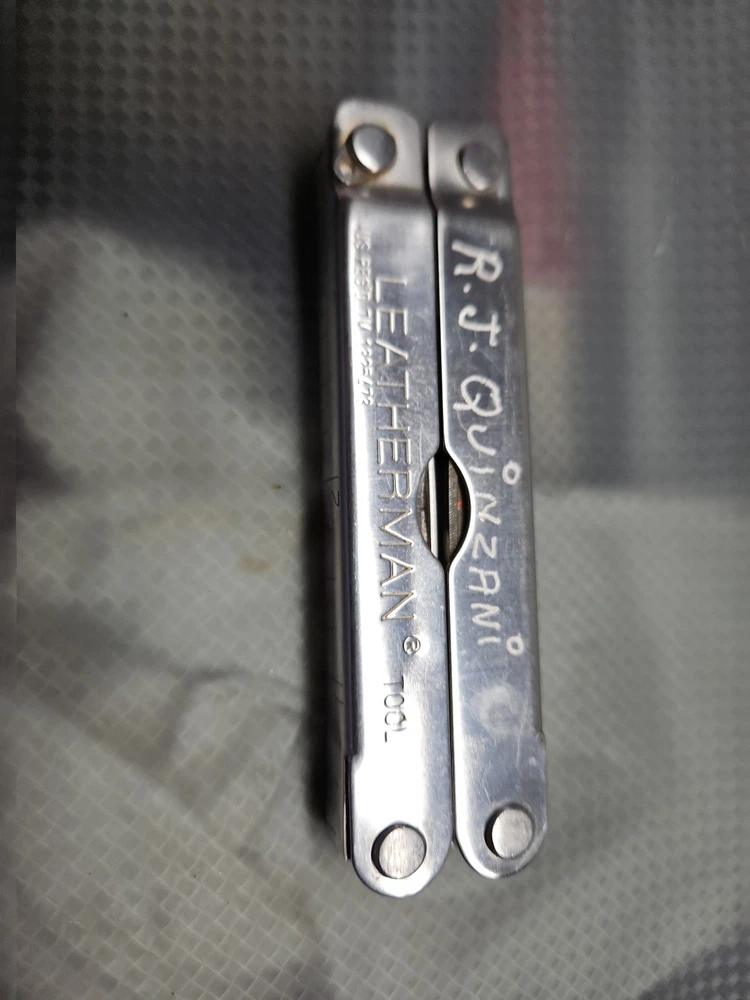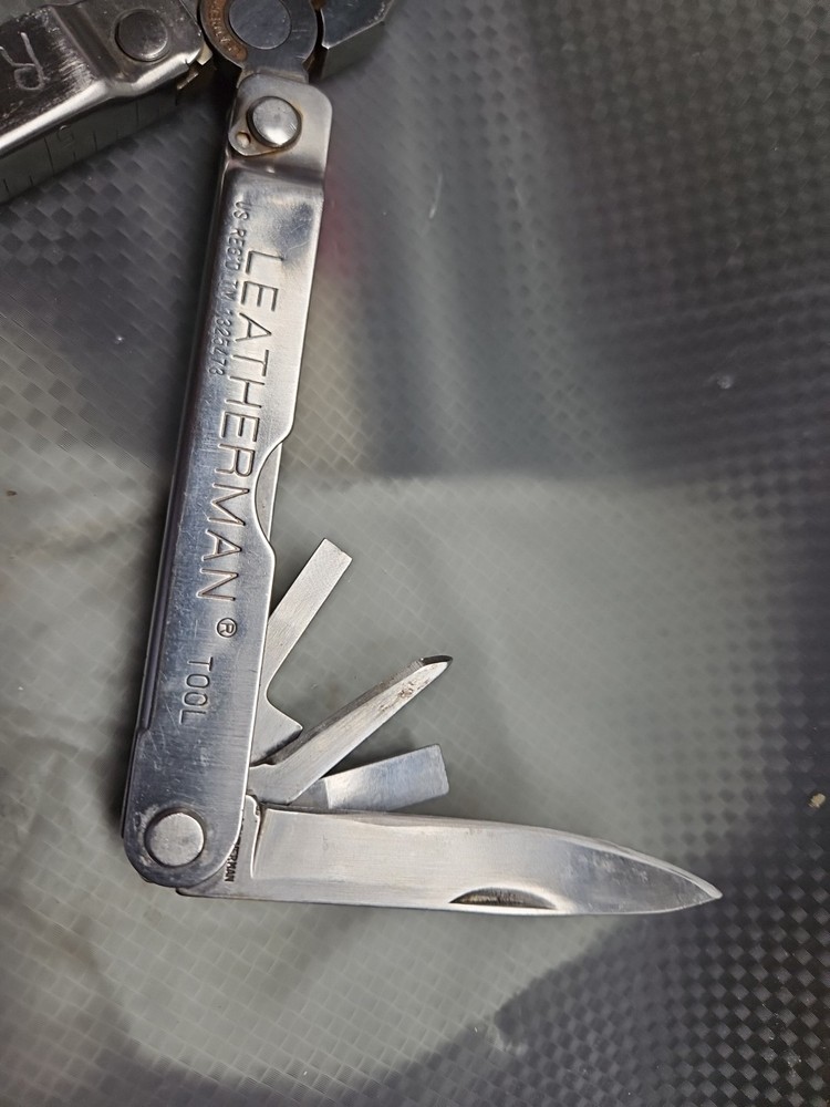 The Vintage Original Leatherman TM 1325473 Multi Tool is a versatile tool with a stainless steel construction and corrosion-resistant features. It includes 10 tools such as pliers, knives, wire cutters, rulers, screwdrivers, and more, all neatly packed in a 4-inch closed length design. The blade is straight edge and 3 inches long, making it ideal for various tasks in camping, hiking, and other outdoor activities. There are owners marks on tool. See photos.