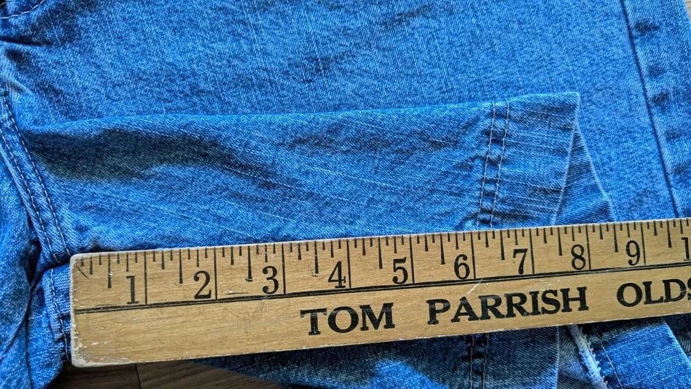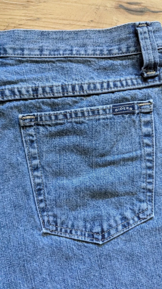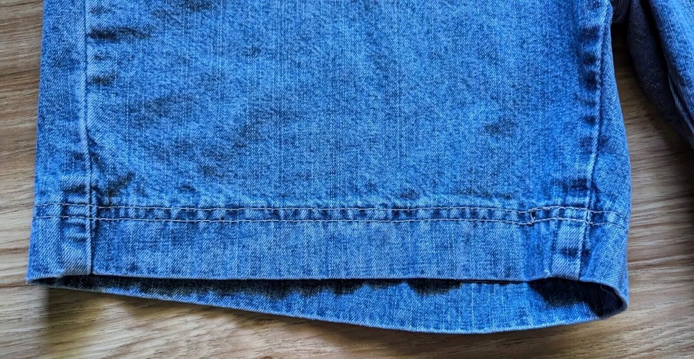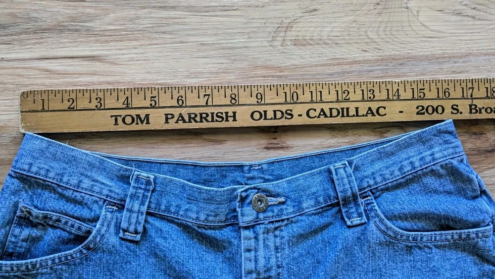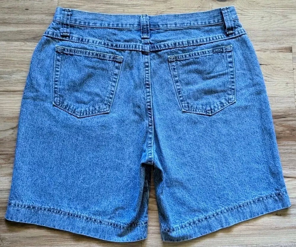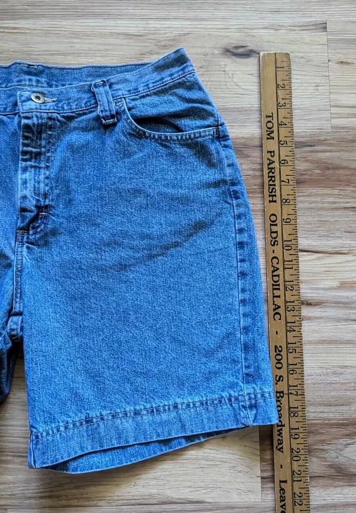 Tag size 14M. Laid flat, the waist measures approx 32 inches & inseam is about 7.5 inches. Medium wash! A few loose threads & minor fading from wash wear throughout. Nice condition!