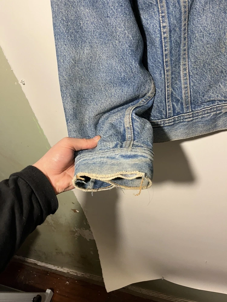 This vintage Lee Storm Rider denim jacket is a must-have for any fashion-forward man. The corduroy collar and button accents give it a Western-inspired look, while the polyester lining ensures warmth and comfort. The jacket is size L and features a trucker style, making it perfect for any casual occasion. The blue denim material and USA-themed logo make this jacket a unique addition to any wardrobe. It's perfect for those who love 80s fashion and want to stand out from the crowd. Don't miss out on this one-of-a-kind piece, made in the United States by Lee.