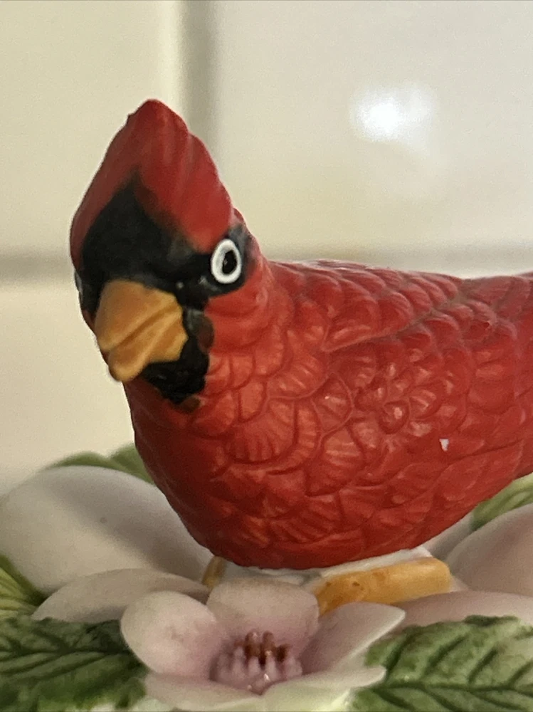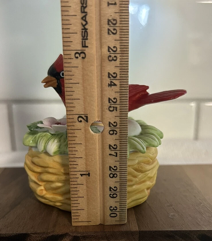 This vintage Lefton porcelain trinket box features a red cardinal bird nesting on eggs, surrounded by a beautiful and colorful design. Made in Japan in the 1970's, this small round trinket box is perfect for storing earrings, rings or any other small items. This sweet trinket box measures 3" inches tall and 2.5" inches in length. The hand-painted 3D effect and matte finish make it a unique and original addition to any vintage collection of either trinket boxes or porcelain birds. This will make a wonderful anytime gift for anyone who loves vintage items. Vintage Cardinal Bird on Nest Round Porcelain Trinket Box ~ Lefton (c) 1970's is in great vintage preowned condition, however it does show some tiny paint loss in a couple of places. However, there are NO chips, cracks or repairs. Please review all pictures for proper assessment of its vintage preowned condition.