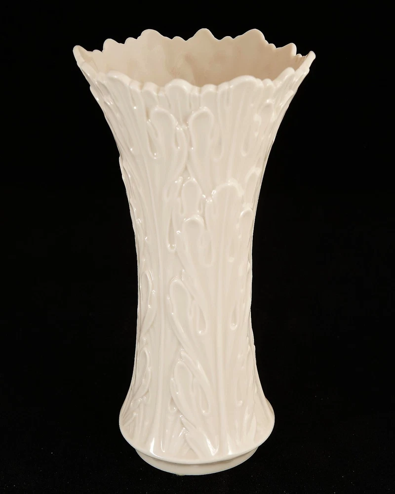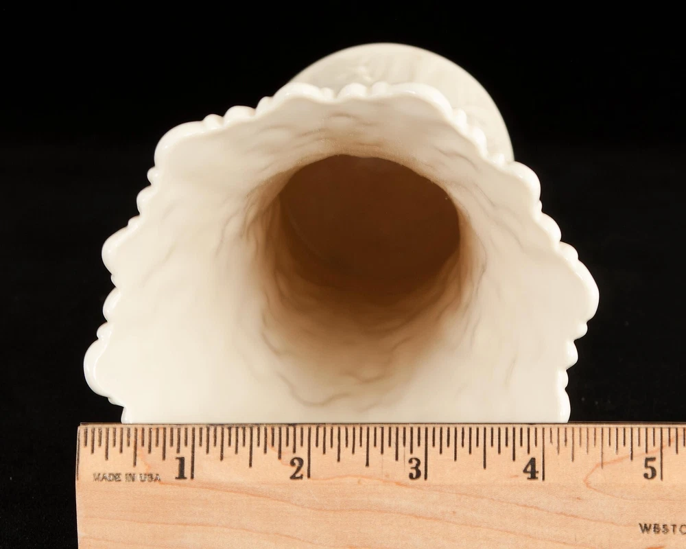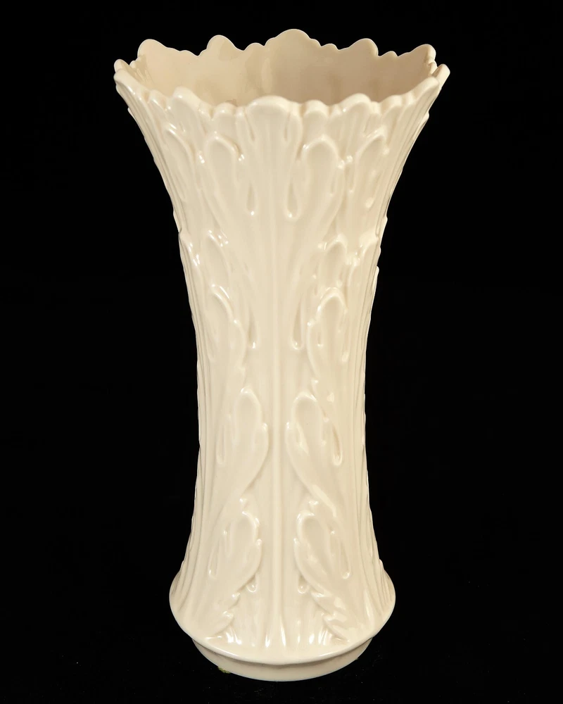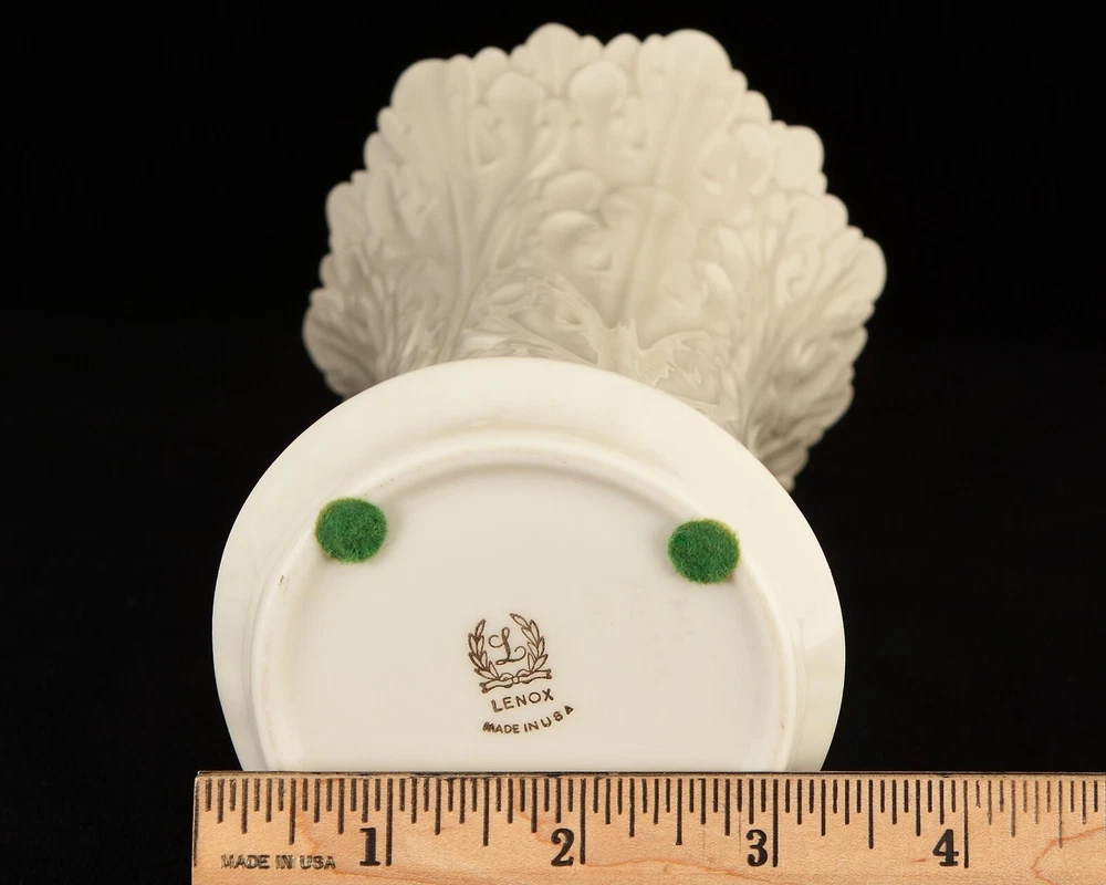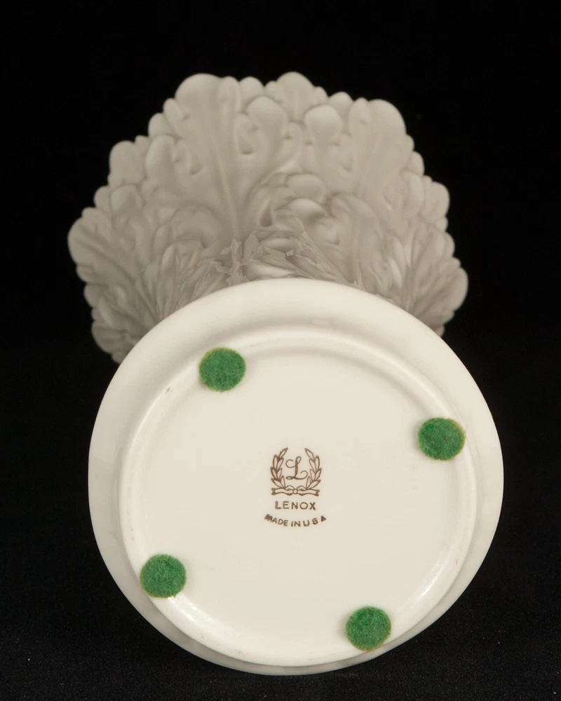 This vintage Lenox bone china vase features a Woodland Acanthus leaf pattern in ivory color. Made in the United States in the 1980s, the vase stands at 8.5 inches tall with a base width of 2.75 inches and a mouth width of 4.5 inches. The raised/scalloped design adds a traditional touch to the piece, making it perfect for all occasions And it's a unique piece of history: this piece was manufactured in the Lenox factory in Kinston, NC - before they were bought-out and production was moved overseas. The embossed finish and quality craftsmanship make this Lenox vase a beautiful and elegant addition to any decor.