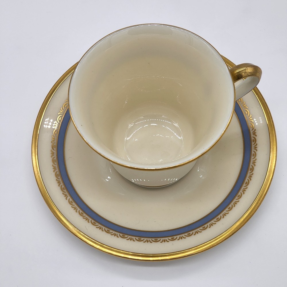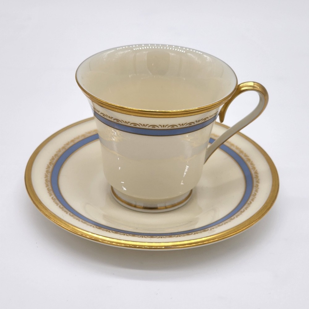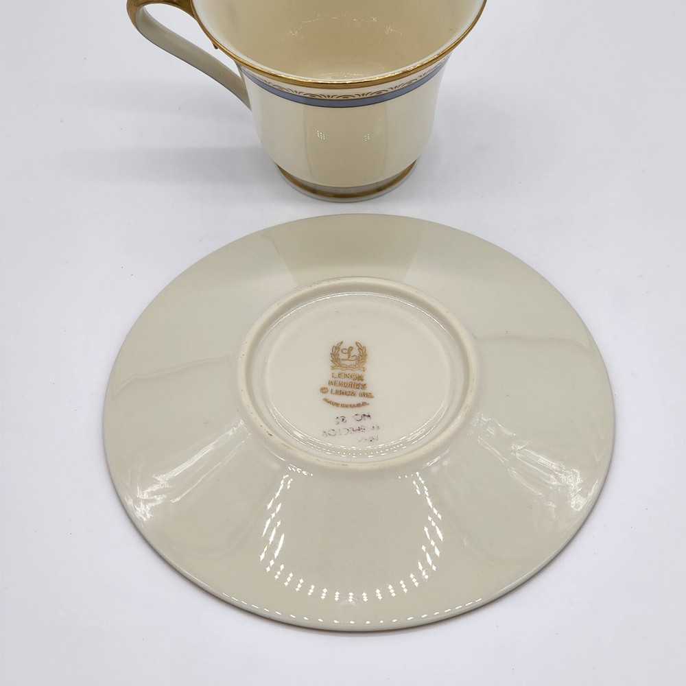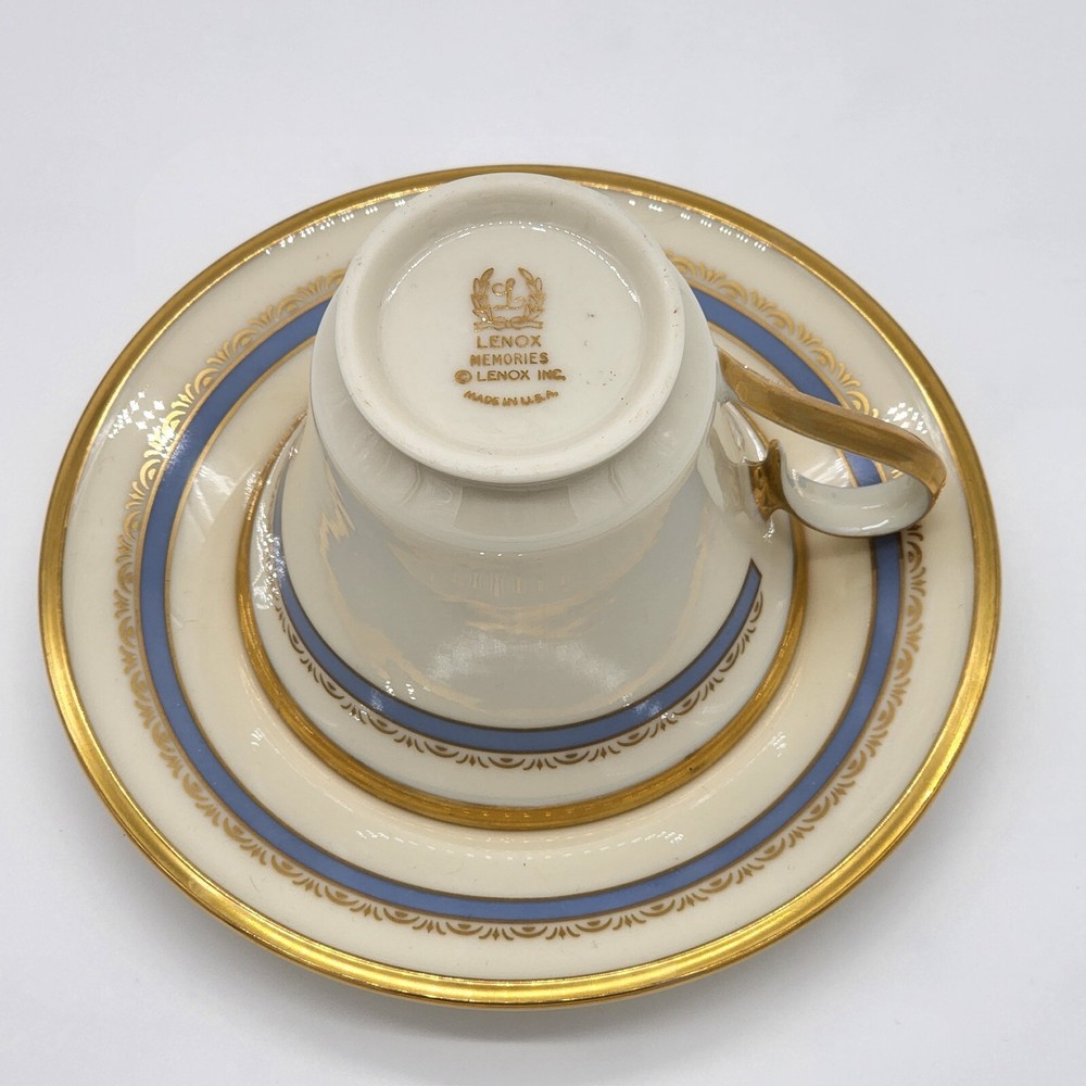Vintage Lenox Memories Footed Cup and Saucer Brand : Lenox Pattern: Memories Description: Inner Blue Band, Gold Ring and Decor Discontinued Pattern Manufactured between 1979 - 1983 Condition details : No flaws found Country of Manufacture: USA MEASUREMENTS are APPROXIMATE TAKEN IN INCHES Cup: Height 3 1/8" Width 3 5/8" Saucer: Width 6" °°° Feel free to message us with any questions