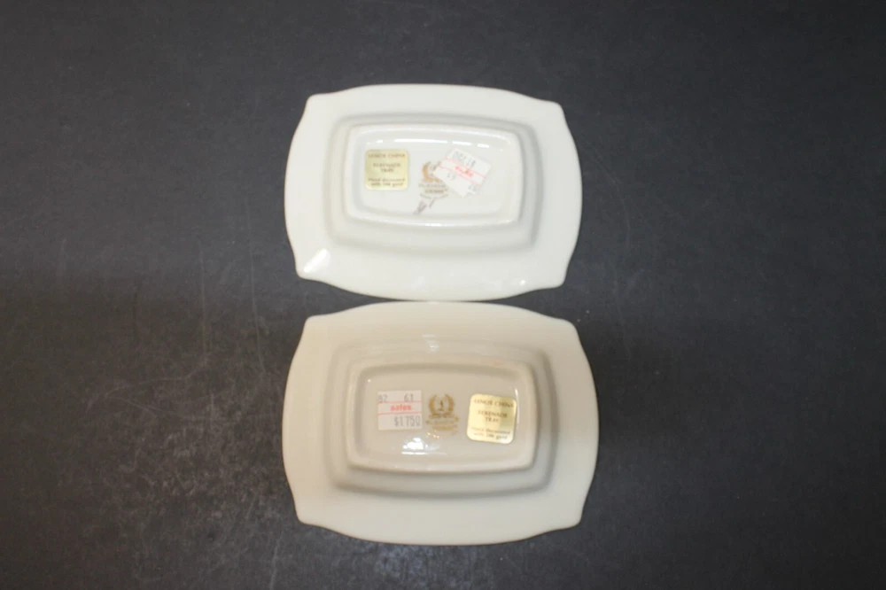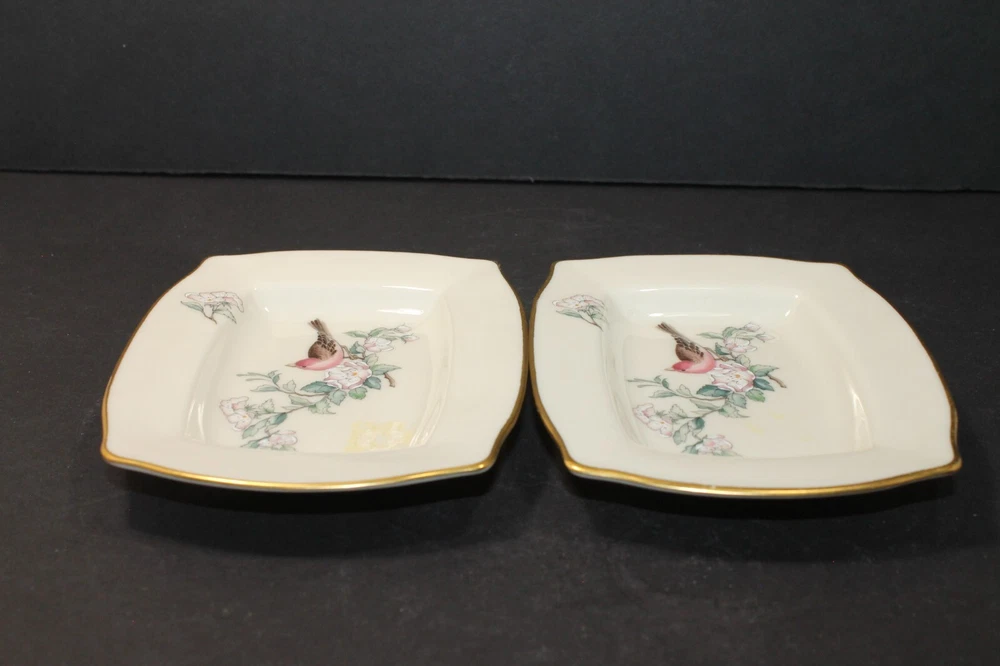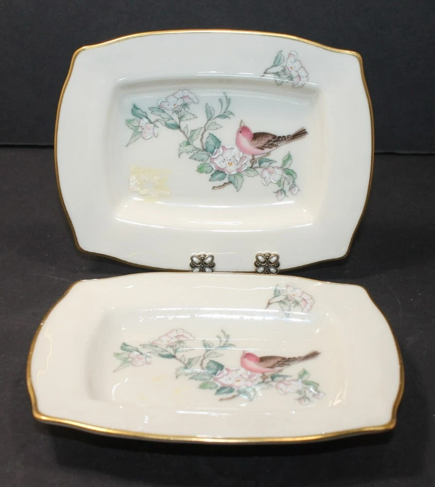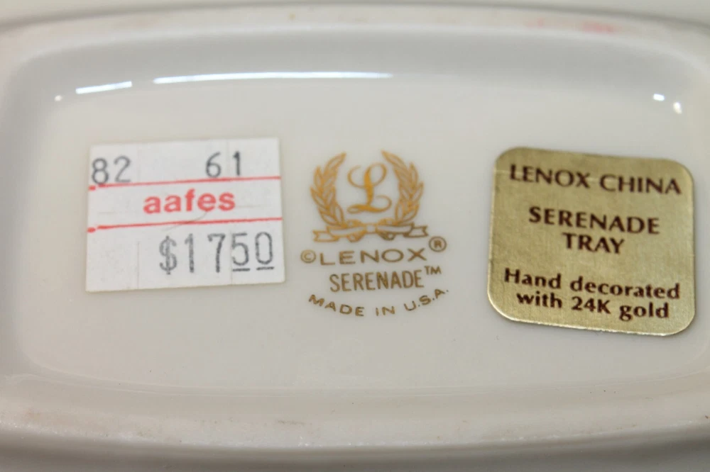 Vtg Lenox USA Hand Decorated 24K Gold Bird Flower Serenade Tray 5.25 Set of 2. They are in very good condition, no chips or cracks. Measures: 5.25" L, 4" W. They are marked and have the original stickers on the bottom. Please see photos for more details. Please note that the item is vintage and may show signs of wear. We have done our best to honestly and accurately describe and photograph the item, including possible flaws. What you see are the actual photos of the item being sold. If you have any questions regarding the item, please ask! We DO NOT SELL outside United States. SHIPPING The item will be shipped within three business days after receipt of payment. We ship via USPS to any location within the 48 continental United States, NO INTERNATIONAL SHIPPING. Shipping is calculated by EBAY based on the weight and size of the item plus packaging. We can combine shipping in case you buy multiple items that can be safely shipped together. Thanks for looking!